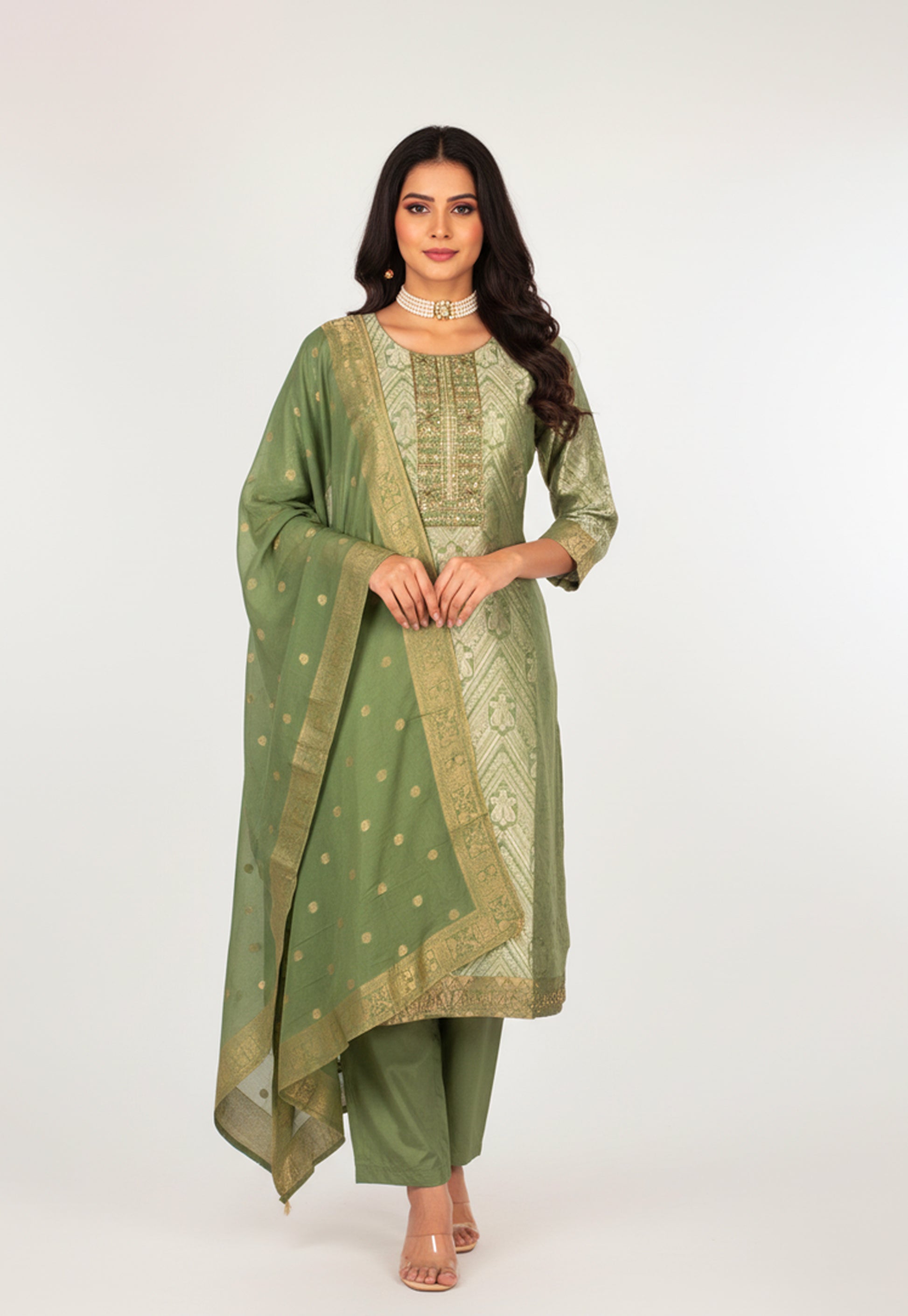 The suit is paired with matching straight pants for a structured yet comfortable look. Completing the ensemble is a coordinated dupatta adorned with woven motifs and a graceful zari border, adding depth and sophistication to the outfit. Ideal for festive gatherings, poojas, and elegant daytime celebrations, this suit set balances classic craftsmanship with modern simplicity.
