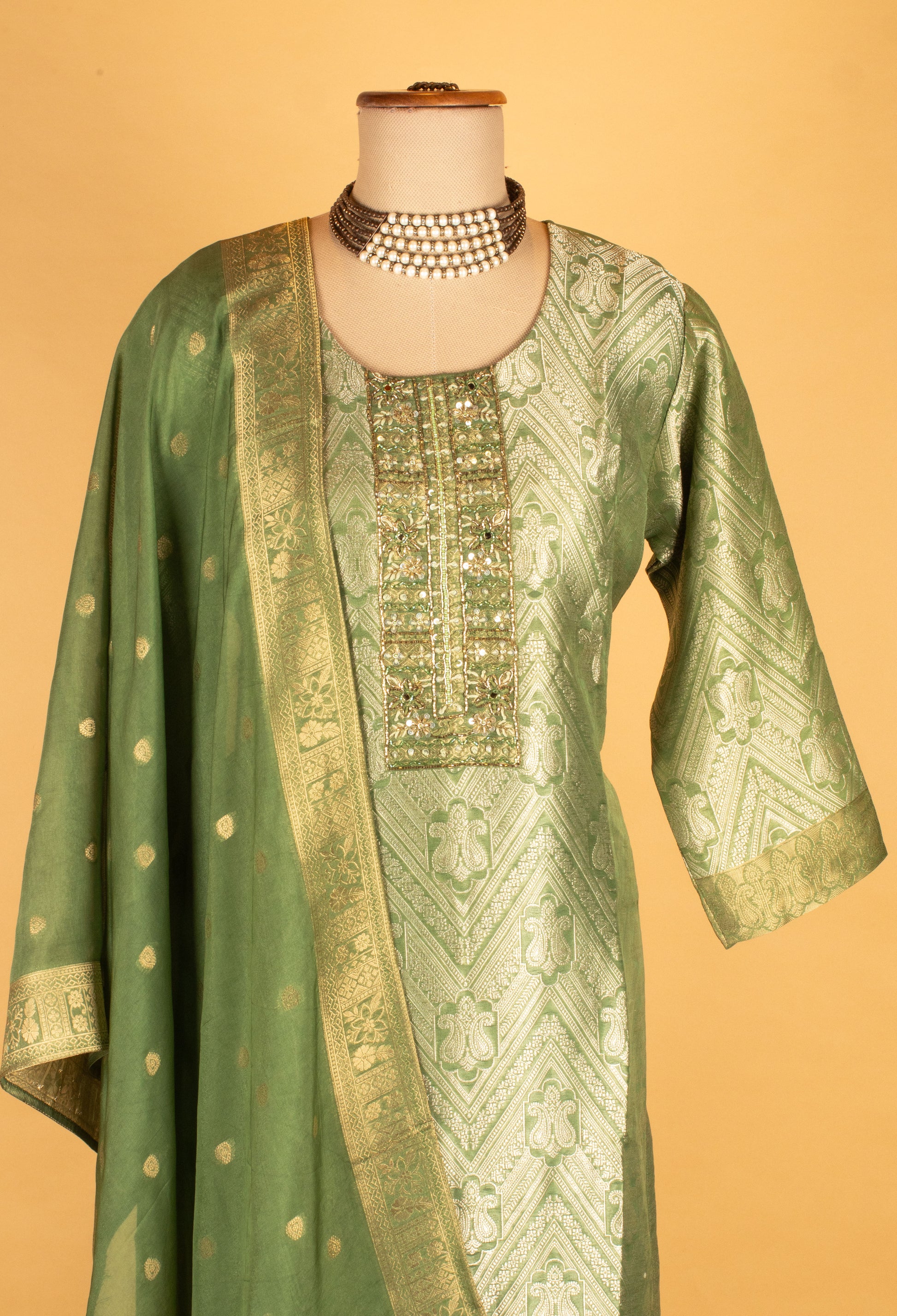 Add timeless elegance to your ethnic collection with this rich green straight-cut suit set, crafted for refined festive dressing. The kurta features an intricate woven pattern with a beautifully embellished yoke, lending a subtle sheen and traditional charm. Its straight-cut silhouette offers a clean, flattering fit that suits both formal and festive occasions.