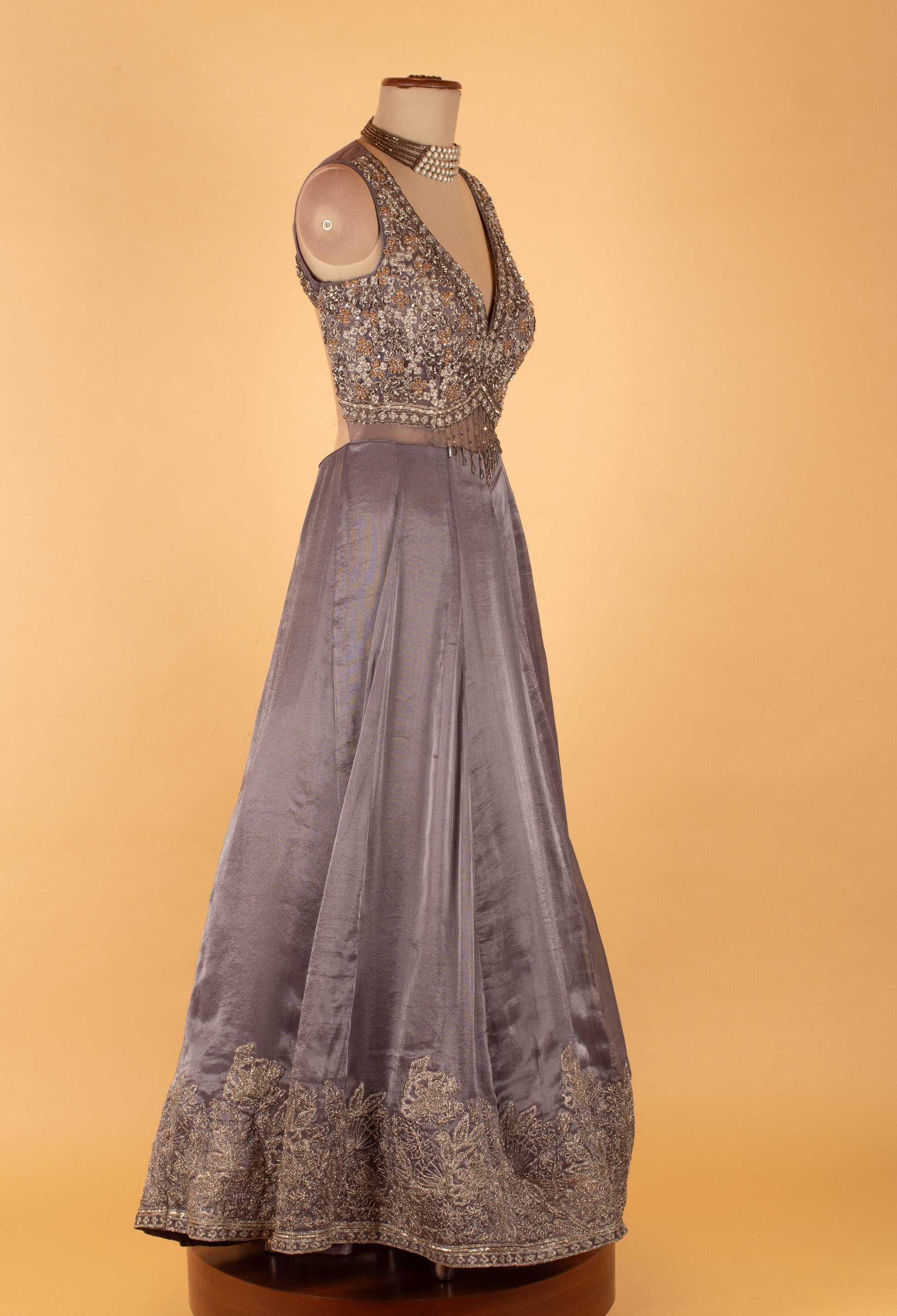 Make an unforgettable statement with this elegant grey embellished evening gown, crafted for modern celebrations and formal occasions. The gown features a beautifully structured bodice adorned with intricate beadwork, sequins, and delicate embroidery, creating a refined yet glamorous look.