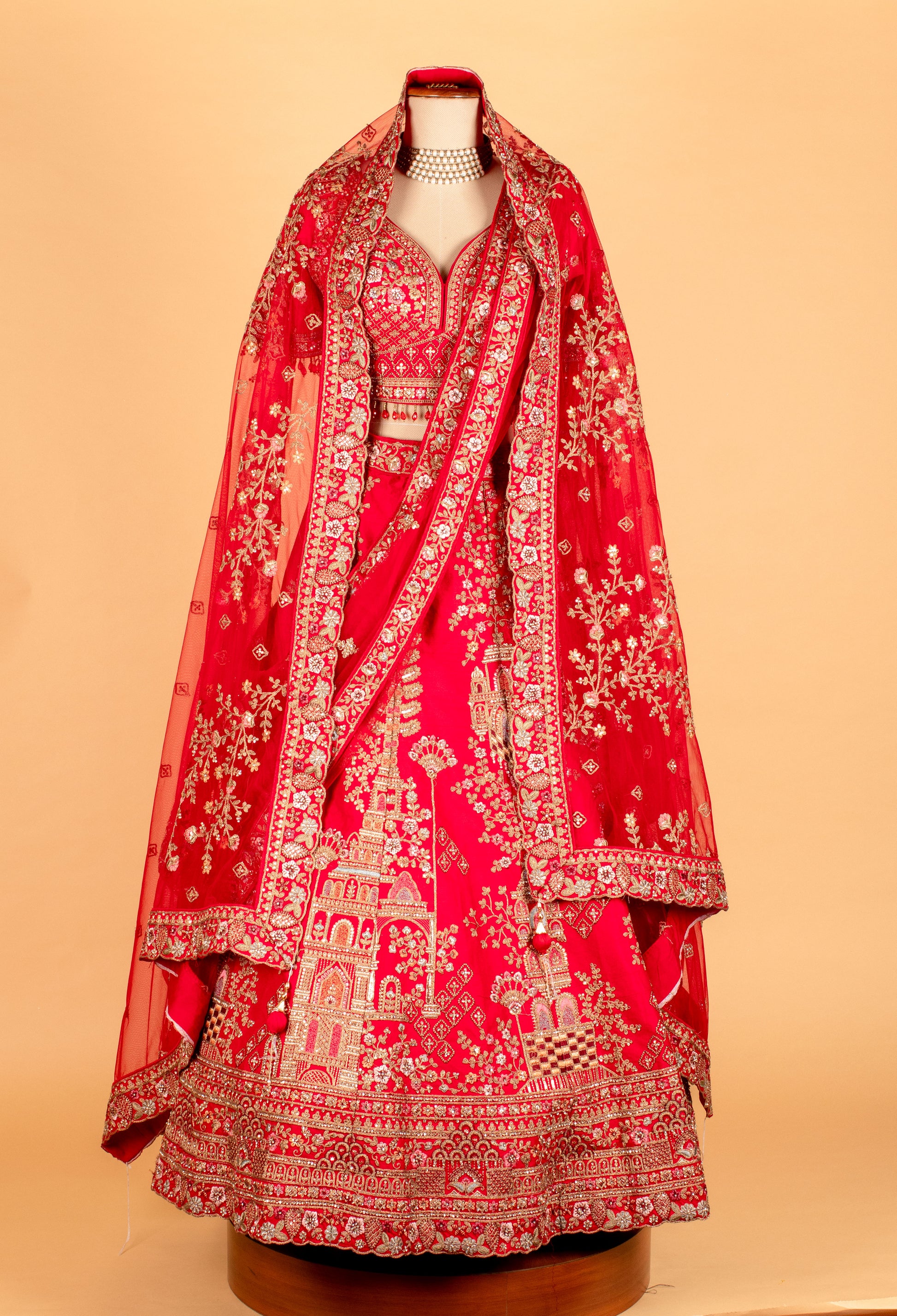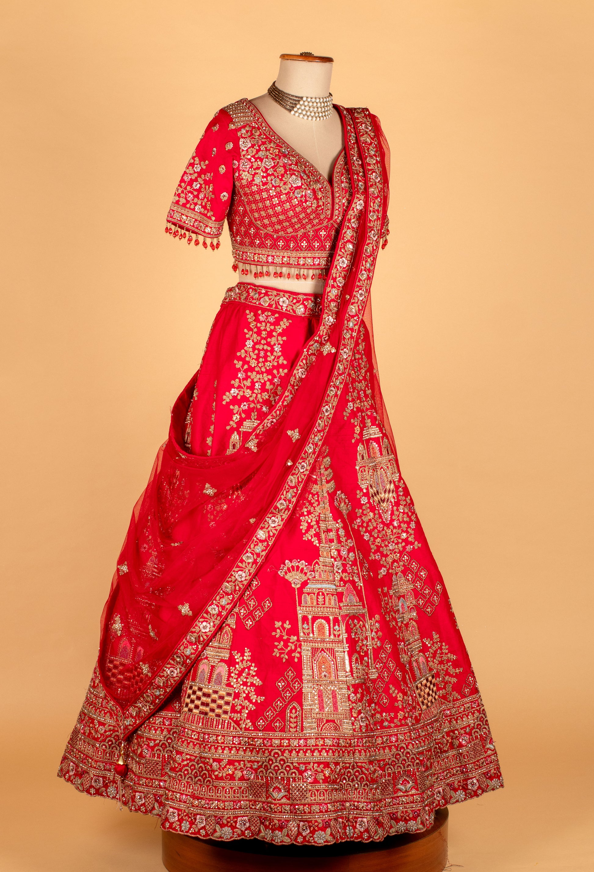 Celebrate timeless grandeur with this Heritage Red Bridal Lehenga, an extraordinary masterpiece featuring intricate architectural zari motifs inspired by temple carvings and royal palaces. The croptop blouse sits beautifully with its scalloped neckline and structured embroidery, adding a refined, regal charm.
