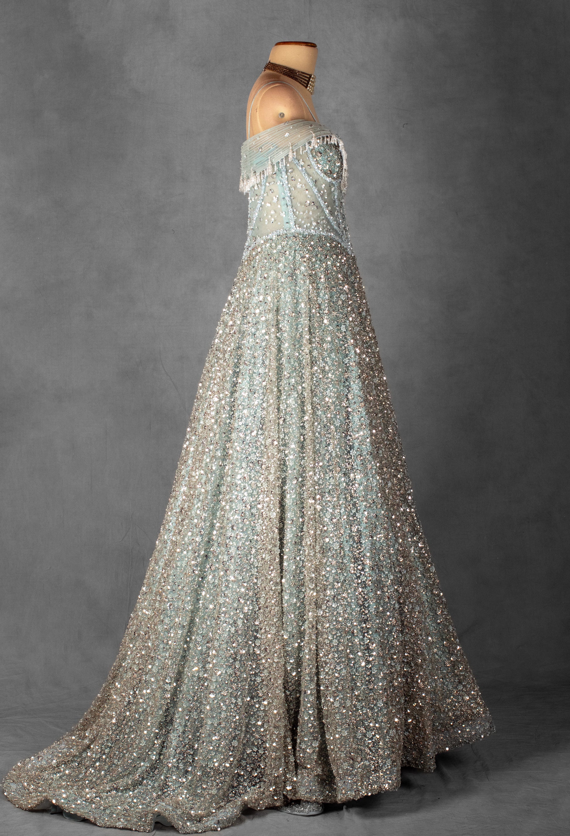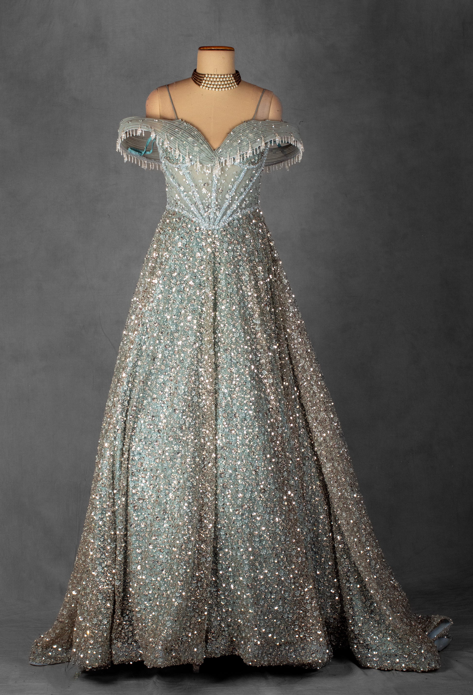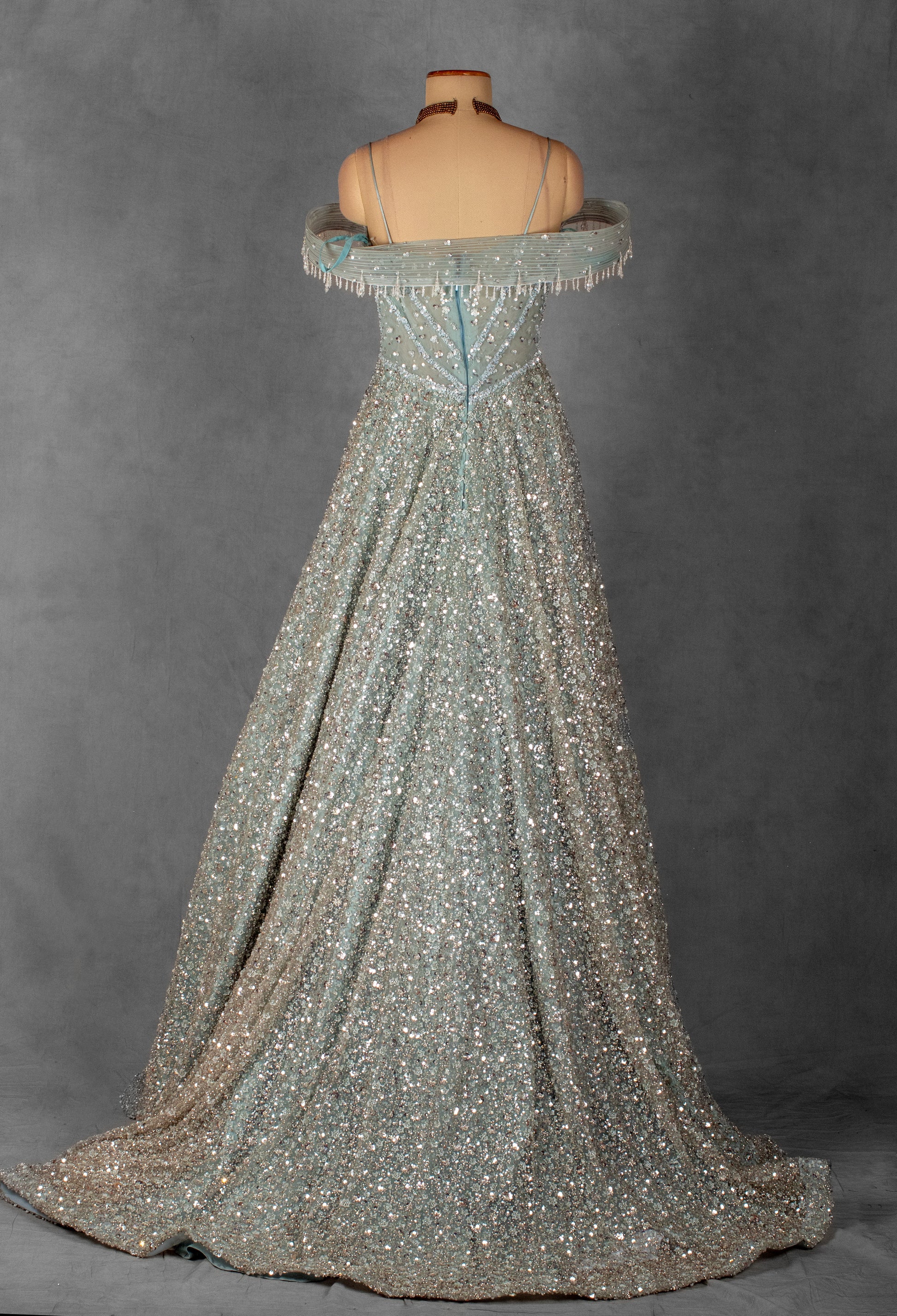 Flowing into a voluminous floor-length skirt, the gown sparkles with thousands of light-catching embellishments that reflect every movement — evoking the brilliance of starlight. The soft ice-blue hue adds a dreamy, regal charm, making it the perfect ensemble for receptions, evening galas, and destination celebrations.