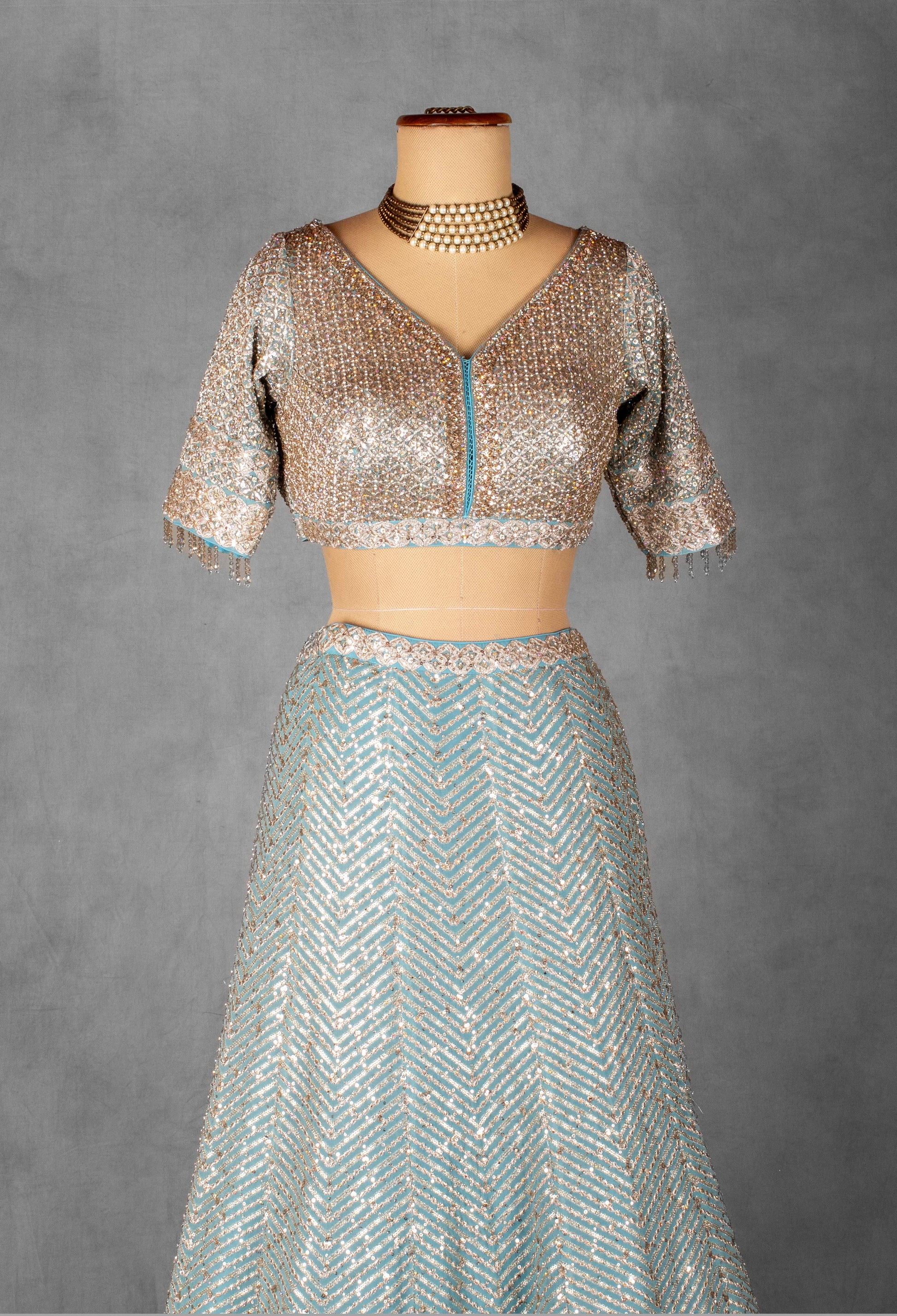 Radiate modern elegance with this Ice Blue Embroidered Lehenga Set, a perfect blend of soft pastels and luxurious shimmer. The lehenga features exquisite all-over sequin and threadwork embroidery, arranged in refined chevron and scalloped patterns, giving the outfit a graceful, contemporary appeal. The intricate border enhances the flare, creating a beautifully balanced silhouette ideal for both day and evening celebrations.