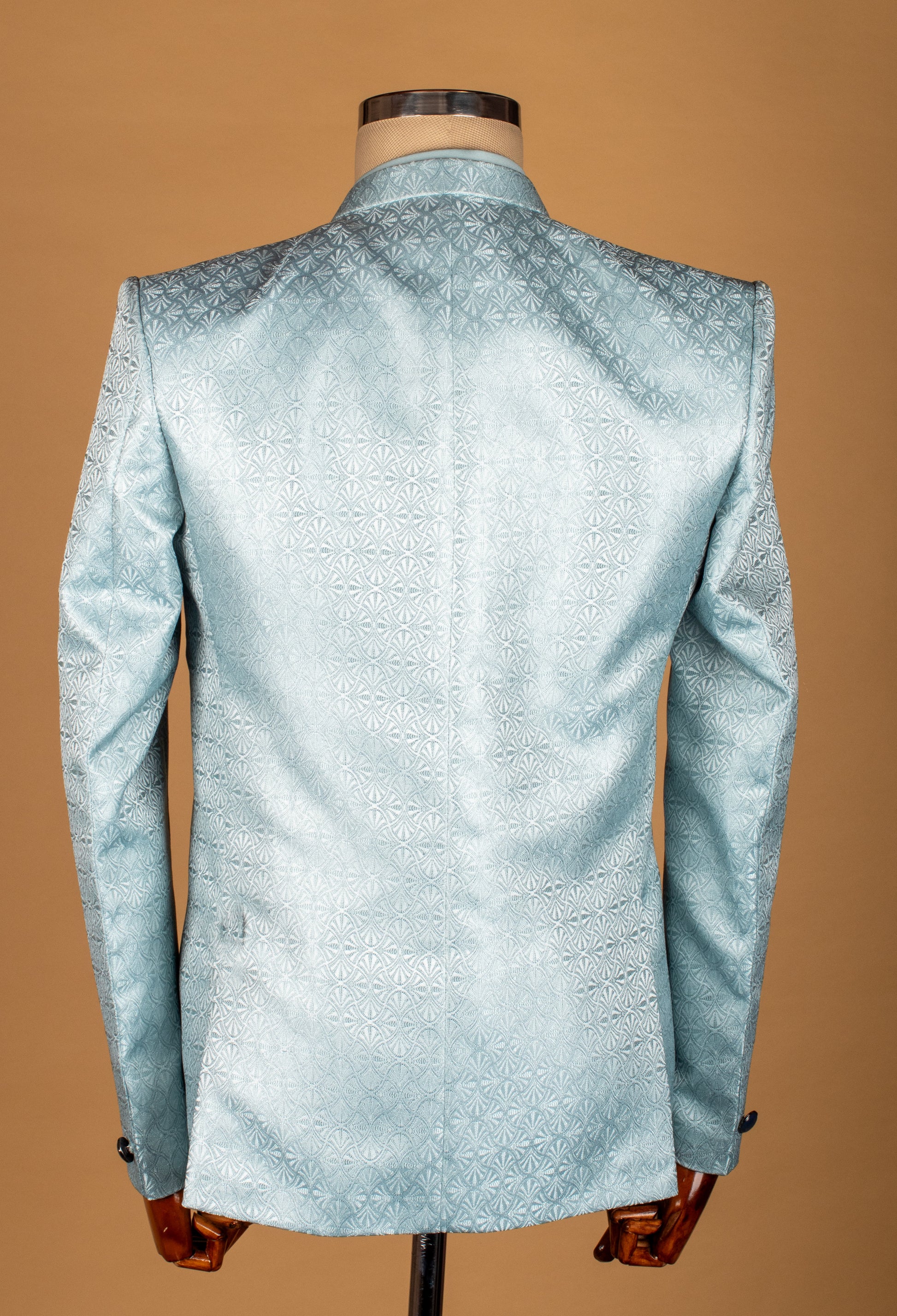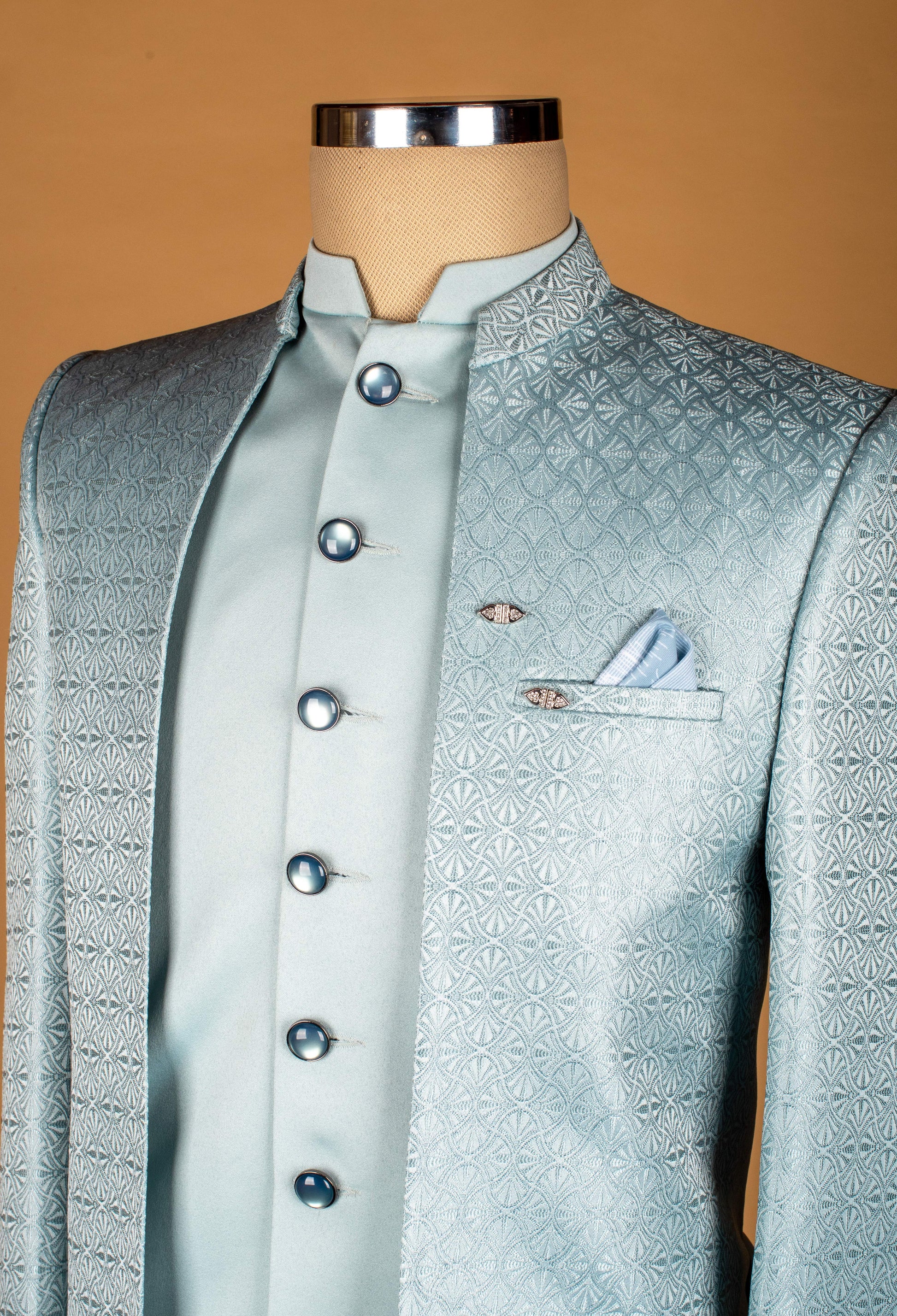 Expertly tailored from premium jacquard suiting fabric, this bandhgala features a subtle geometric texture that catches the light beautifully, adding depth and dimension to its serene ice-blue hue. The smooth satin placket, statement metallic buttons, and matching pocket square enhance its regal charm, making it the perfect ensemble for weddings, festive occasions, and evening events.