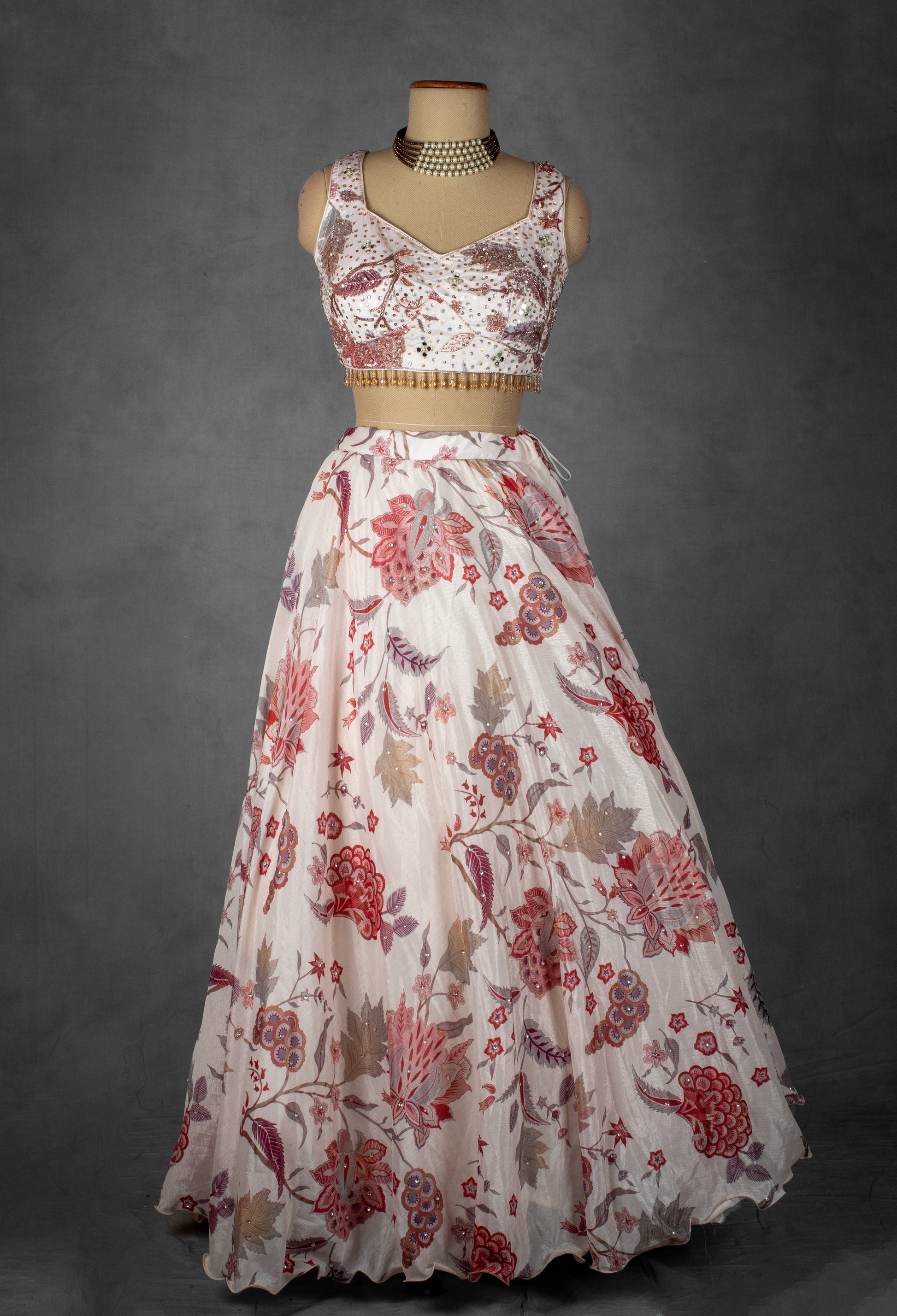 The ensemble features an ivory silk base lehenga adorned with hand-painted-inspired floral prints in shades of blush, rose, and mauve, highlighted with subtle sequins for a gentle shimmer. The sleeveless blouse is intricately embroidered with beads, cutdana, and mirror accents, adding texture and glamour to the modern silhouette.