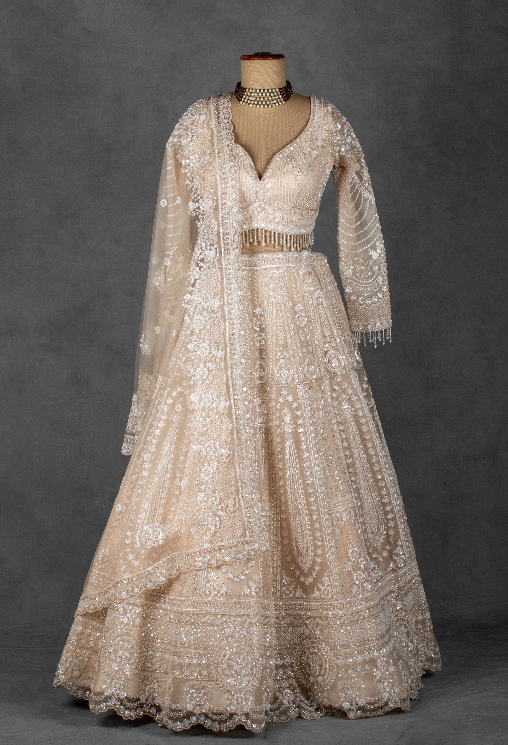 The delicately structured blouse, detailed with beaded tassels and full sleeves, adds sophistication, while the soft net dupatta cascades gracefully, adorned with floral and geometric motifs. The rich ivory tone embodies purity, elegance, and luxury — making it the perfect choice for reception, engagement, or destination weddings.