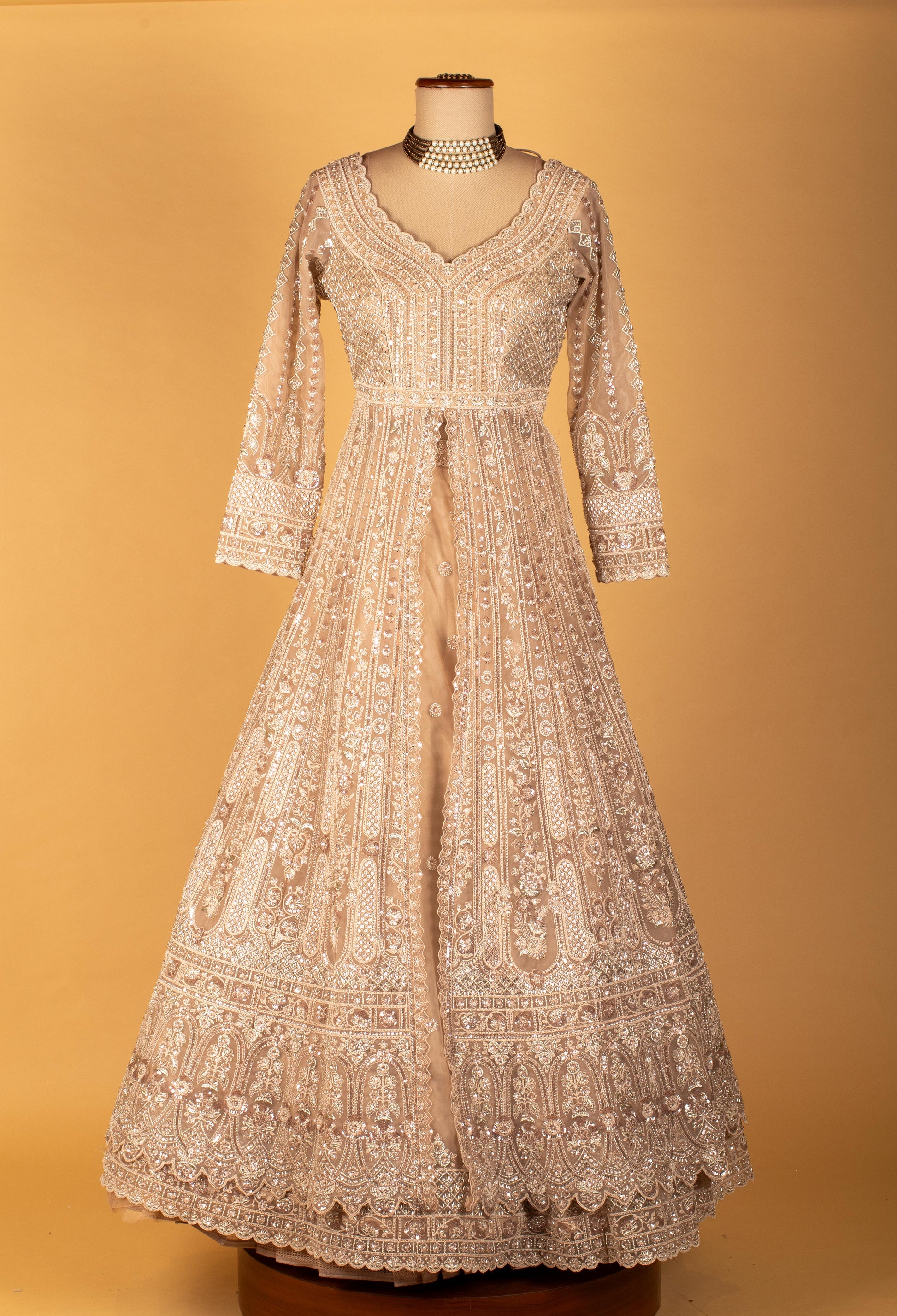 Grace every celebration with unmatched elegance in this breathtaking ivory heavy embroidered Anarkali gown, a perfect fusion of luxury craftsmanship and timeless charm. Designed on premium soft net fabric, the gown features intricate thread work, shimmering sequins, and stunning 3D floral appliqué detailing that elevates the entire silhouette with a couture-like finish.
