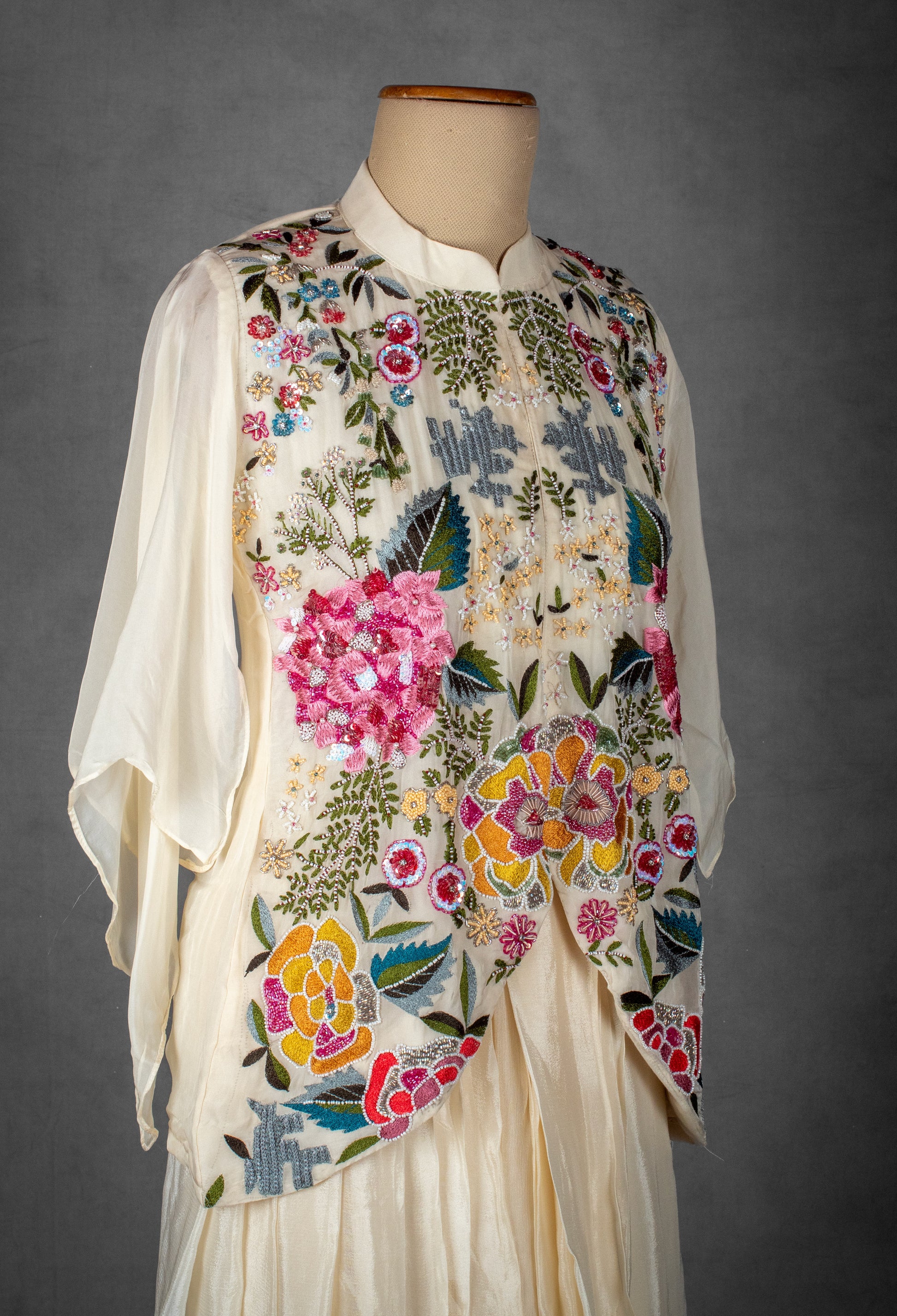 The flowing ivory dress, crafted from soft organza-satin, features an asymmetrical layered silhouette that moves gracefully with every step. The highlight of this ensemble is the vibrant embroidered jacket, intricately adorned with floral motifs in resham, zari, and beadwork, adding a touch of color and craftsmanship to the neutral base.