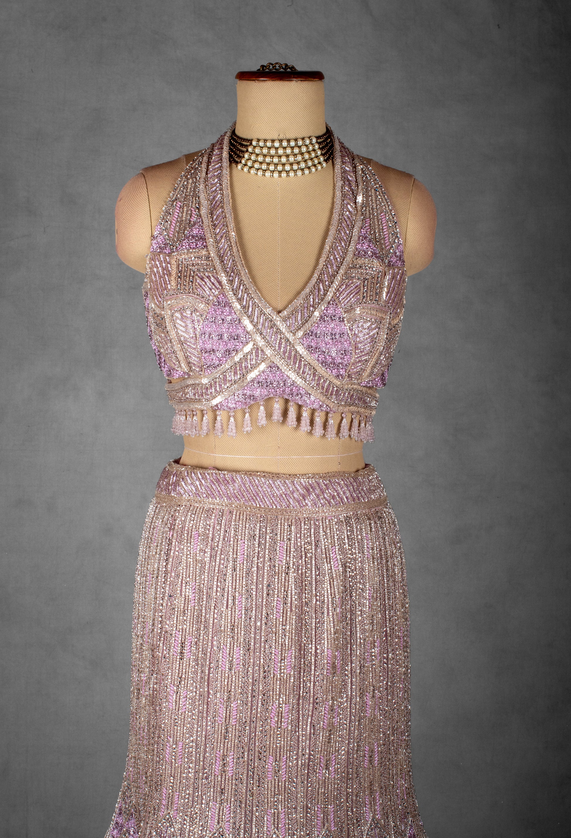 Elevate your festive style with this exquisite lavender embellished crop top lehenga set, designed to blend contemporary glamour with traditional craftsmanship. The heavily embroidered crop top features intricate sequin and bead detailing, accentuating the neckline and hem with elegant tassel highlights for a modern yet regal look.
