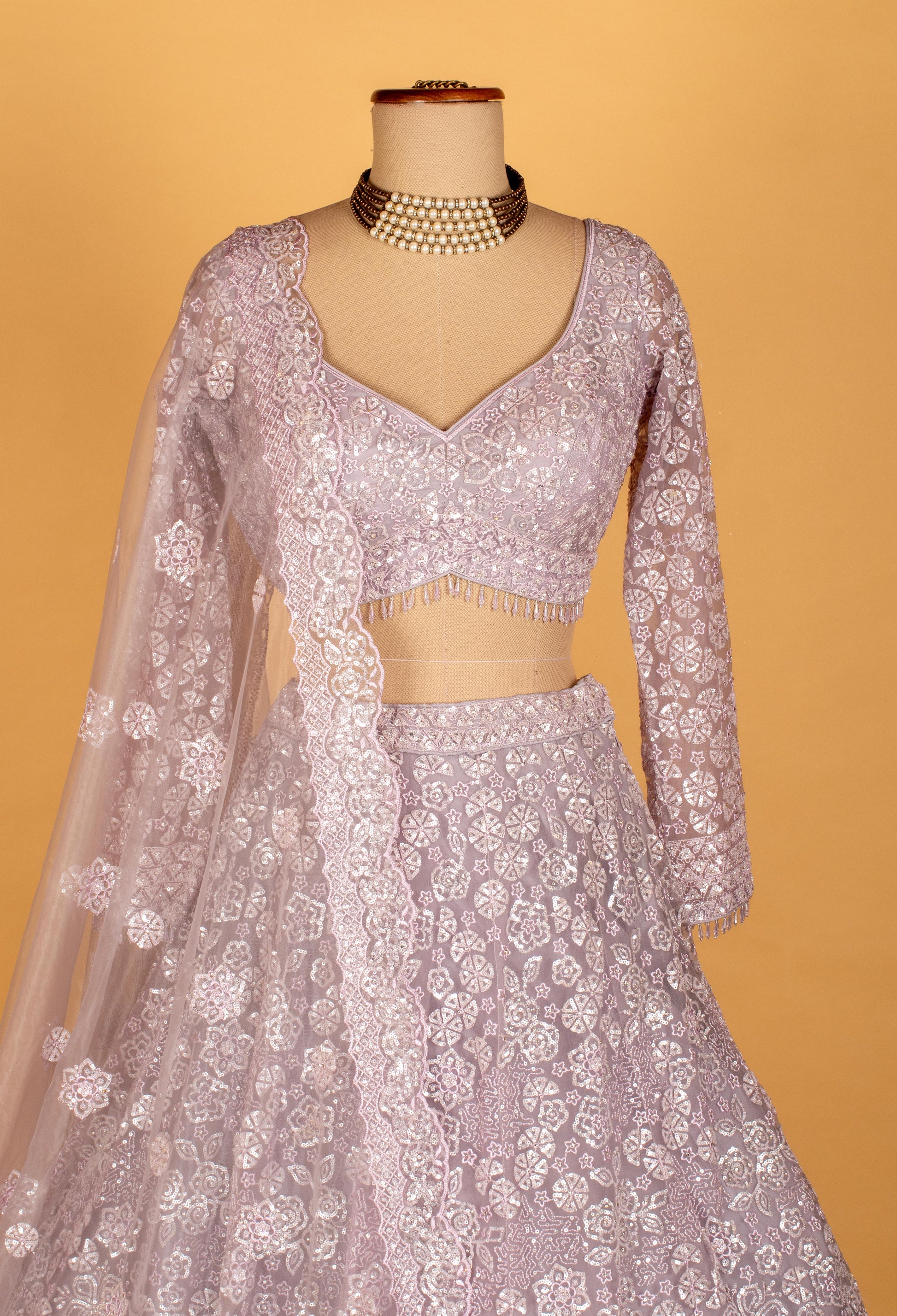 Step into elegance with this stunning lavender croptop lehenga set, a perfect blend of delicate artistry and modern glamour. The outfit features an intricately embroidered long-sleeve croptop embellished with all-over threadwork, floral motifs, and shimmering sequins that add a luxurious sparkle to every movement.