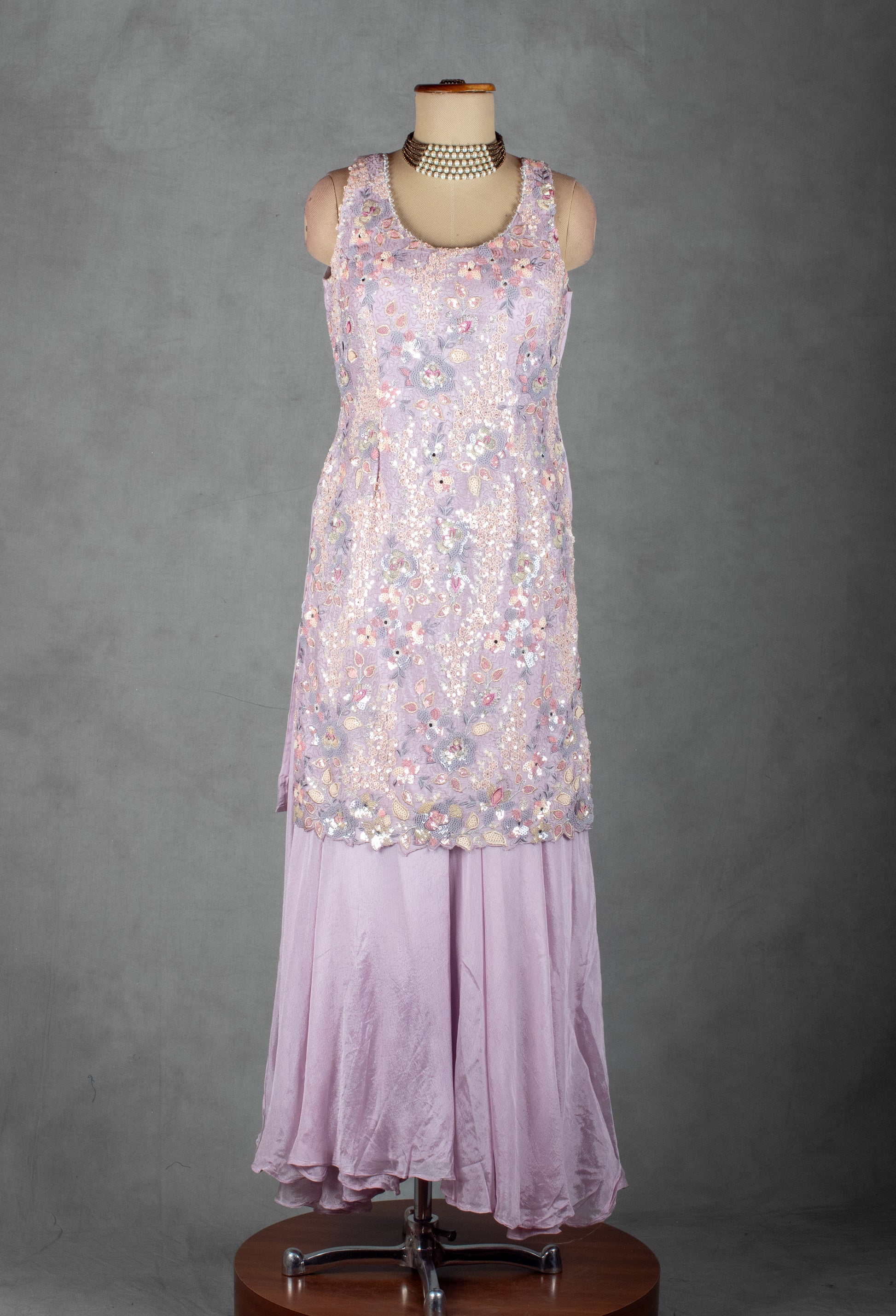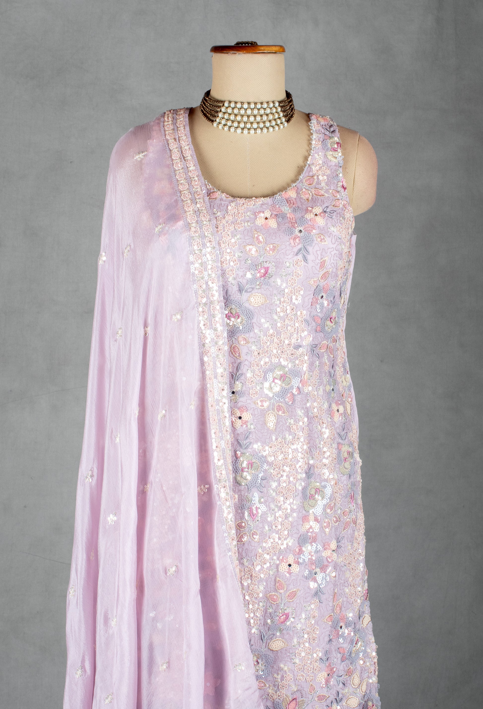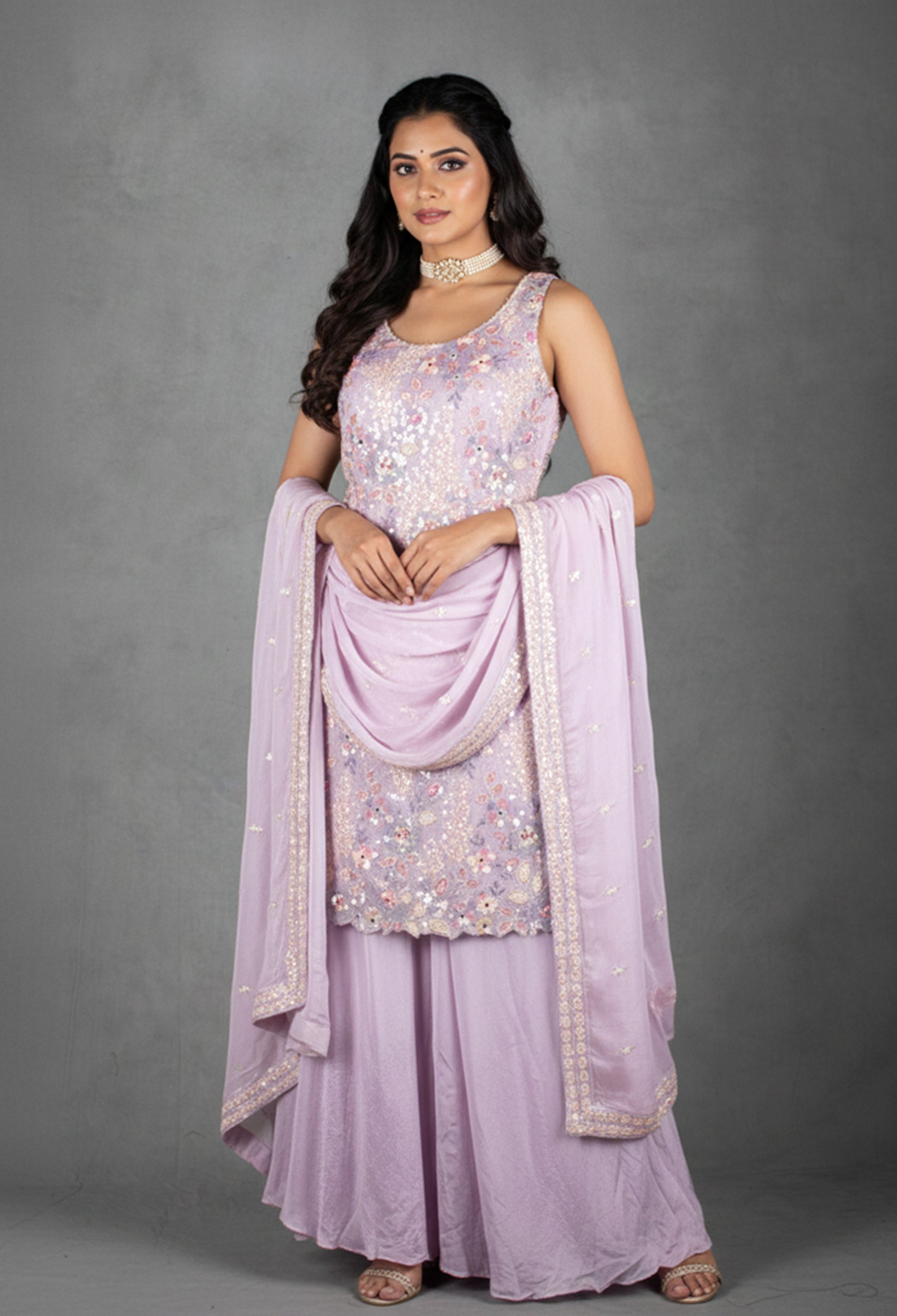 Step into soft elegance with this Lavender Kurta Sharara Set, crafted in soothing pastel tones and embellished with delicate artistry. The sleeveless kurta features intricate sequin, thread, and multi-color floral embroidery, adding a subtle sparkle while maintaining a graceful, lightweight feel. Its flattering silhouette flows beautifully, making it perfect for both daytime and evening celebrations.