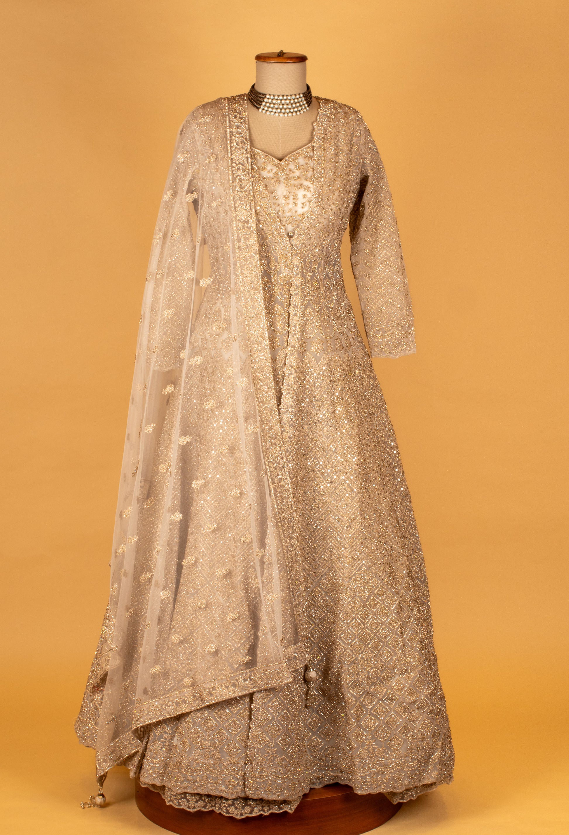 Elevate your bridal elegance with this exquisite Golden Full-Sleeve Anarkali, crafted with intricate hand-embroidered detailing and all-over shimmering sequin work. The outfit features a richly embellished bodice, delicate floral motifs, and a fully flared skirt that adds graceful movement to every step.