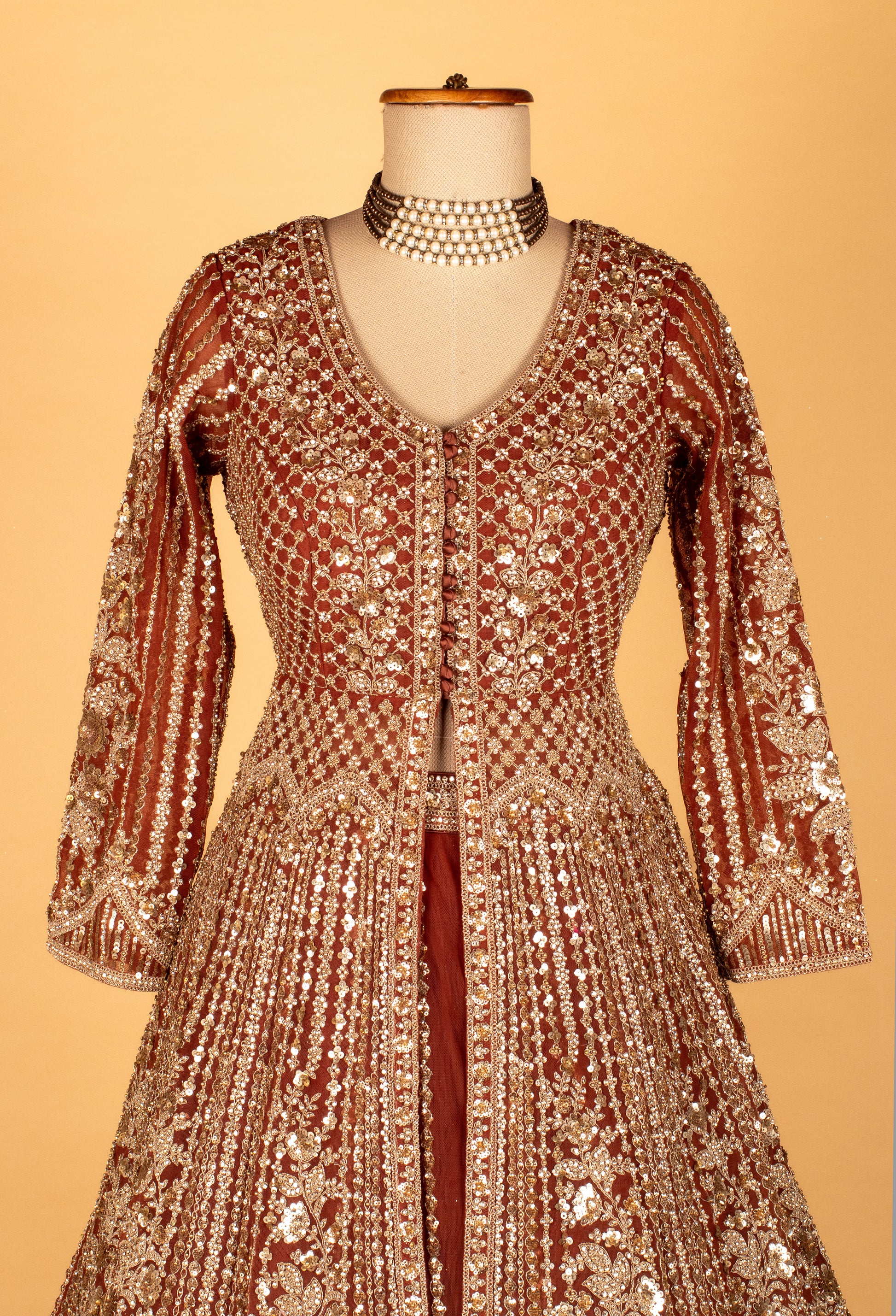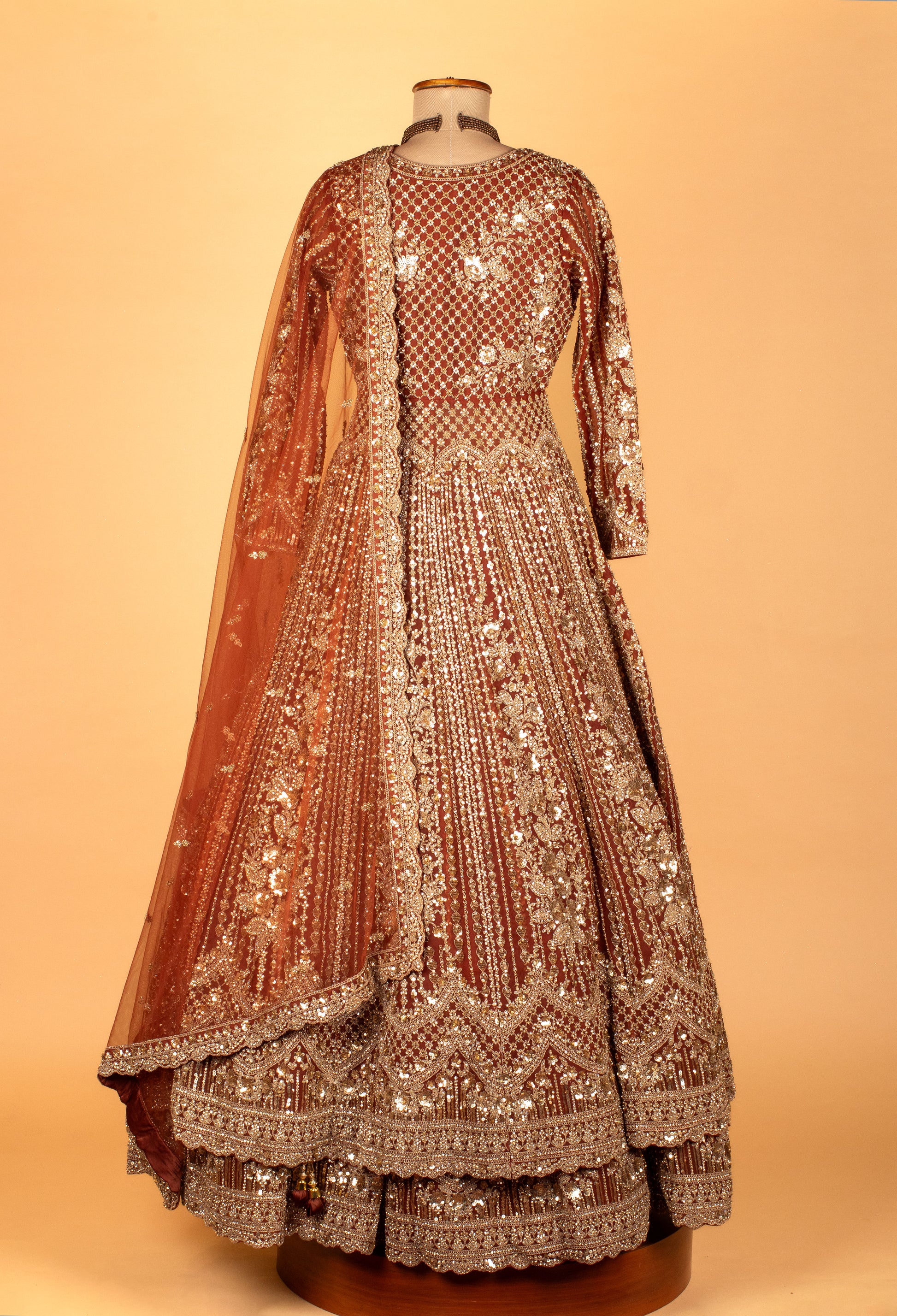 Radiate royal elegance with this luxurious maroon wine Anarkali gown, crafted for grand wedding functions and premium festive occasions. This masterpiece features an all-over embroidered design with sequins, zari, beads, and intricate threadwork that creates a rich, dimensional shine.