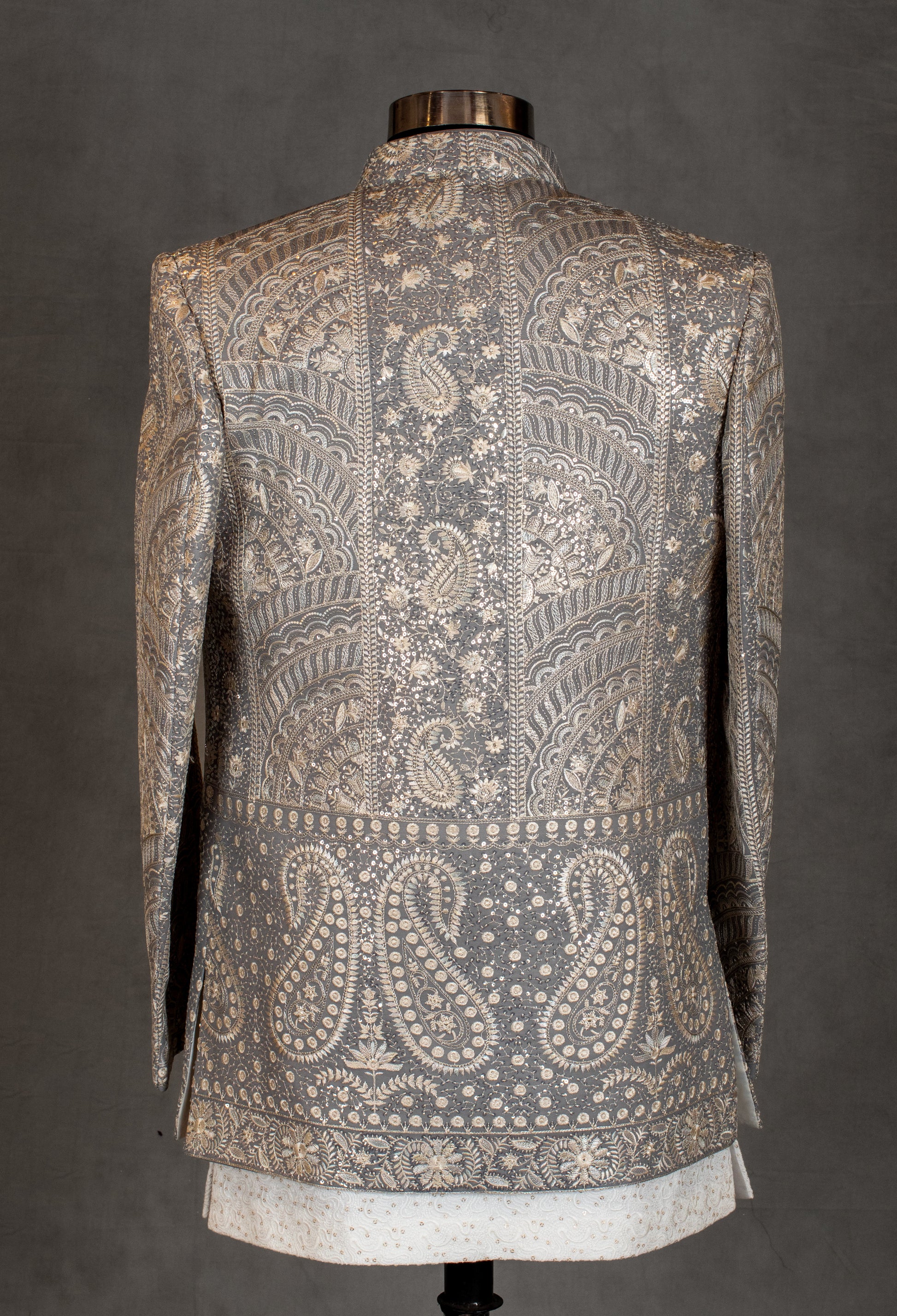 Made from premium quality fabric, it features a detailed metallic threadwork design, complemented with delicate sequin embellishments. The subtle ivory undertone paired with the silver jacket enhances its royal appeal, making it the perfect attire for grooms and groomsmen.