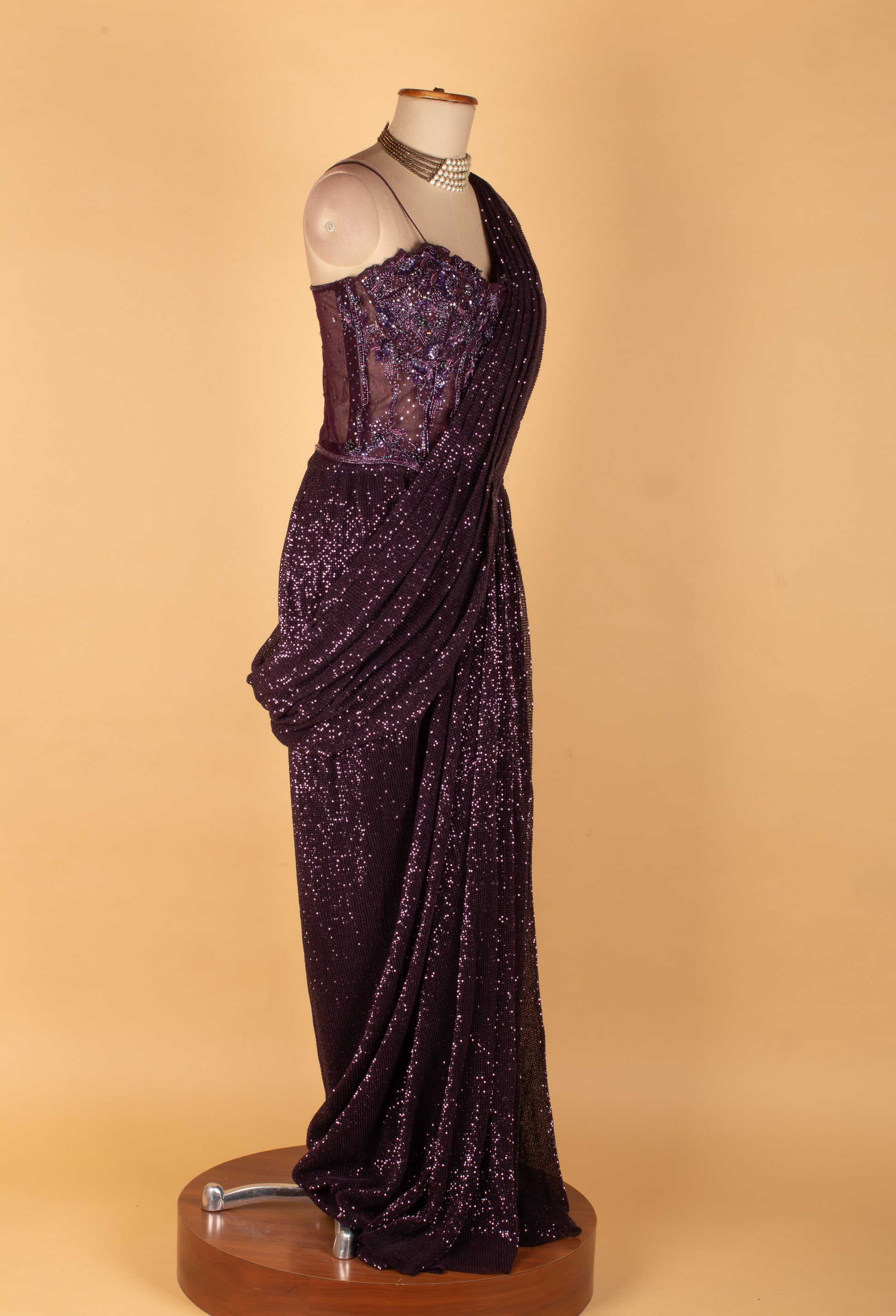 Make a striking statement with this luxury wine purple sequin saree, crafted for glamorous evenings and grand celebrations. Designed in a rich, deep-toned fabric, the saree is fully adorned with shimmering sequins that reflect light beautifully, creating an elegant and sophisticated look.