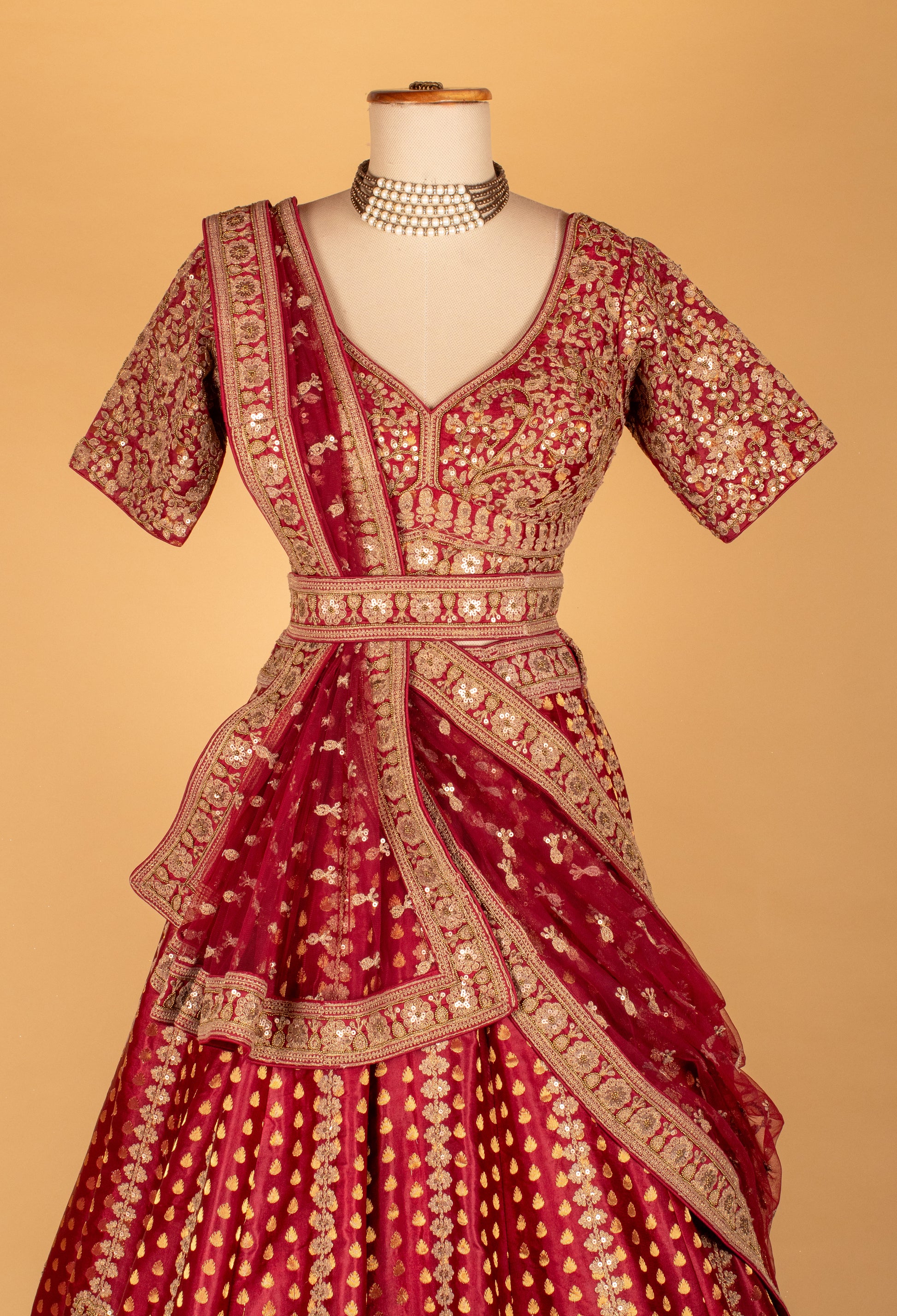 Regal, timeless, and crafted with exceptional precision — this maroon bridal lehenga set embodies the richness of traditional Indian craftsmanship. The V-neck blouse is adorned with delicate zardosi, resham, and mirror accents, paired with a beautifully contoured shape that enhances the bridal silhouette.