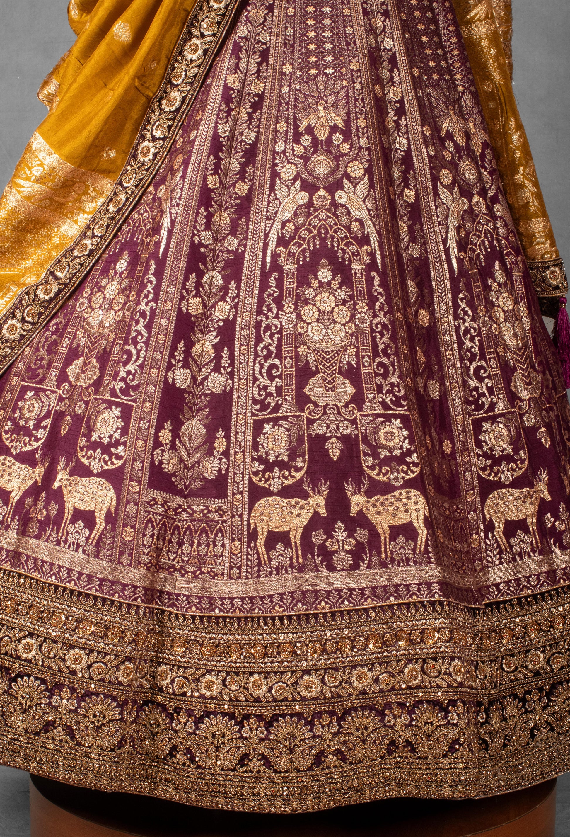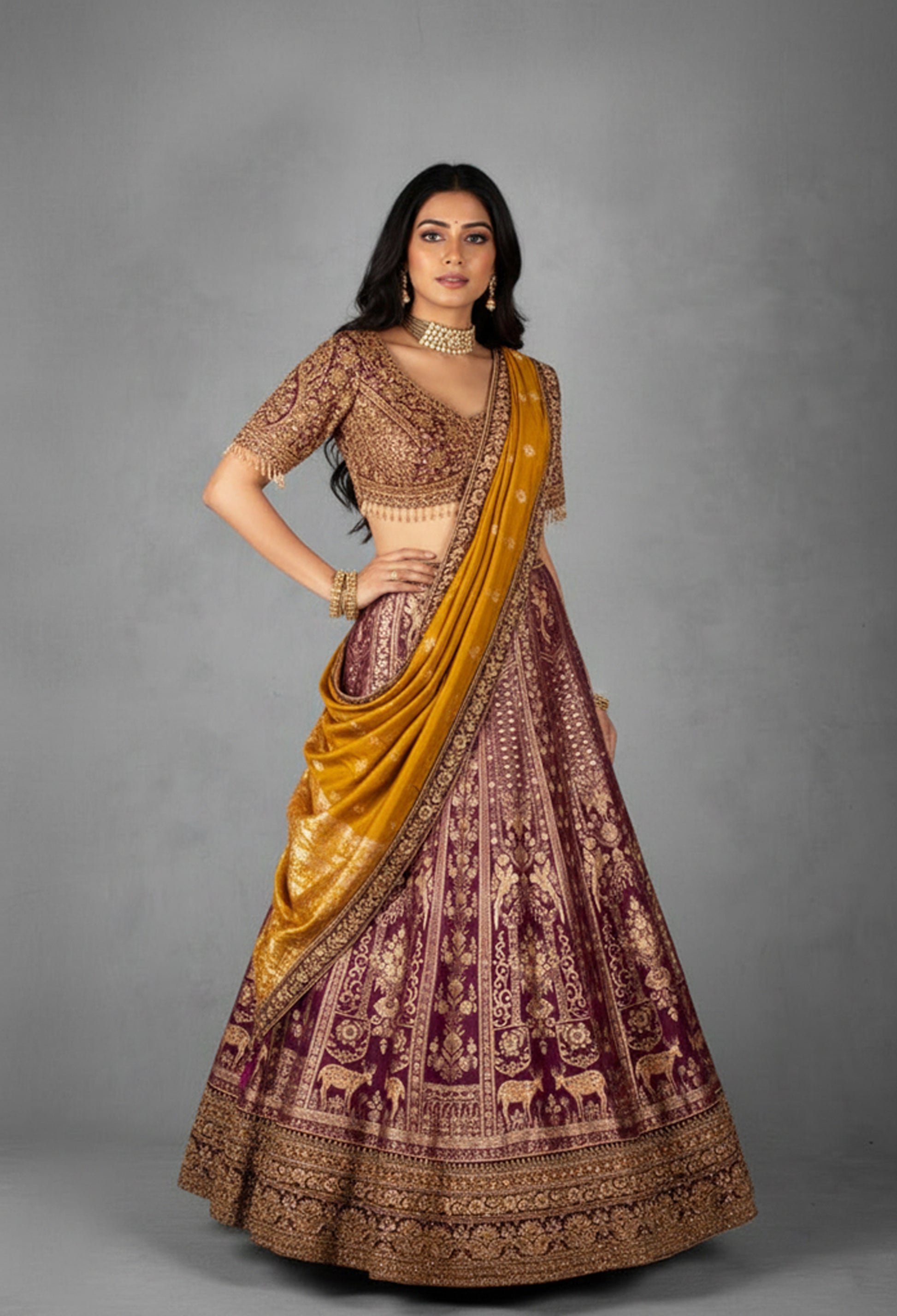 Embrace regal grandeur with this Maroon & Mustard Velvet Bridal Lehenga Set, a masterpiece that celebrates traditional craftsmanship and royal aesthetics. The flared maroon lehenga is exquisitely adorned with intricate zardosi, resham, and zari embroidery, featuring heritage-inspired motifs including floral vines, temple patterns, and majestic animal figures—giving the ensemble a timeless, royal charm.