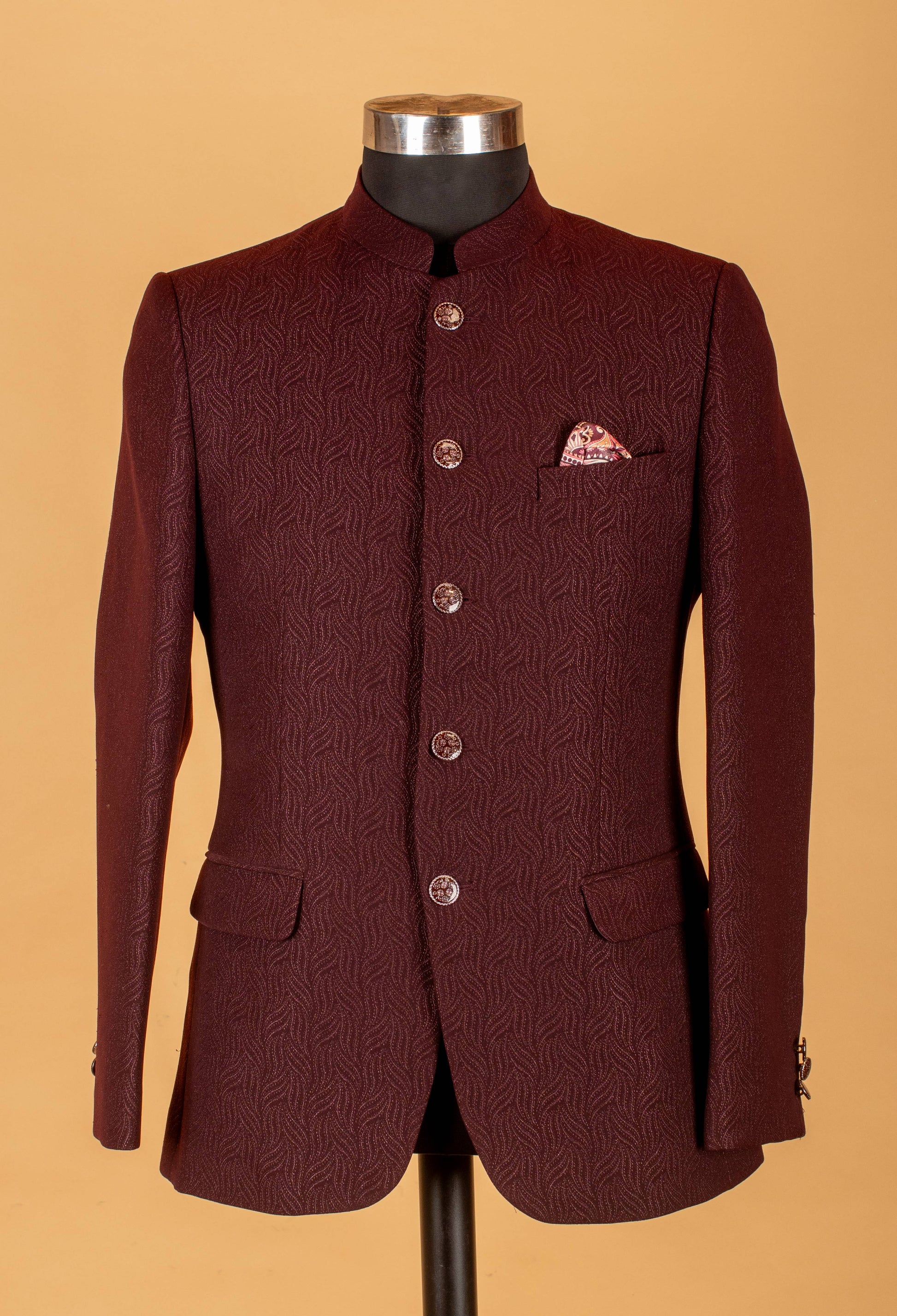 Exude royal charm and refined style with this maroon textured Bandhgala blazer — crafted for men who appreciate elegant ethnic fashion with a modern twist. The rich woven fabric features a subtle pattern, while the classic Mandarin collar adds a bold regal touch.