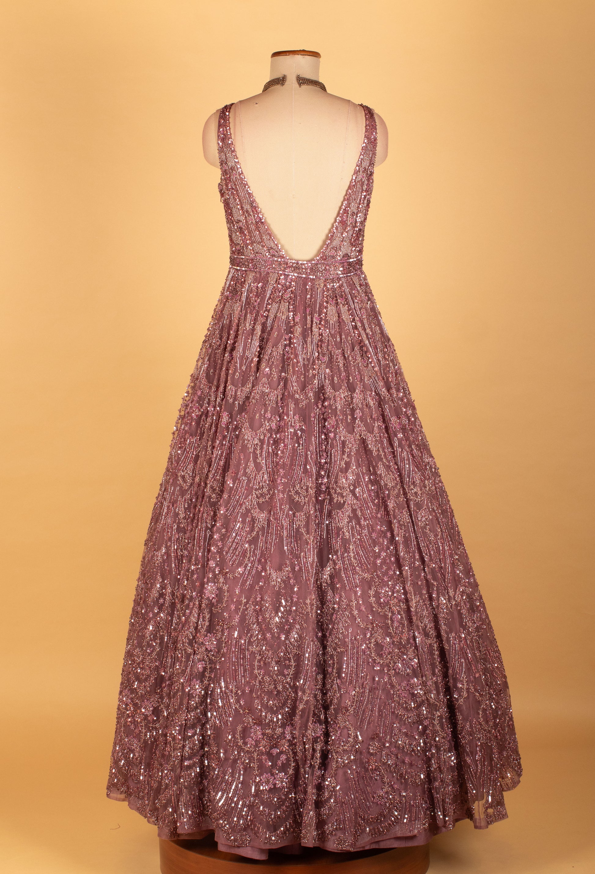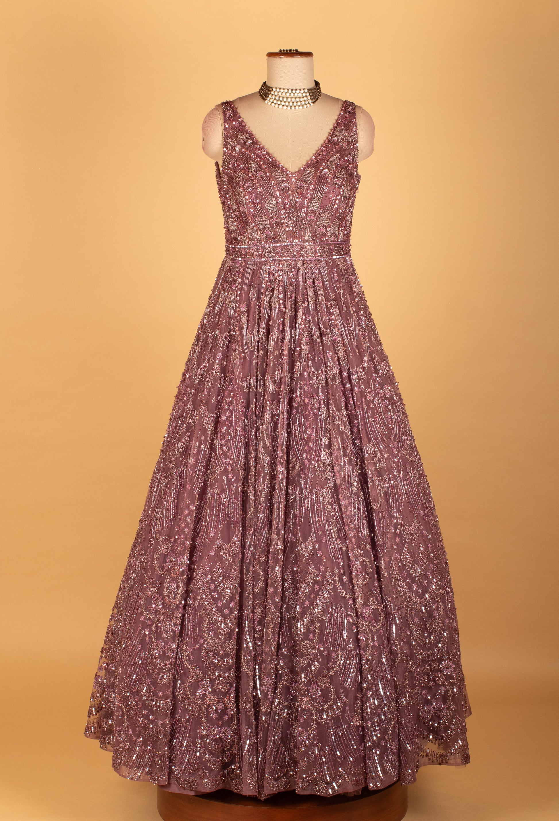 Elevate your occasion wear wardrobe with this exquisite mauve embellished net gown, designed to deliver effortless elegance and refined glamour. The gown features a beautifully structured bodice with intricate sequin and thread embroidery arranged in elegant patterns, creating a rich texture and a flattering V-neck silhouette.