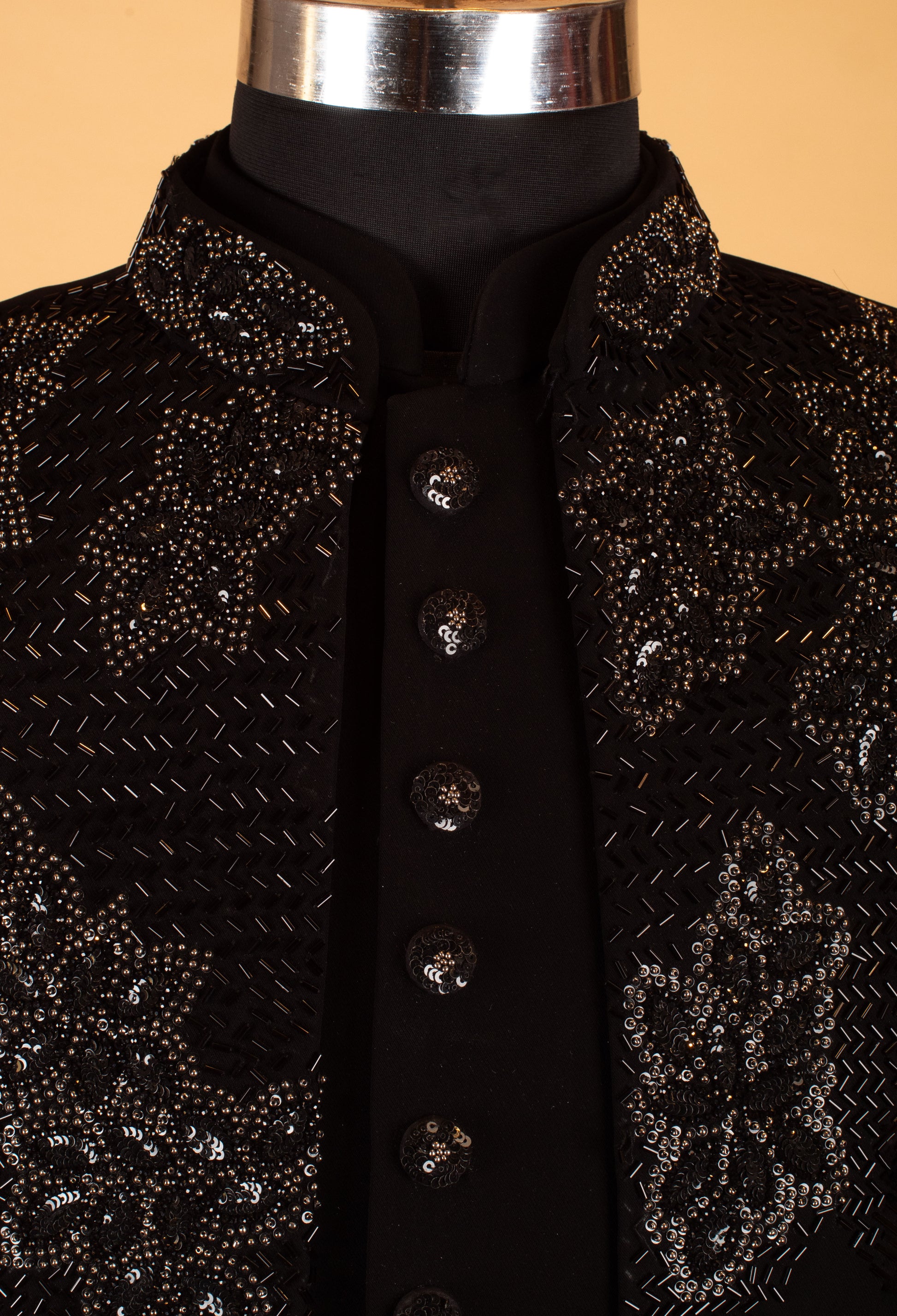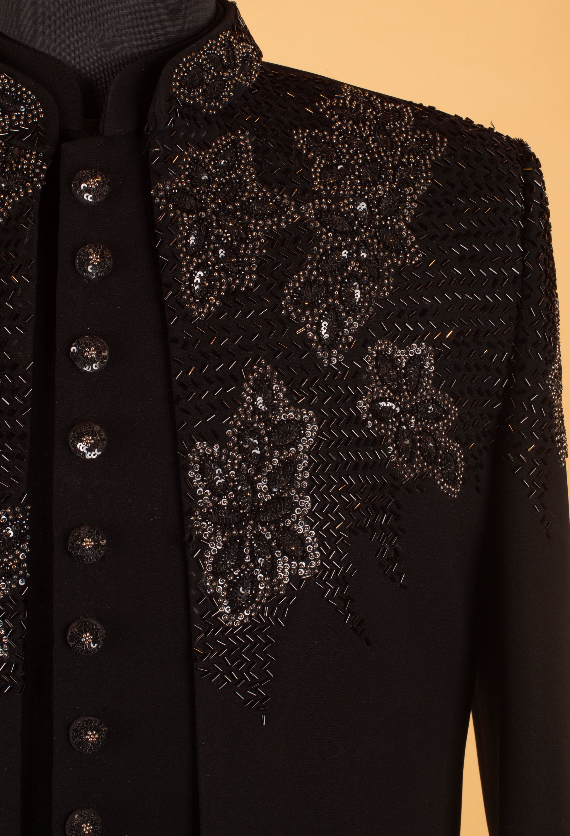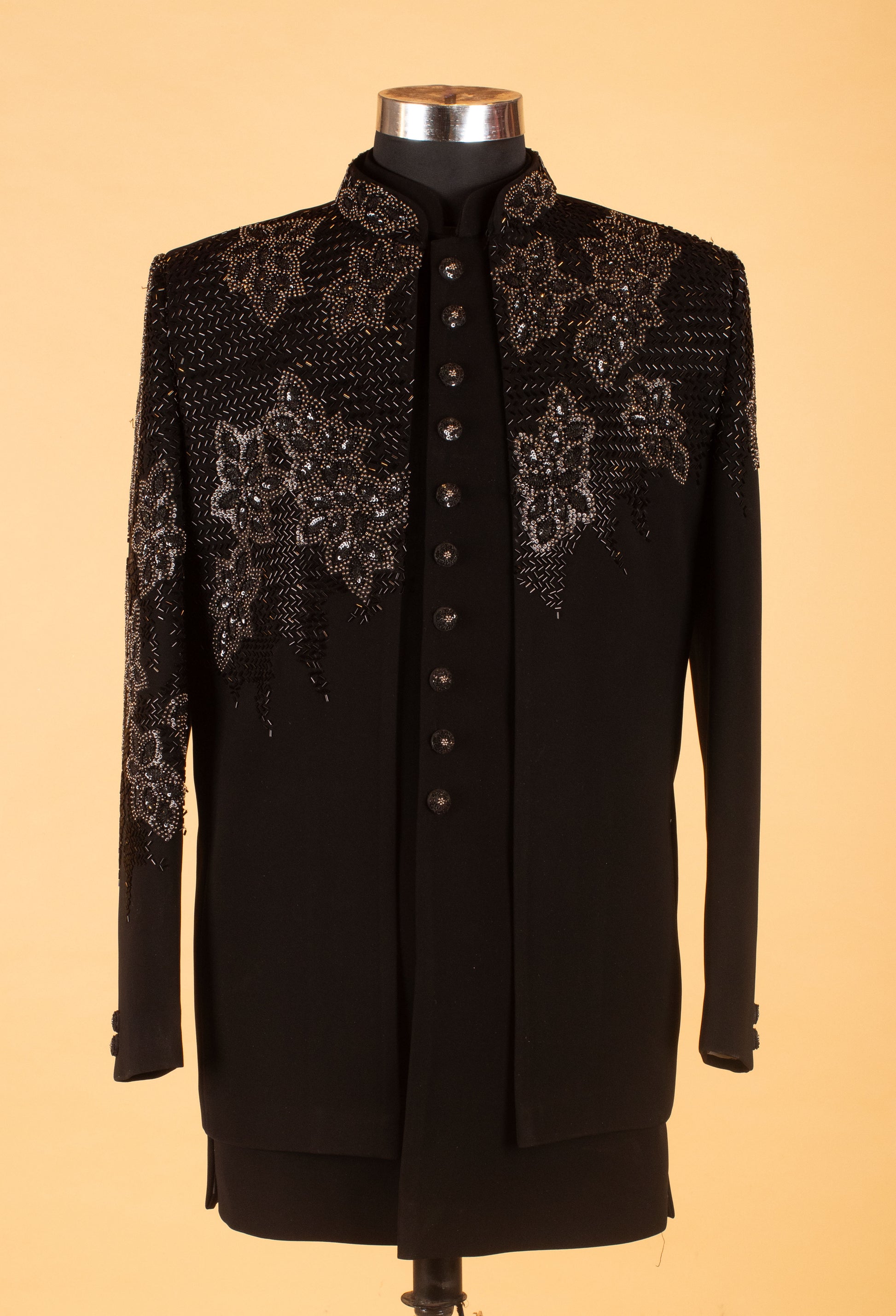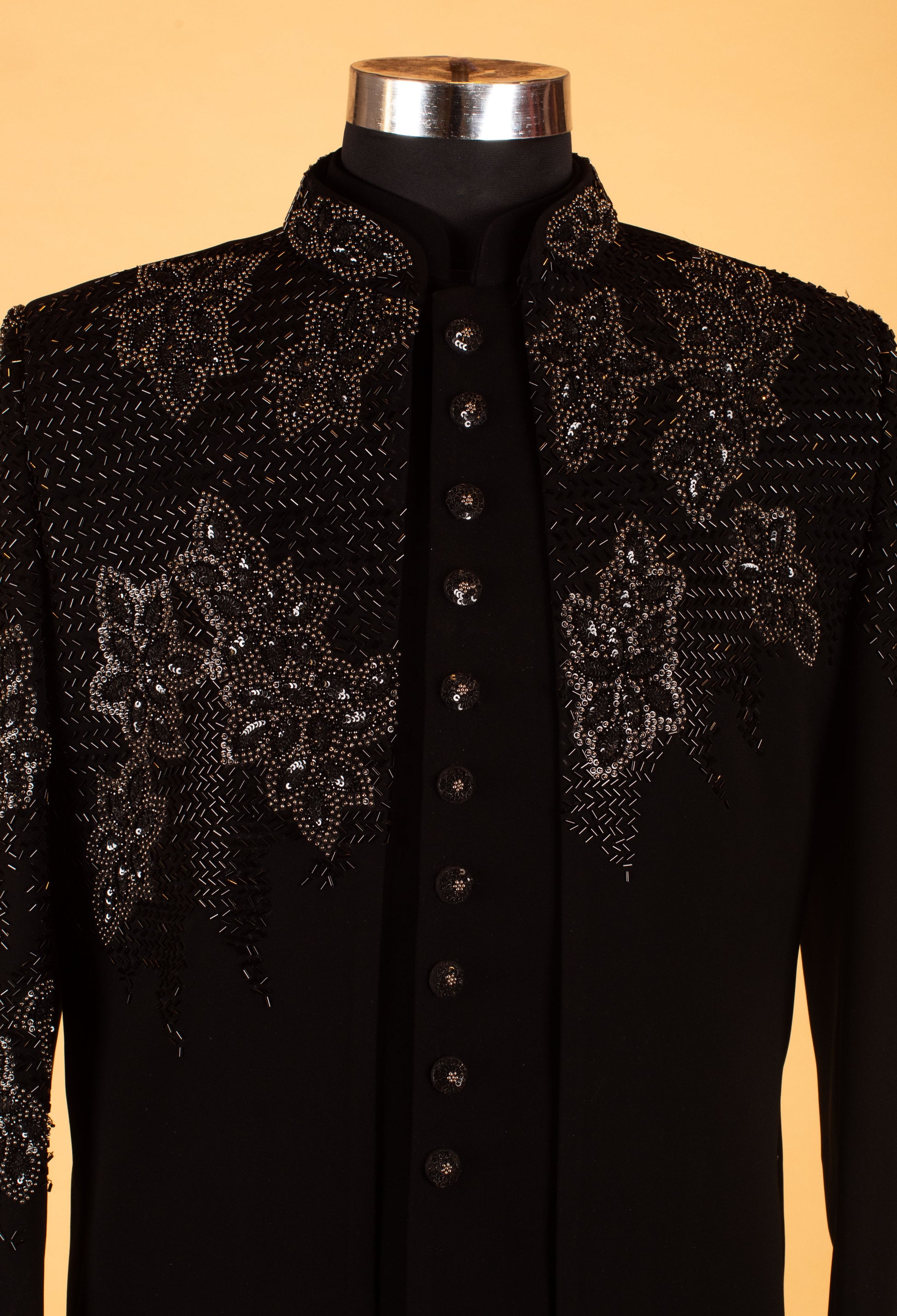 Command attention with this luxurious black designer sherwani jacket, crafted to deliver a powerful and elegant evening look. The upper section features detailed embroidery combined with intricate bead and sequin embellishments, creating a rich, textured visual appeal that stands out beautifully under event lighting.
