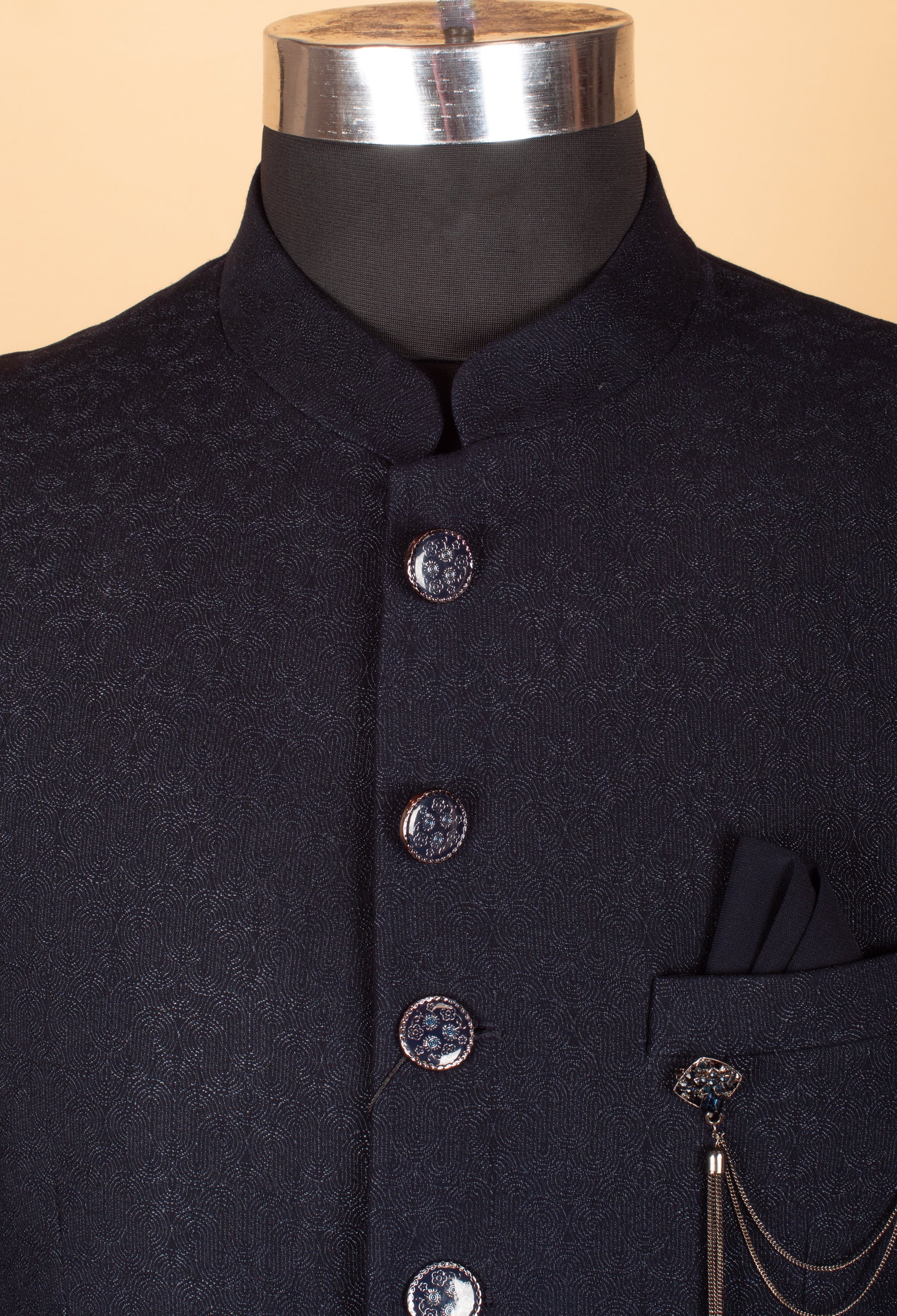 The tailored silhouette is complemented by a classic mandarin collar and a row of metallic statement buttons, delivering a sharp, contemporary finish. A stylish pocket chain accent enhances the overall design, making this suit ideal for weddings, receptions, cocktail evenings, and upscale celebrations. Comfortable yet structured, it offers an impeccable fit with a polished appearance.