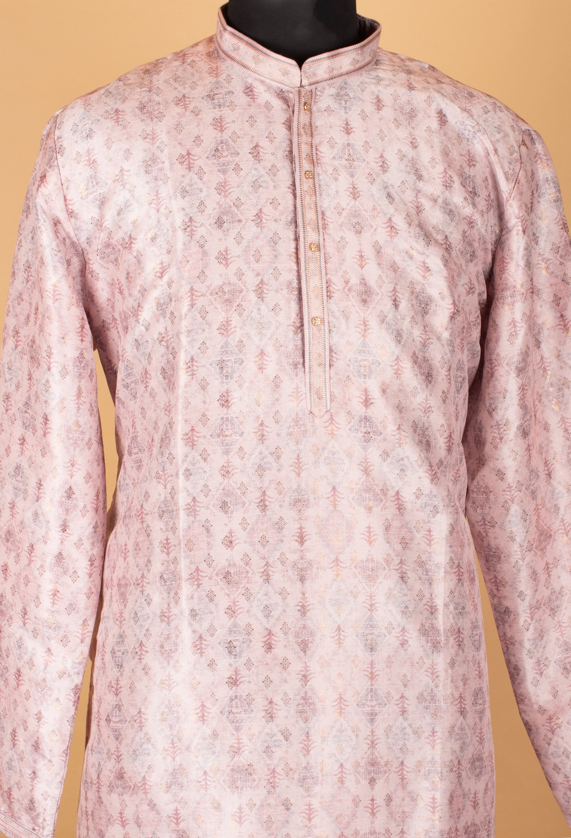 Elevate your ethnic style with this refined men’s blush pink kurta, crafted for effortless elegance and comfort. Featuring a subtle all-over traditional print with a soft sheen, this kurta offers a graceful and contemporary festive appeal while staying rooted in classic design.