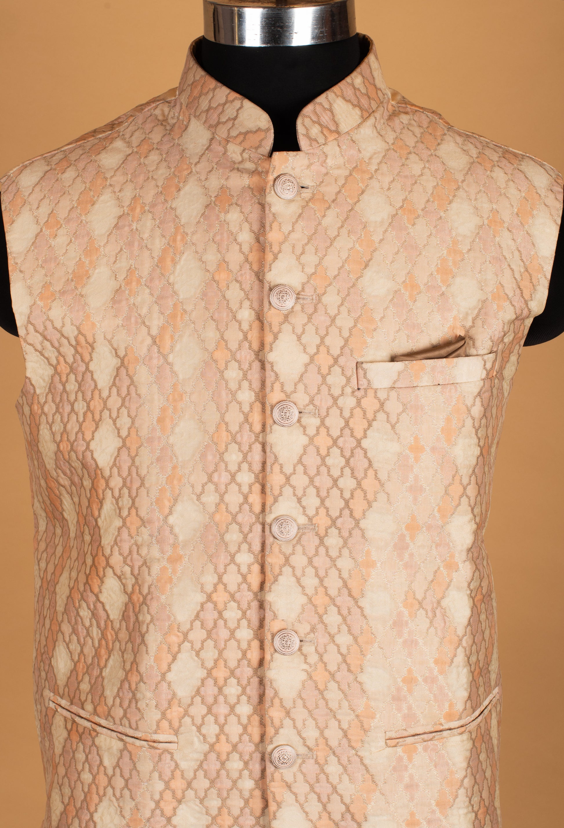 Elevate your ethnic wardrobe with this elegant peach and ivory textured Nehru jacket, crafted for effortless sophistication. Designed in a refined woven pattern, this sleeveless jacket features a subtle interplay of soft peach and ivory tones, creating a graceful, understated look. The classic mandarin collar, front button closure, and functional pockets lend a structured yet comfortable silhouette. Perfect for festive occasions and daytime celebrations, this Nehru jacket pairs seamlessly with kurtas or shirts for a polished ethnic ensemble.
