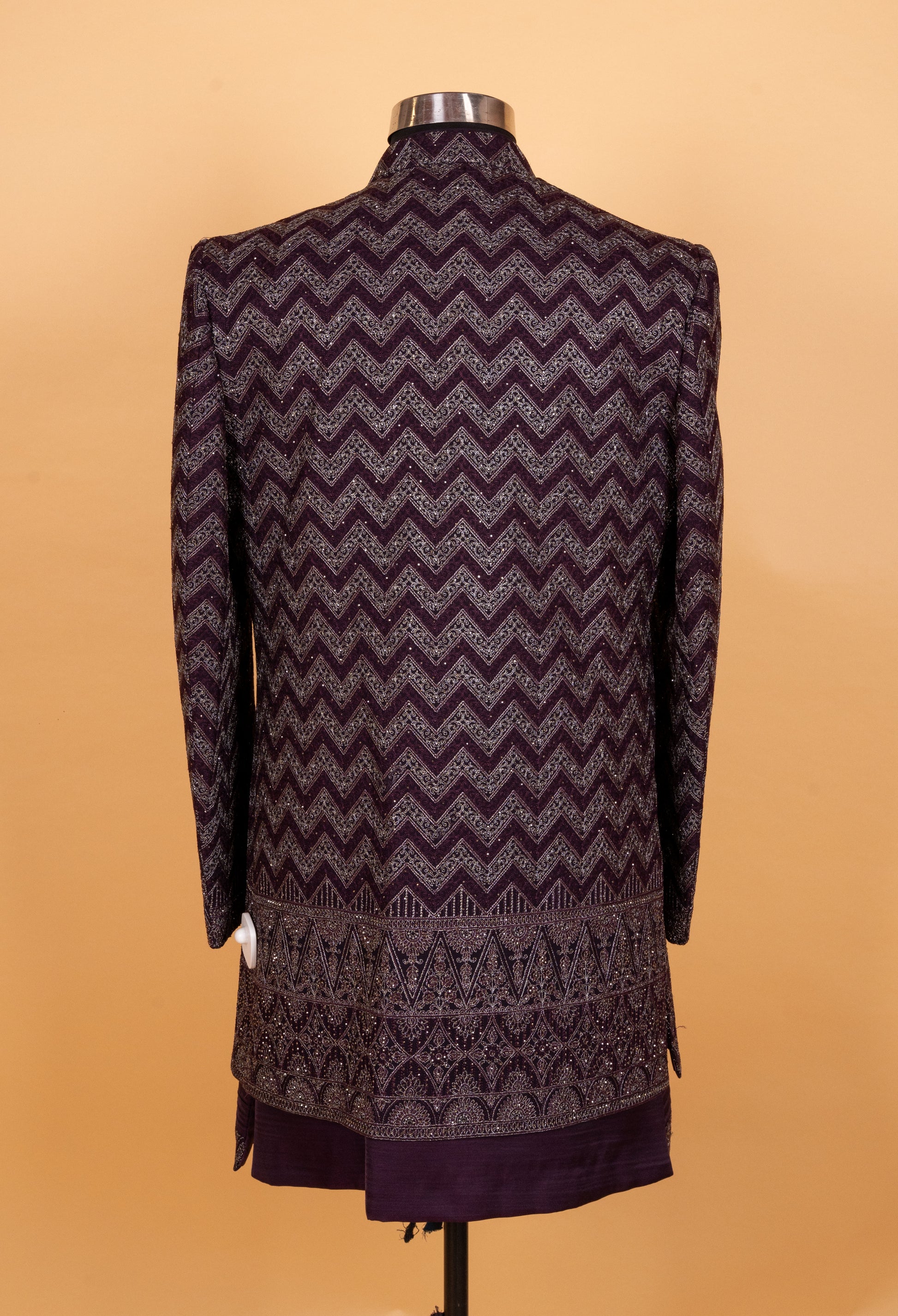 Make a commanding style statement with this luxurious plum Indo-Western sherwani set, designed for the modern man who appreciates heritage craftsmanship and contemporary elegance. Featuring an intricate zigzag woven embroidery pattern across the jacket, this ensemble blends regal sophistication with sharp tailoring.