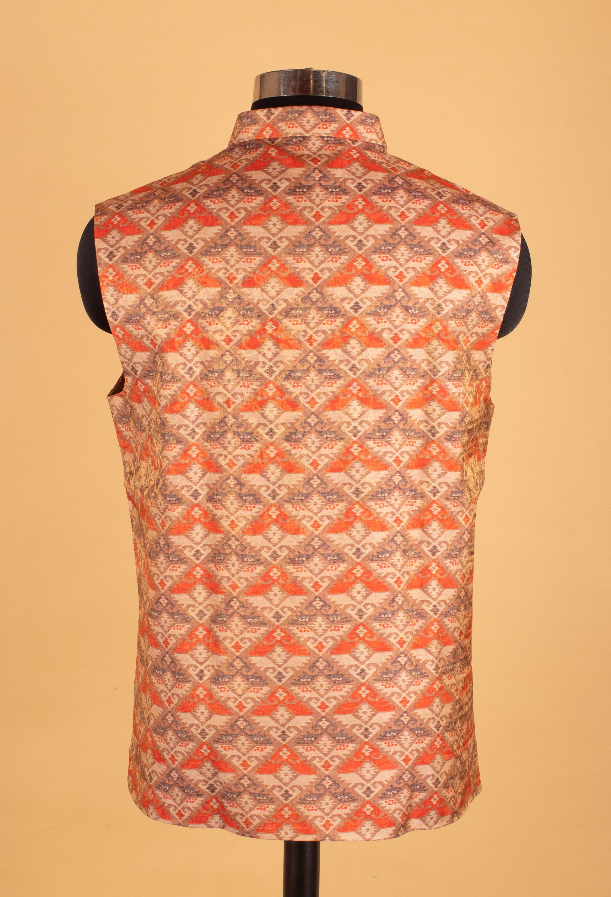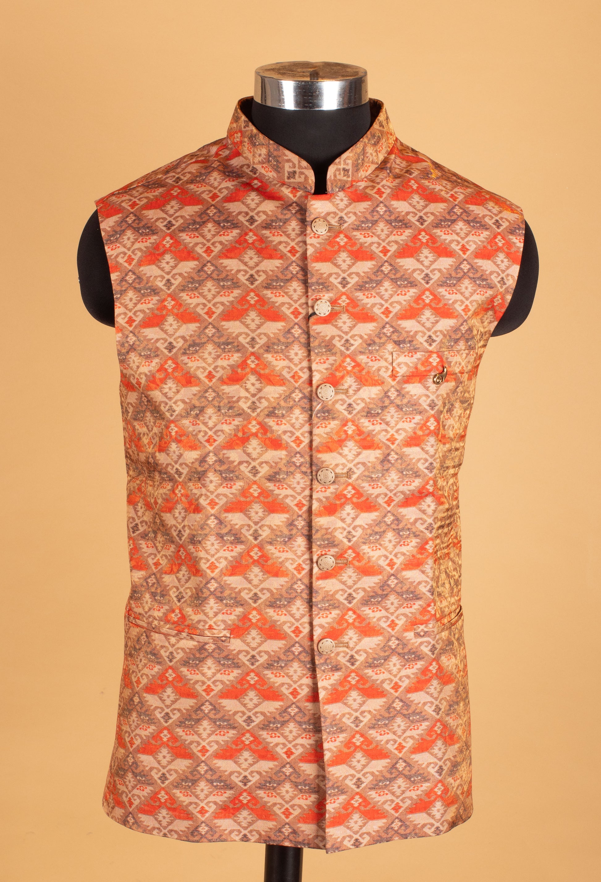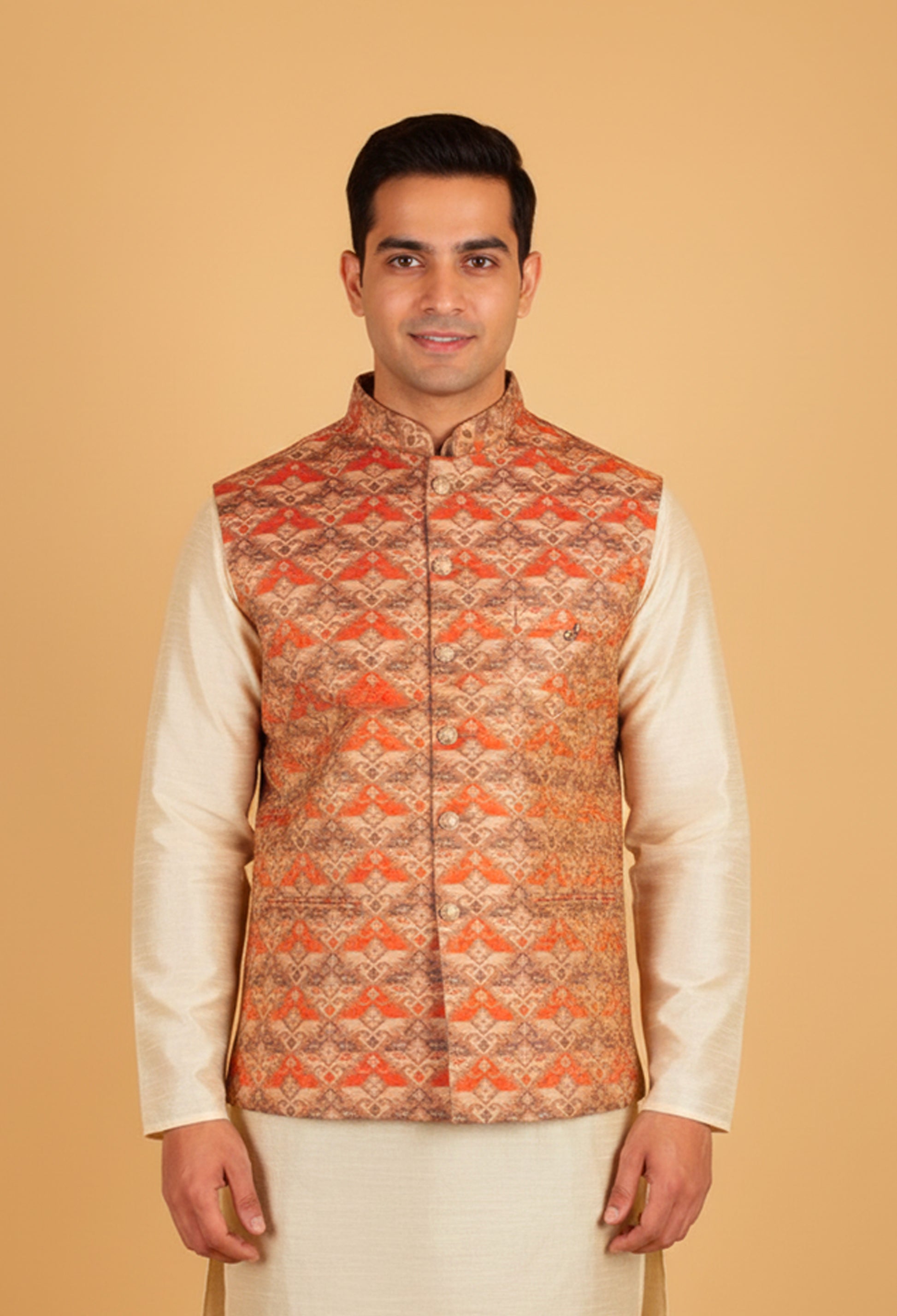 Make a bold ethnic style statement with this rust orange and beige printed Nehru jacket, designed to add vibrant character to your festive wardrobe. Crafted in a rich patterned fabric, the jacket features an intricate geometric-inspired print in warm earthy tones, offering a perfect blend of tradition and contemporary flair. Styled with a classic mandarin collar, front button closure, and functional pockets, this sleeveless Nehru jacket is ideal for festive gatherings, cultural events, and wedding functions. Pair it with a solid kurta for a balanced and refined ethnic look.
