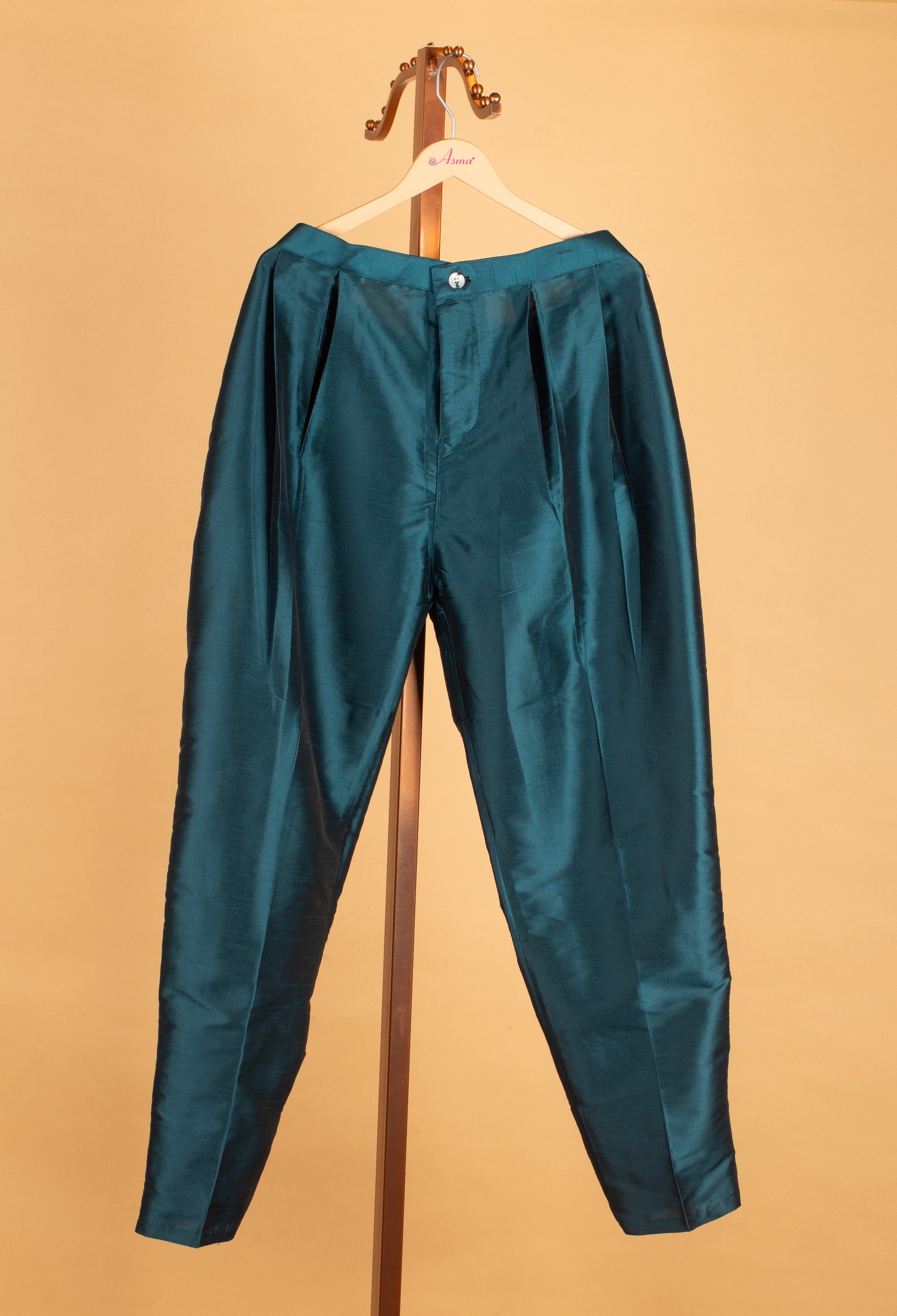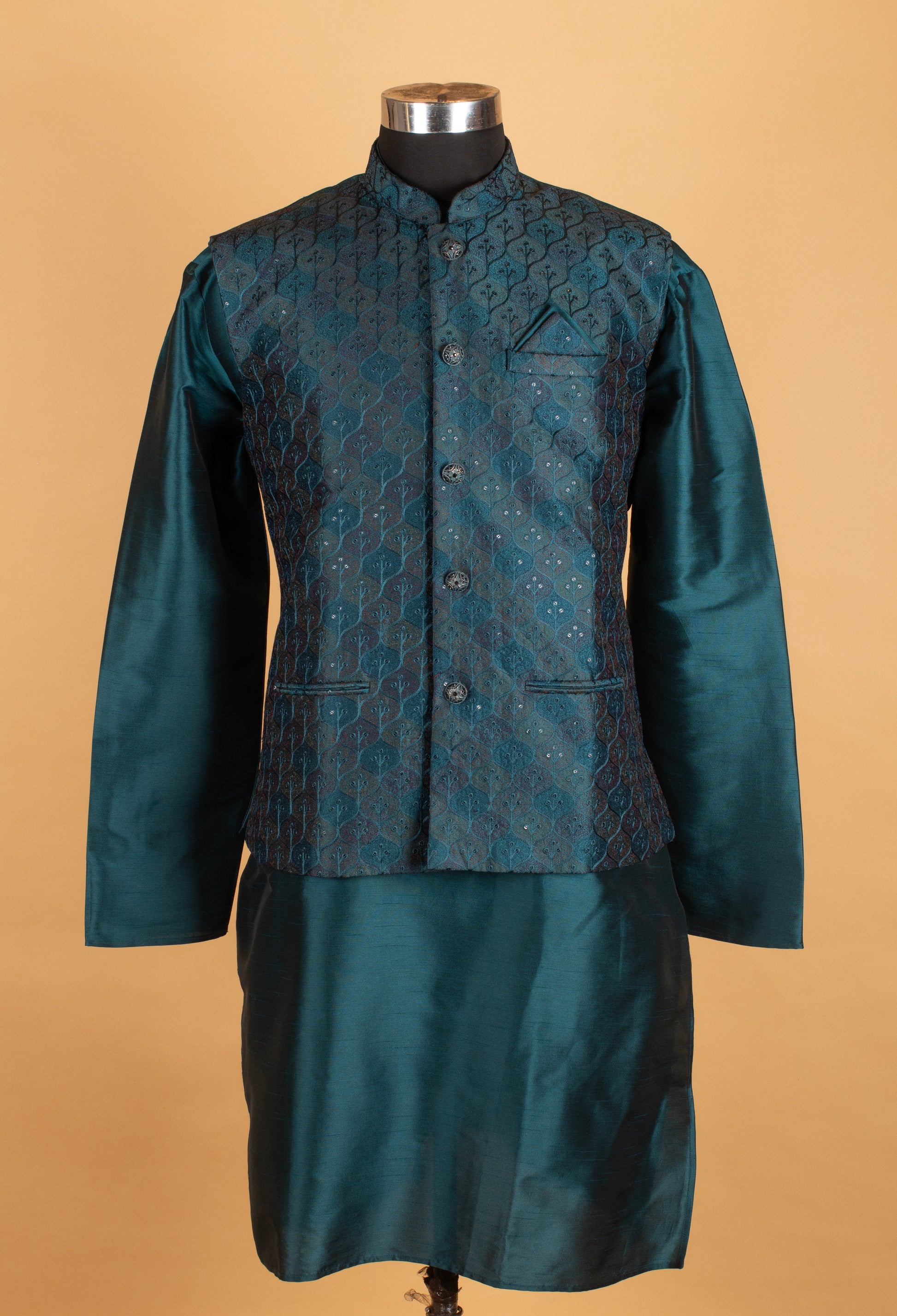 Add refined elegance to your festive wardrobe with this teal blue embroidered Nehru jacket kurta set, designed for modern men who appreciate traditional charm with a contemporary touch. The Nehru jacket features an intricately woven self-pattern with subtle embellishment, lending depth and texture to the design. Styled with a classic mandarin collar, front button closure, and functional pockets, it pairs seamlessly with a matching teal blue kurta crafted in a smooth, lustrous fabric. Ideal for festive gatherings and celebratory occasions, this ensemble offers both comfort and sophistication.