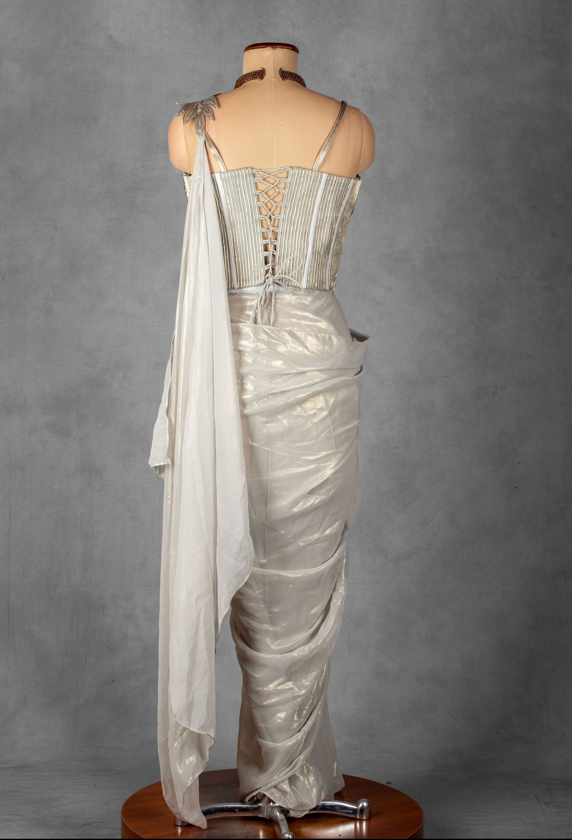 Command attention in this metallic ivory drape gown, a contemporary couture creation that merges art, form, and fluidity. The gown features a structured corset bodice, meticulously hand-embellished with metallic threadwork and three-dimensional sculpted leaf motifs, evoking a sense of organic elegance and architectural grace.