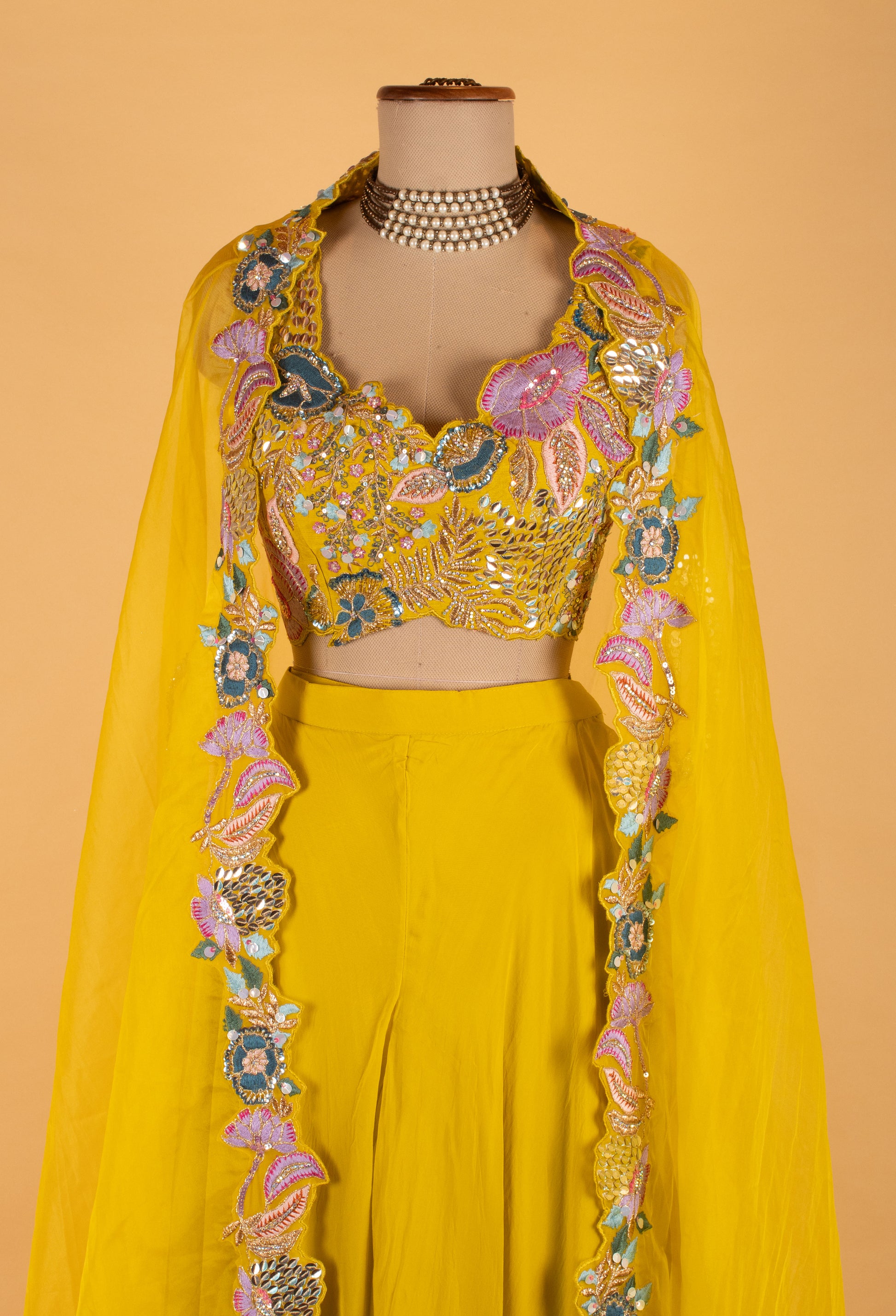 Step into festive elegance with this vibrant mustard yellow crop top sharara set, designed to make a bold yet graceful statement. The ensemble features a beautifully crafted embroidered crop top adorned with intricate multicolor floral threadwork, sequins, and delicate embellishments that add rich texture and visual appeal.