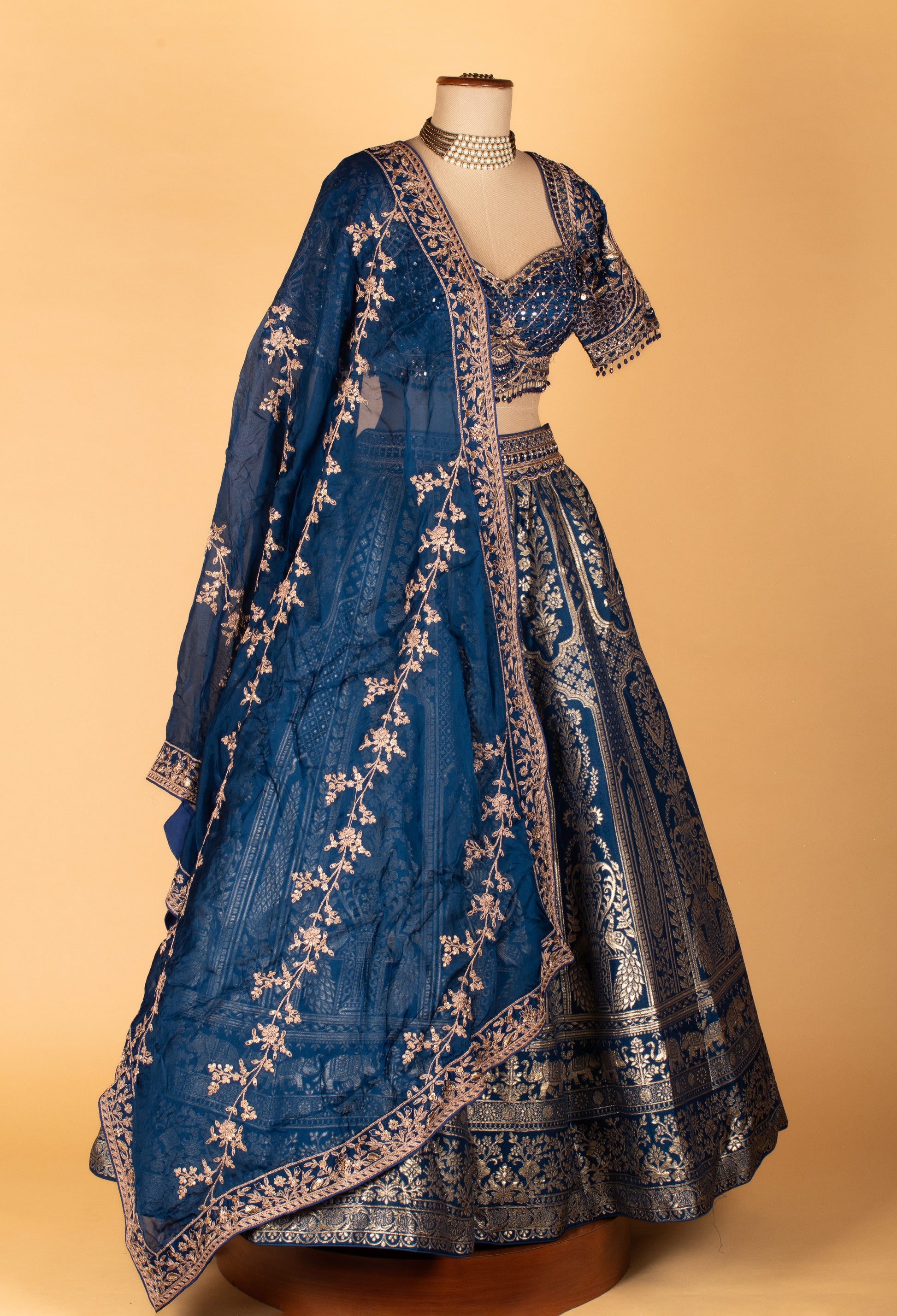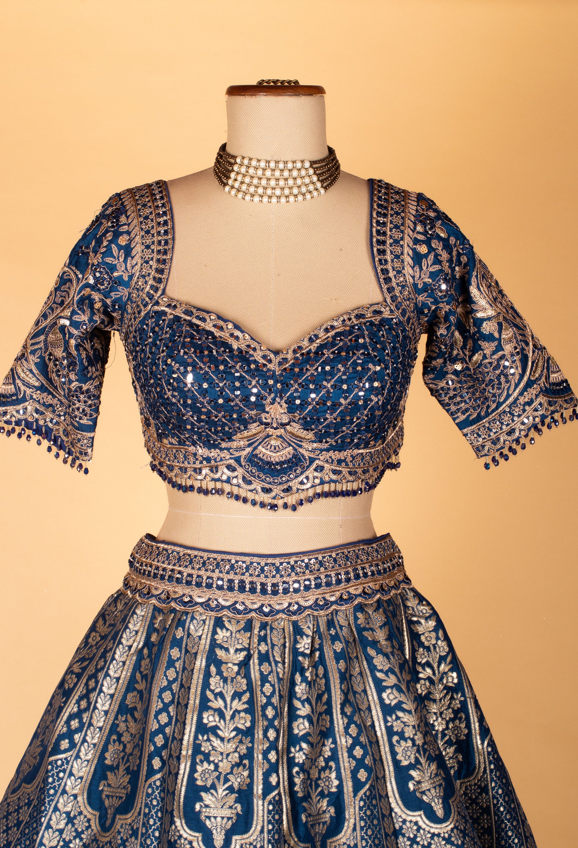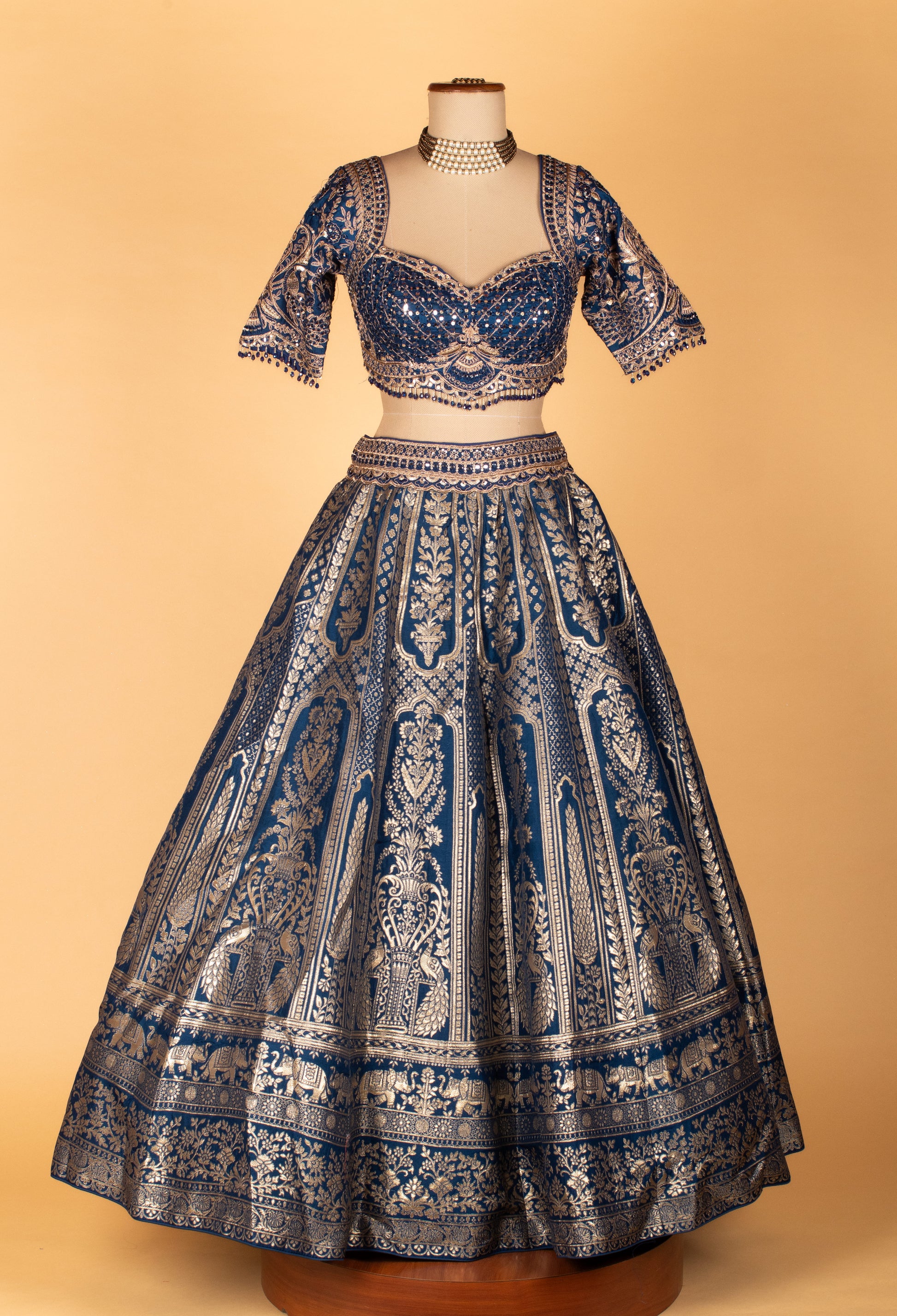 Steeped in heritage craftsmanship, this navy blue Banarasi lehenga set brings together the richness of traditional weaving and contemporary blouse styling. The lehenga features stunning gold zari brocade motifs, depicting architectural patterns, florals, and paisley frames inspired by royal textile art. The fabric carries a luxurious sheen, giving the skirt a majestic fall.