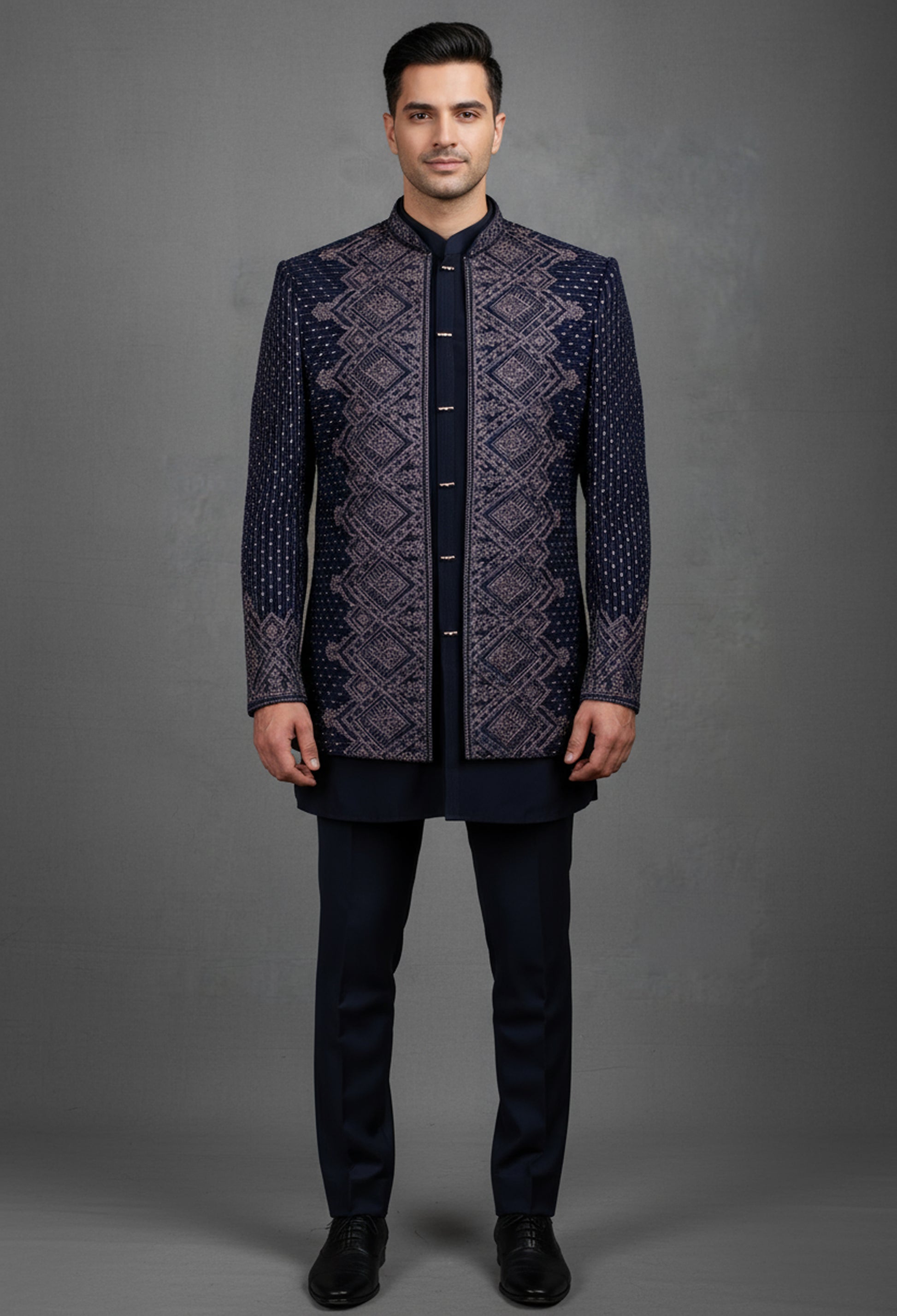Embrace regal sophistication with this Navy Blue Embroidered Indo-Western Jacket, a masterpiece that reflects impeccable craftsmanship and modern royal aesthetics. This ensemble is designed in rich textured fabric with intricate geometric embroidery done in metallic threads, creating a luxurious fusion of traditional artistry and contemporary elegance.