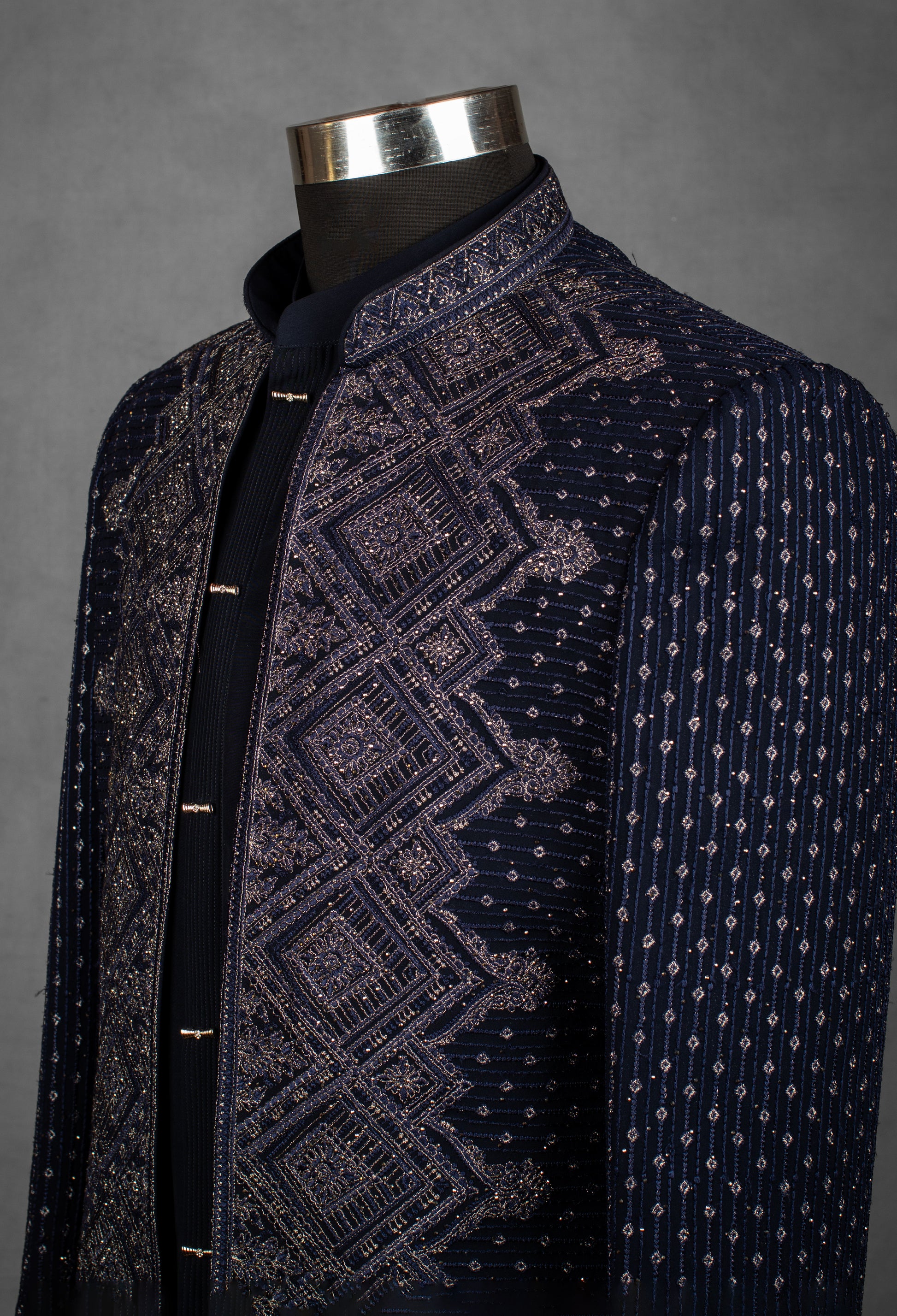 The deep navy base enhanced with shimmering gold and bronze threadwork gives it a grand, refined appearance, perfect for weddings, receptions, and festive celebrations. The structured silhouette and mandarin collar exude elegance, while the detailed embroidery adds depth and drama to the overall look.