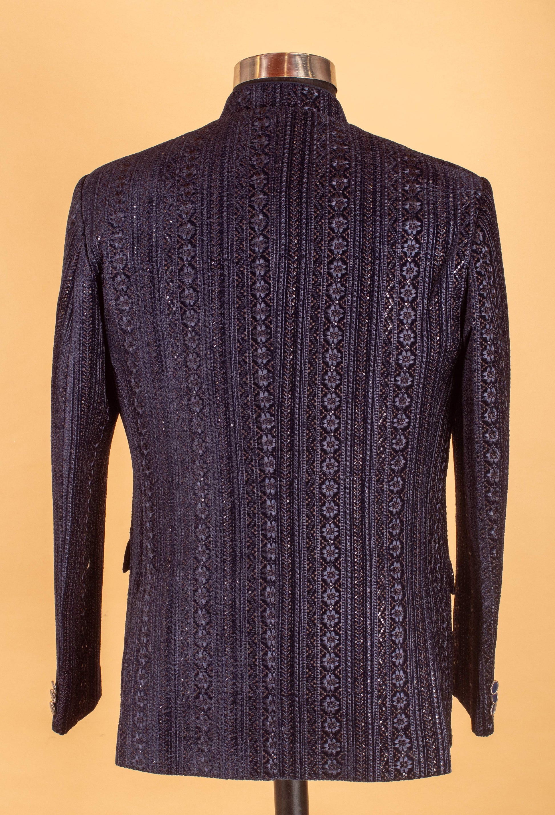Crafted for royal celebrations, this navy blue embroidered Indo-Western suit radiates sophistication and cultural richness. The luxurious textured fabric features intricate detailing that shines subtly under light, making it an elegant choice for evening festivities.