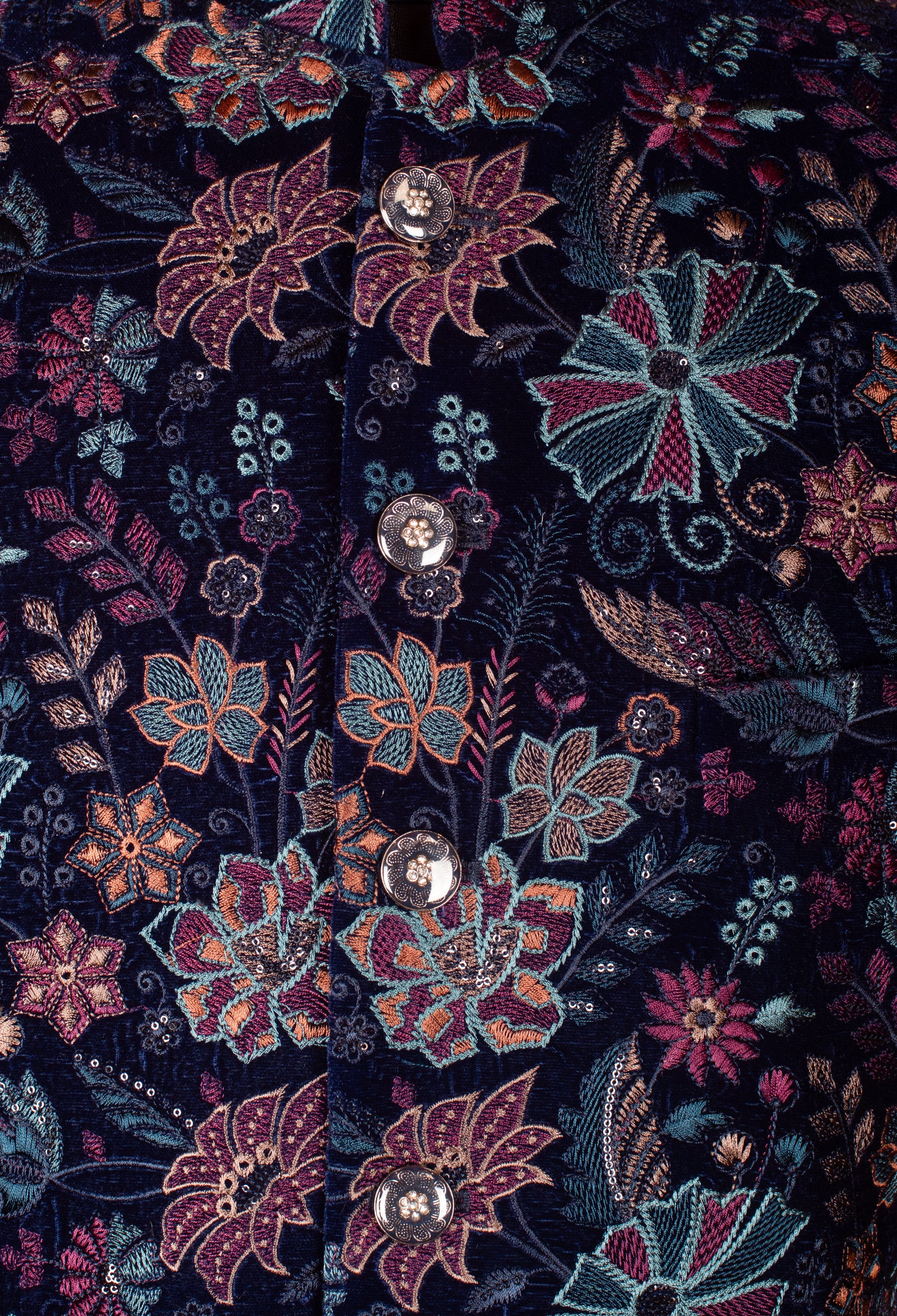 Make a bold and sophisticated statement with this navy blue floral embroidered Indo-Western jacket, designed for men who appreciate contemporary fashion blended with traditional artistry. Crafted in luxurious velvet fabric, the jacket features intricate multicolor floral embroidery that elevates its richness and visual appeal.