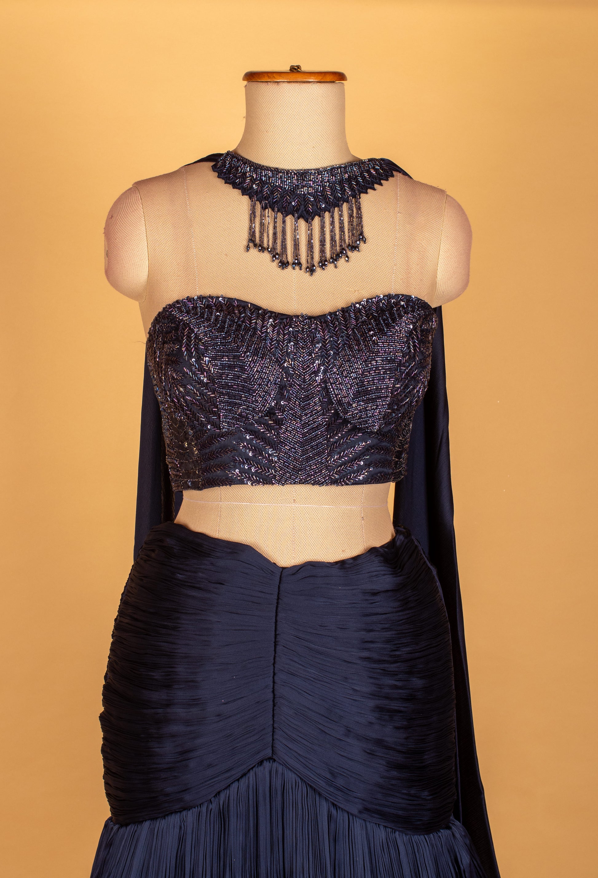 Step into contemporary elegance with this stunning navy blue lehenga set, featuring a fully sequinned croptop paired with a beautifully pleated flowy skirt. The shimmering bead-work on the blouse adds a bold touch, while the sleek pleated lehenga brings graceful movement and modern sophistication. A matching draped dupatta adds structure and completes the chic Indo-western look.
