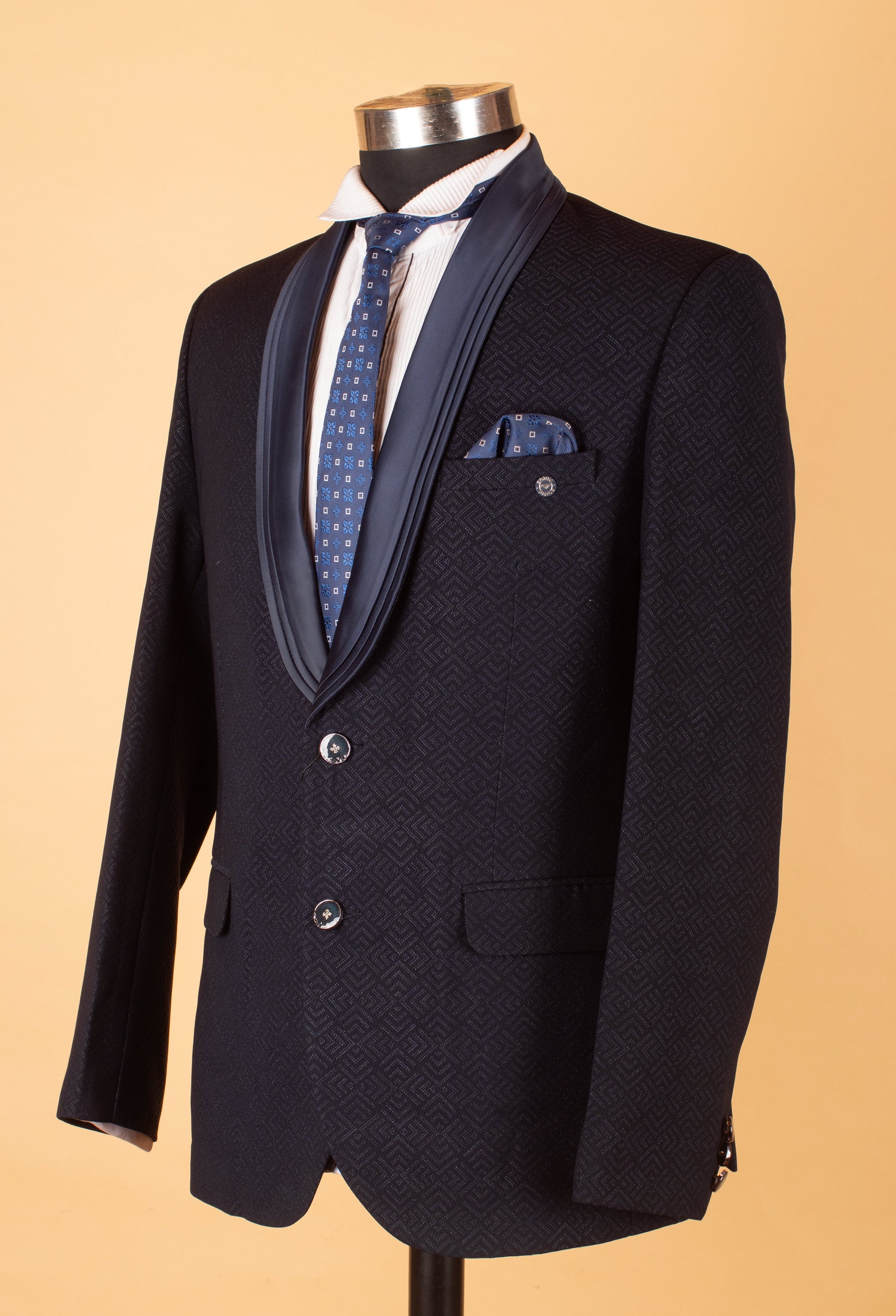 Step into refined sophistication with this navy blue textured tuxedo blazer — a timeless classic for men who dress to impress. Featuring a rich geometric texture and a smooth satin shawl lapel, this blazer delivers a stunning contrast and a luxurious finish.