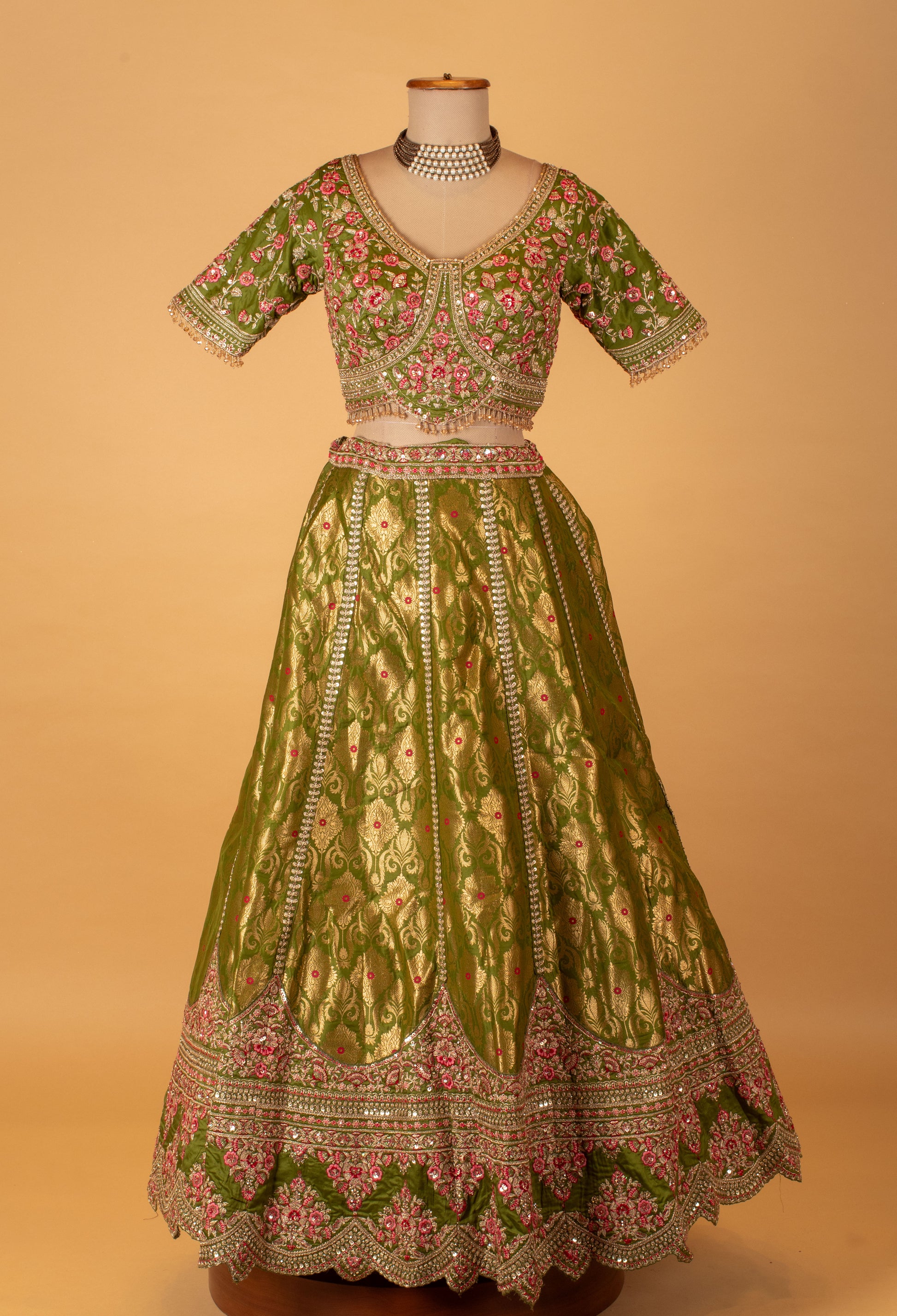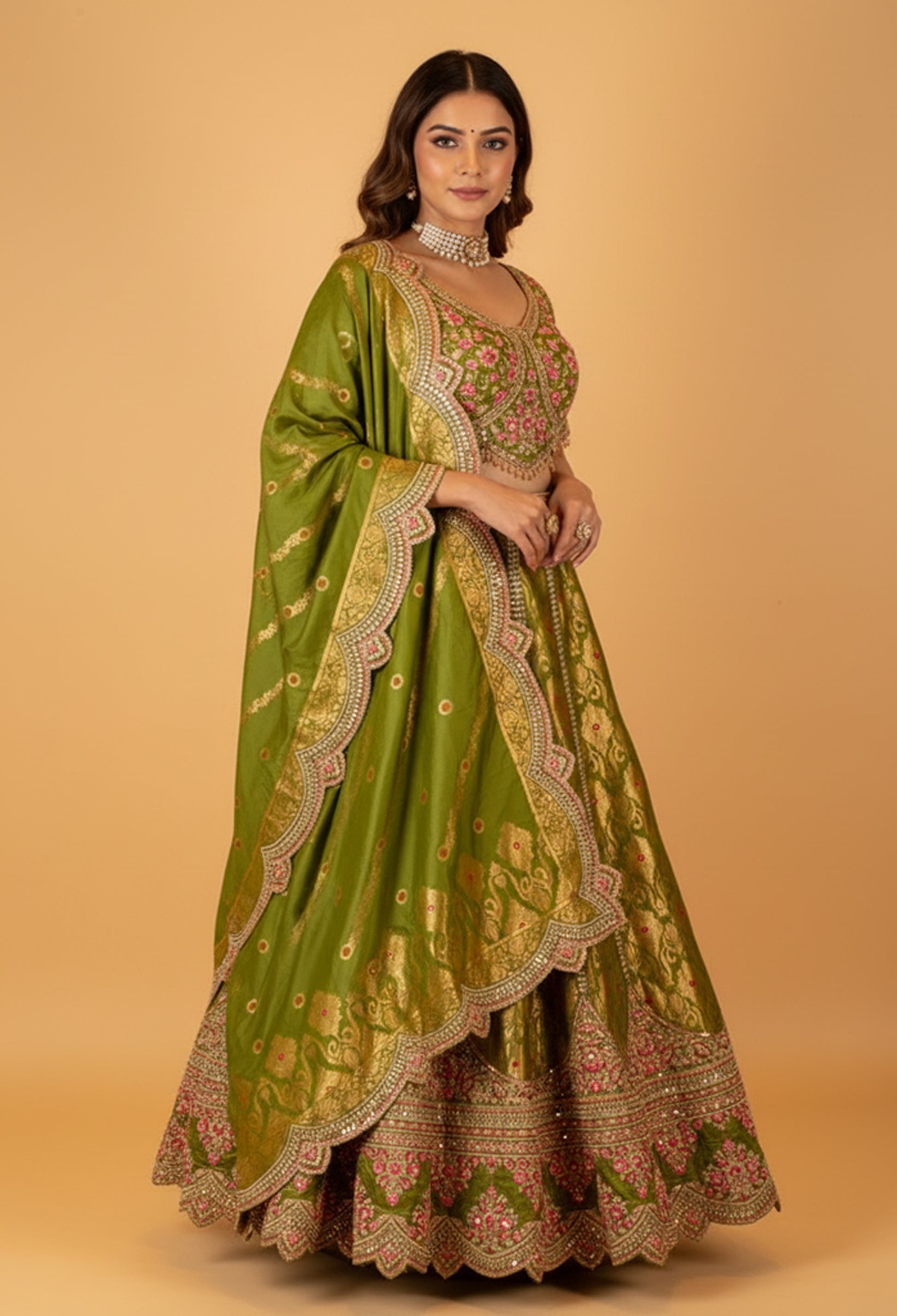Celebrate timeless elegance with this stunning olive green embroidered crop top lehenga set, crafted to make a graceful statement at weddings and festive occasions. The beautifully designed crop top features intricate floral embroidery enhanced with zari, thread, and subtle embellishments, offering a refined traditional charm with a modern silhouette.
