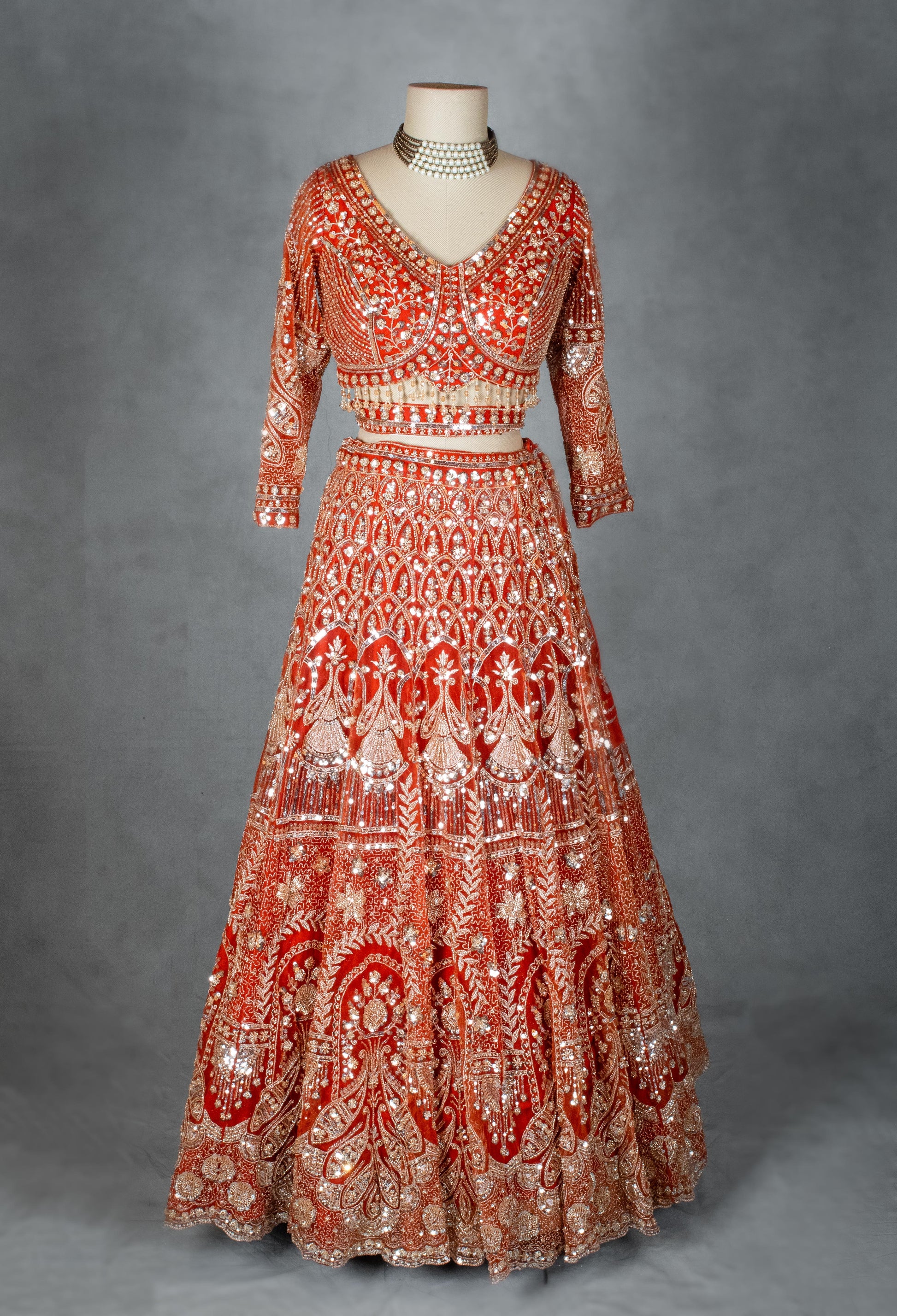 The lehenga skirt features a regal flared silhouette adorned with heavy floral, paisley, and temple-inspired motifs. The matching blouse is crafted with a flattering V-neckline, structured embroidery, and full-length sleeves that echo richness. The set is completed with a sheer orange dupatta embellished with fine mirror work and a delicate embroidered border, making it a perfect choice for bridal ceremonies, receptions, or sangeet nights.