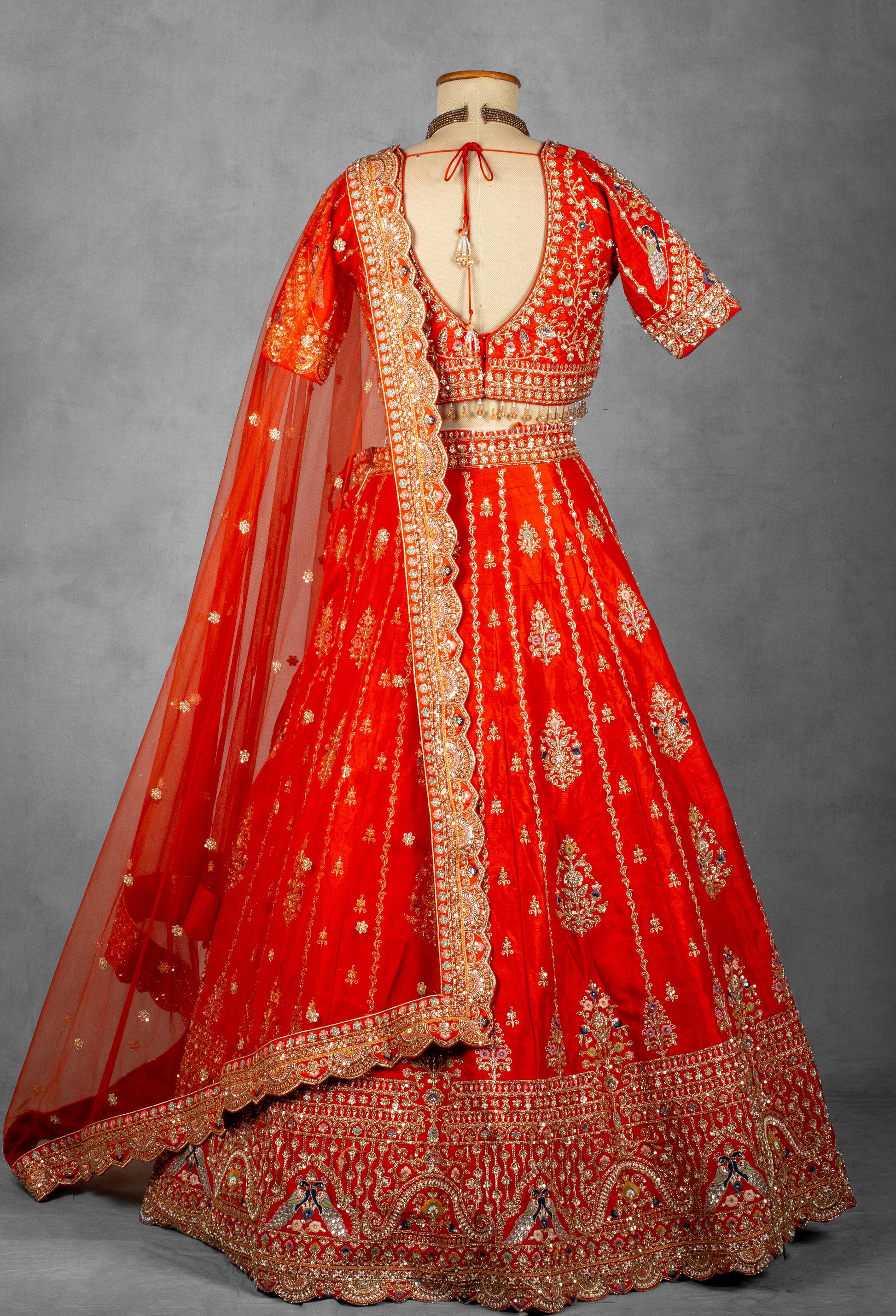 The voluminous lehenga skirt is adorned with exquisite hand embroidery and regal motifs, accentuating its rich texture and grandeur. The radiant orange-red hue symbolizes festivity, passion, and timeless beauty, making it a perfect choice for wedding ceremonies and grand celebrations.
