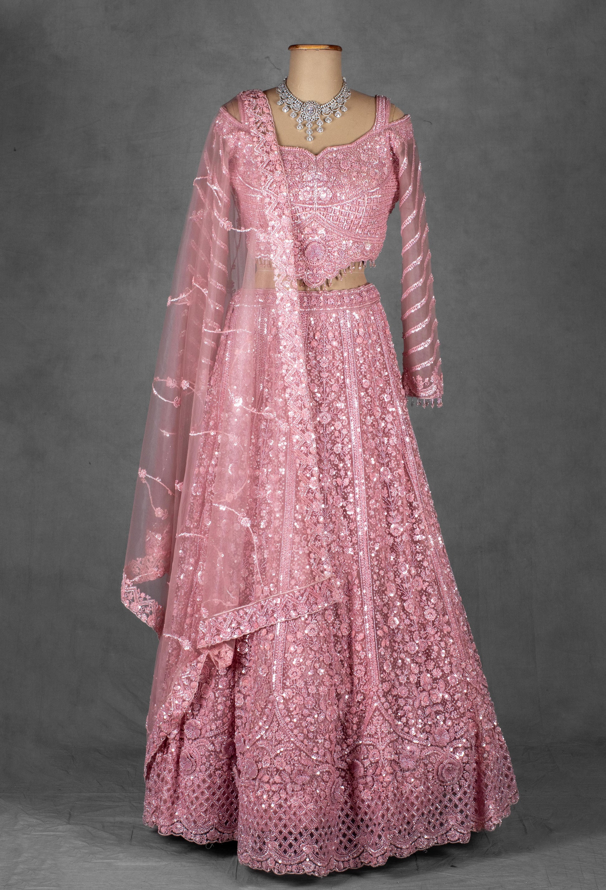 Turn heads with this show-stopping Rose Pink Lehenga Set, intricately crafted for the modern bride or fashion-forward wedding guest. The set features a cold-shoulder crop top with full sheer sleeves, delicately embellished with sequins, zari, and mirror work. The sweetheart neckline adds femininity, while the fitted silhouette creates a striking shape.