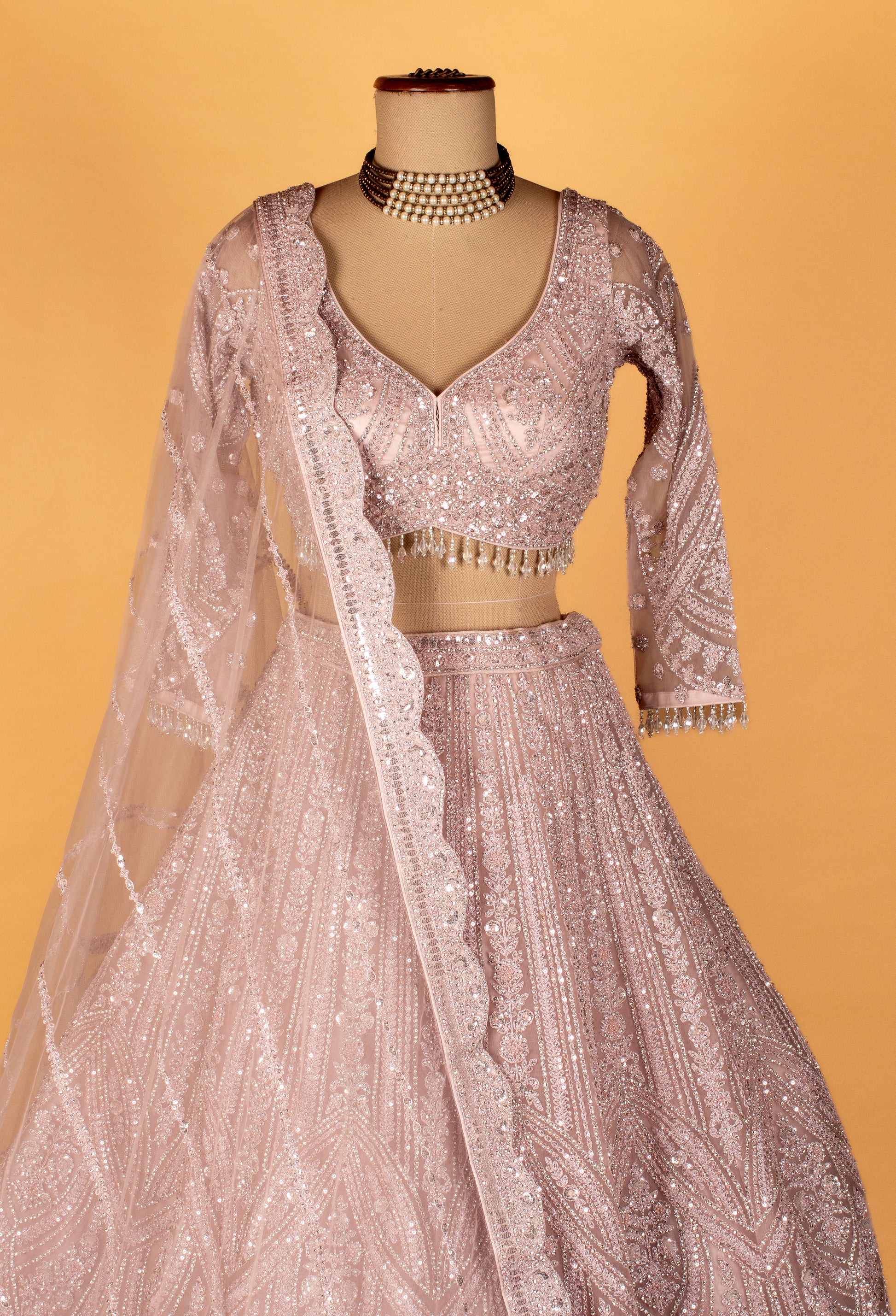 Paired with a soft net dupatta highlighted with scalloped embroidery and matching motifs, this outfit creates a dreamy, ethereal look ideal for receptions, engagement ceremonies, and luxury events.