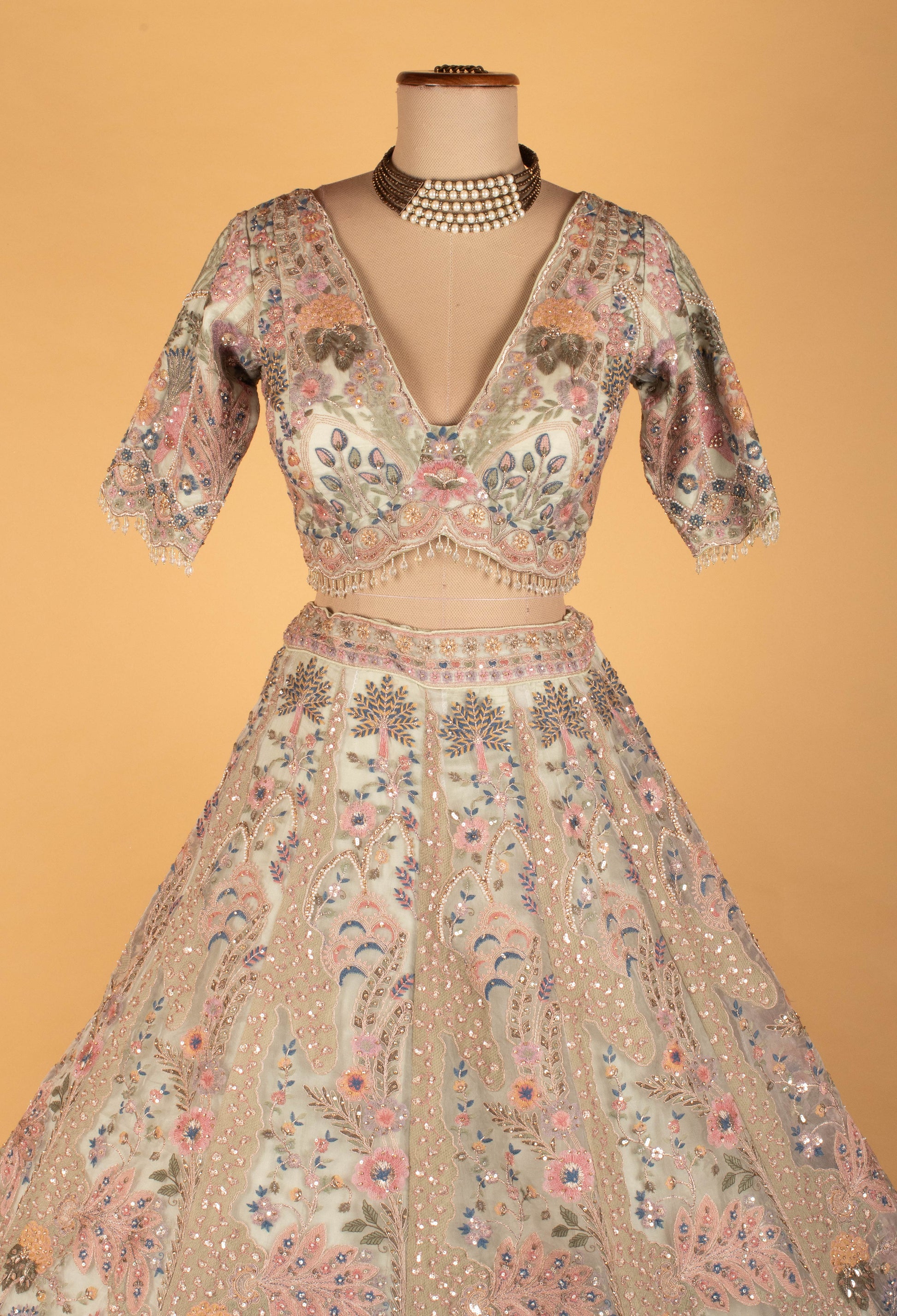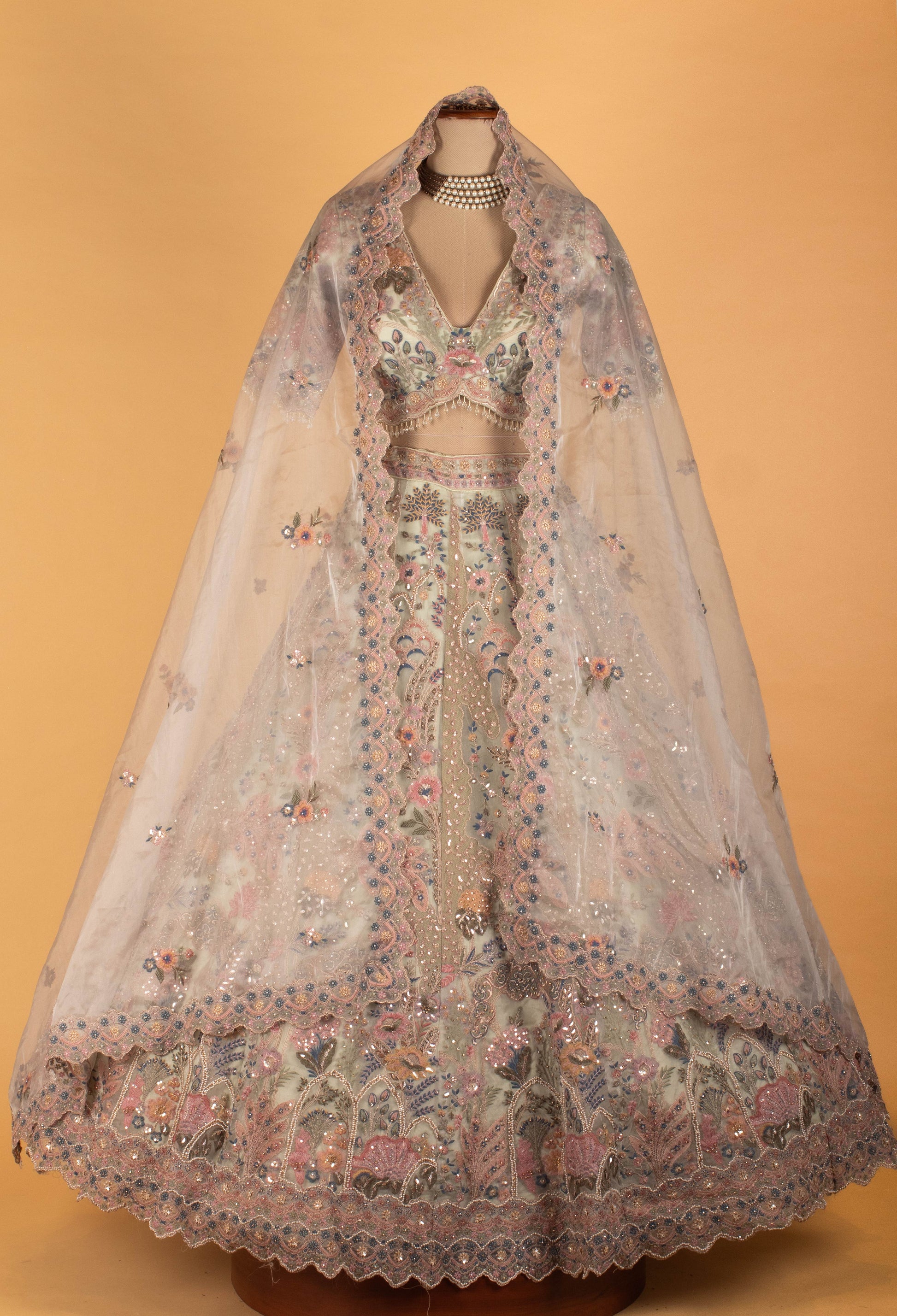Indulge in dreamy elegance with this breathtaking Pastel Multi-Color Bridal Lehenga Set — a true masterpiece of intricate artistry and couture craftsmanship. The lehenga and blouse feature exquisite floral embroidery, beadwork, and sparkling sequin detailing arranged in enchanting patterns inspired by nature.