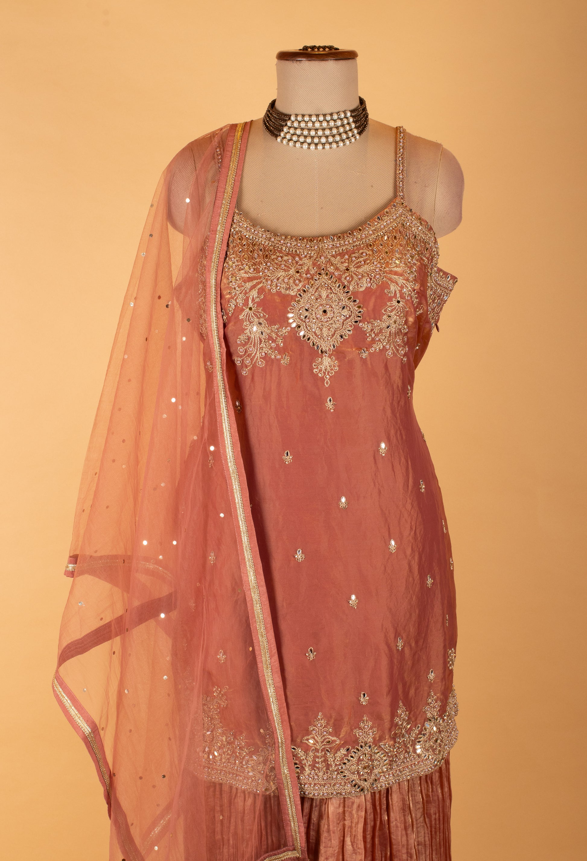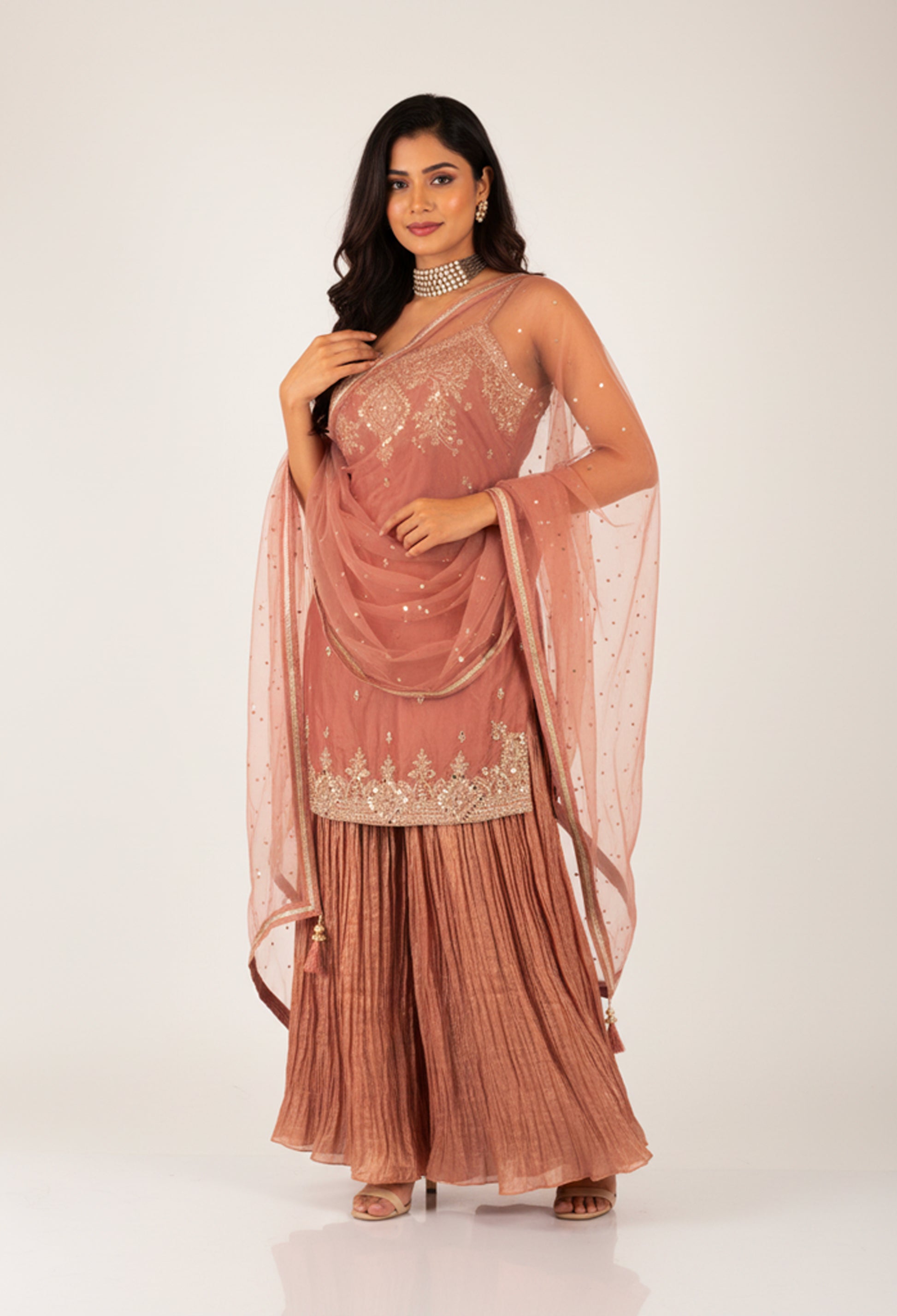 Paired with flowy sharara pants that add movement and comfort, the look is completed with a soft net dupatta embellished with subtle sequin accents and decorative tassels. Ideal for weddings, festive celebrations, and evening occasions, this suit set blends traditional craftsmanship with contemporary styling.