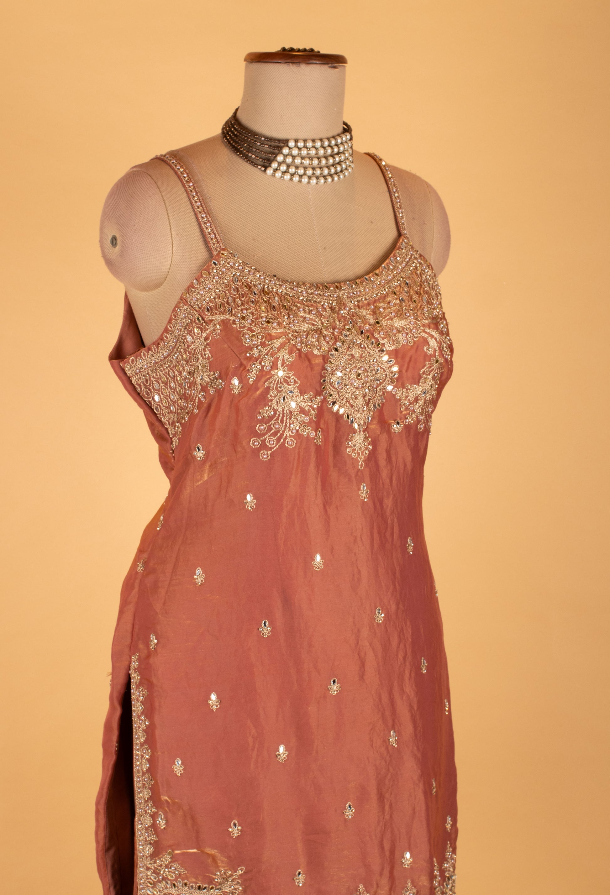Add graceful elegance to your festive wardrobe with this beautifully crafted peach straight-cut suit set. The ensemble features a finely embroidered straight-cut kurta adorned with delicate zari, sequin, and thread work that enhances its refined ethnic appeal. Designed with slim shoulder straps and a clean straight silhouette, the kurta offers a flattering, modern finish.