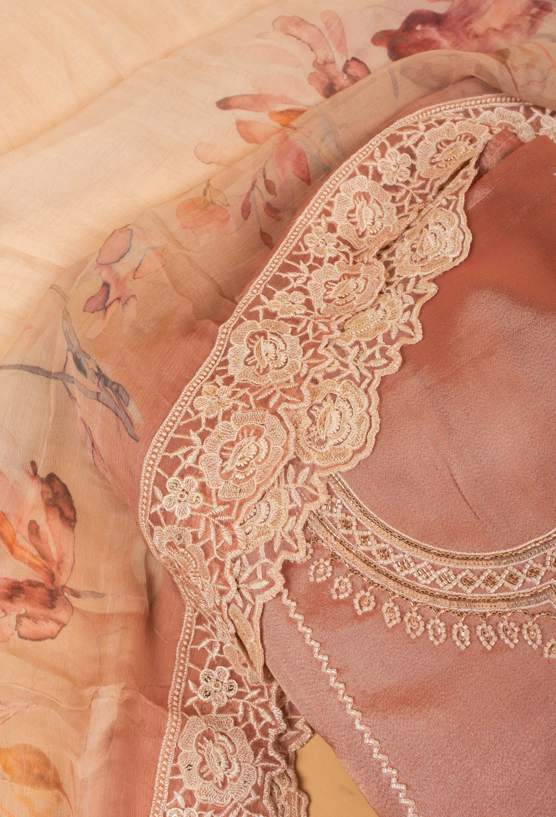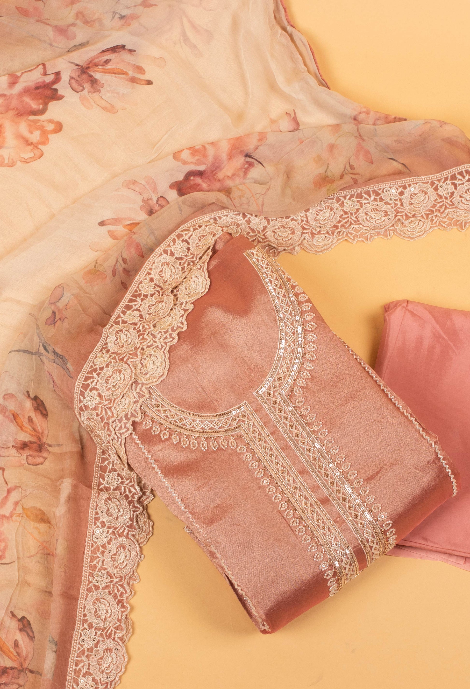 Step into effortless elegance with this refined Peach Floral Embroidered Unstitched Dress Material, crafted for soft feminine charm. The top fabric features a graceful peach tone highlighted with intricate thread embroidery along the neckline and front panel, creating a delicate yet luxurious look. The coordinated dupatta showcases a beautiful floral print with an elegant lace border, adding a romantic and airy appeal. Paired with a solid matching bottom fabric, this dress material is ideal for creating a custom salwar suit perfect for festive gatherings, daytime celebrations, and elegant occasions.