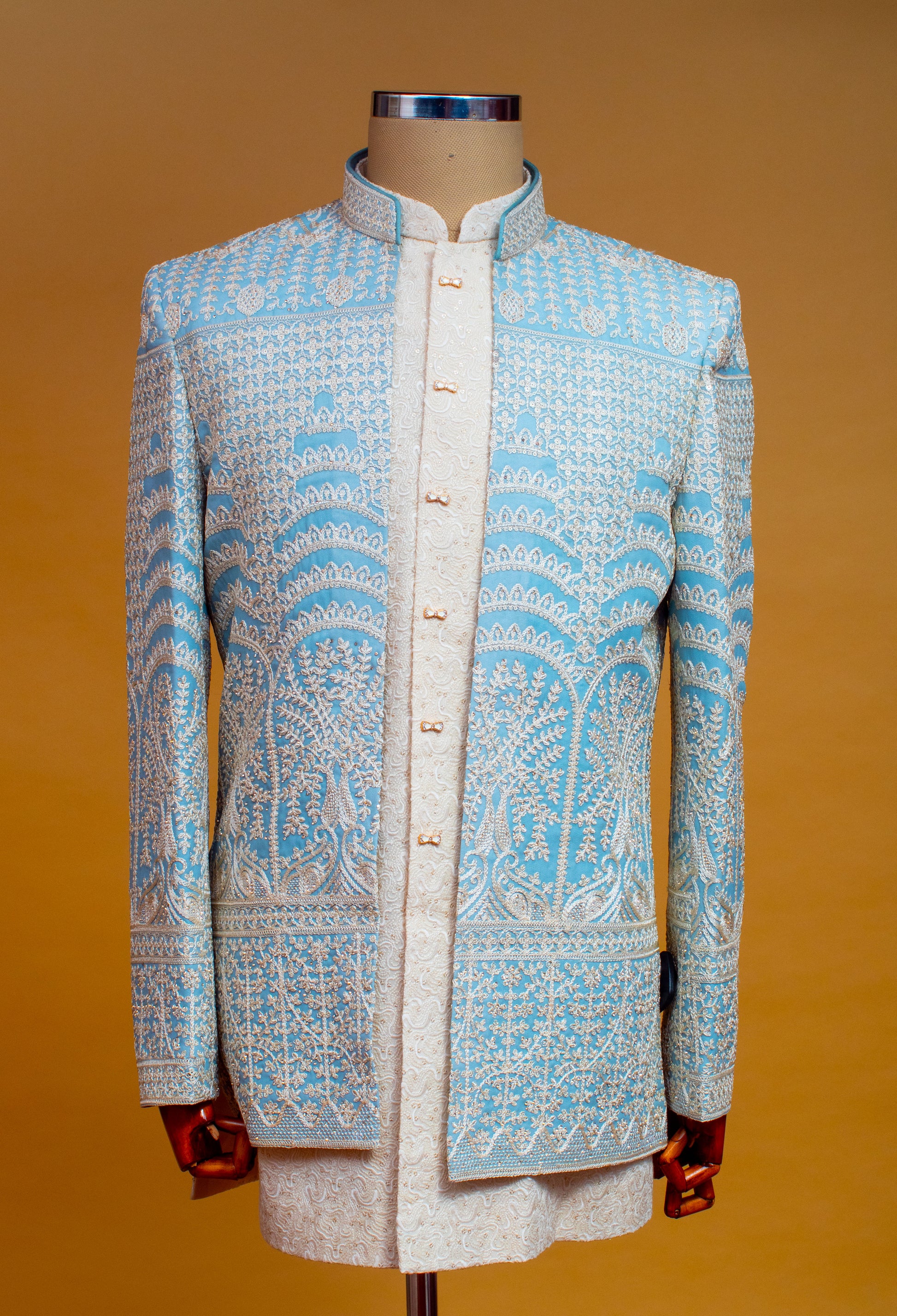 Tailored from premium jacquard silk fabric, this sherwani features intricate self-embroidered floral and geometric motifs that elevate its regal charm. The structured silhouette, band collar, and ornate buttons add refined detail, making it a standout choice for special occasions.