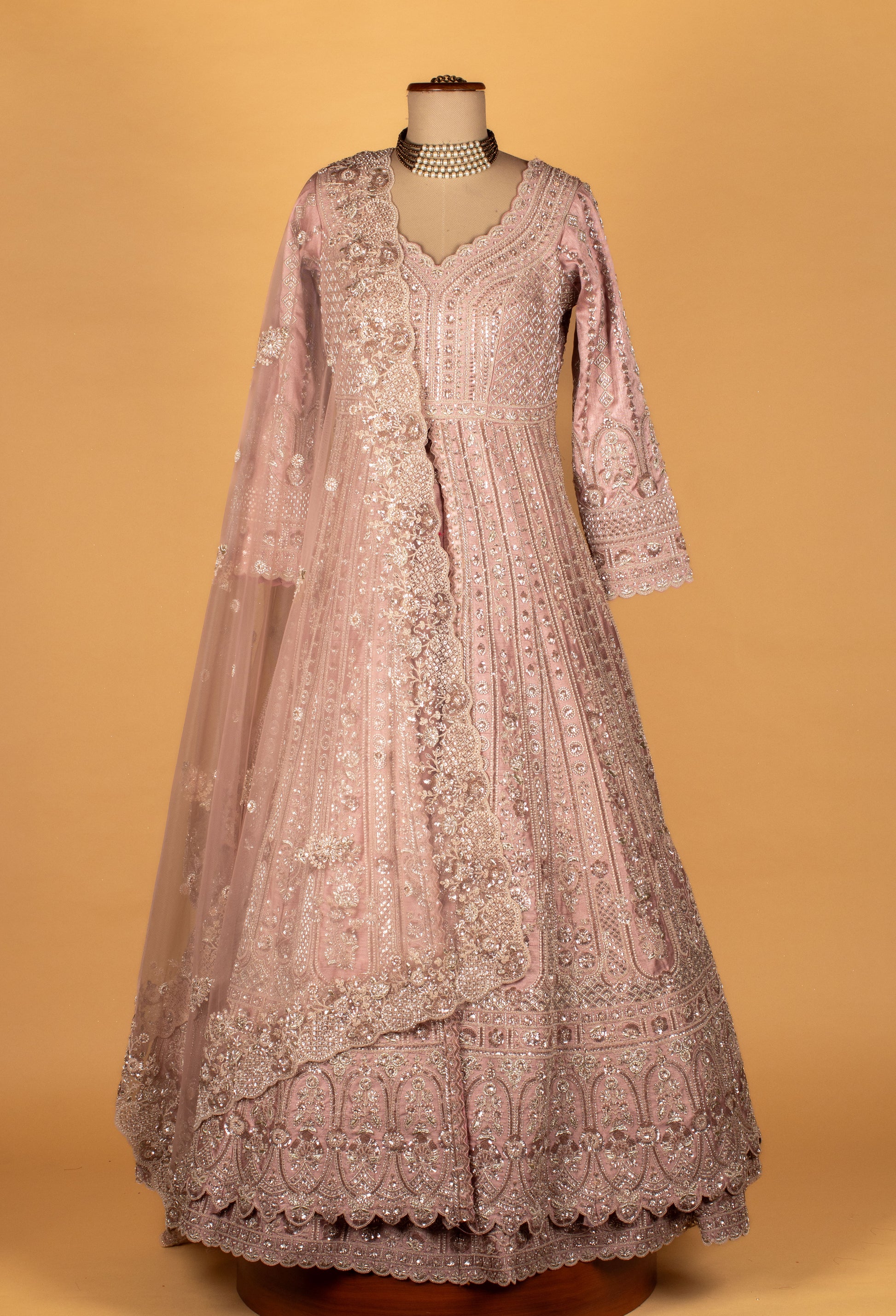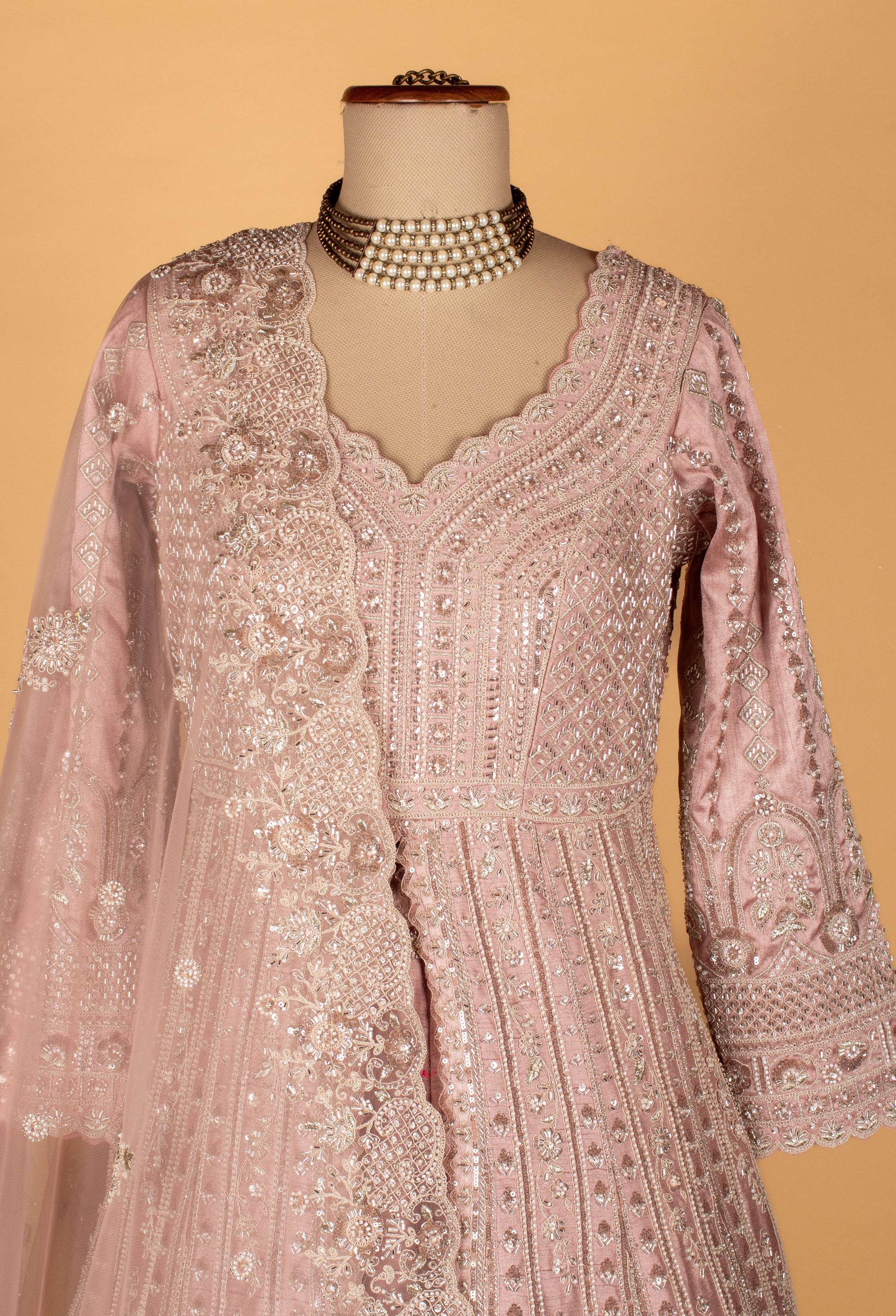 Make an unforgettable statement with this stunning powder pink Anarkali gown, crafted to perfection for luxury occasions and wedding functions. This design features a flattering V-neckline and full sleeves, adorned with meticulous hand embroidery using sequins, beads, pearls, and zari detailing.