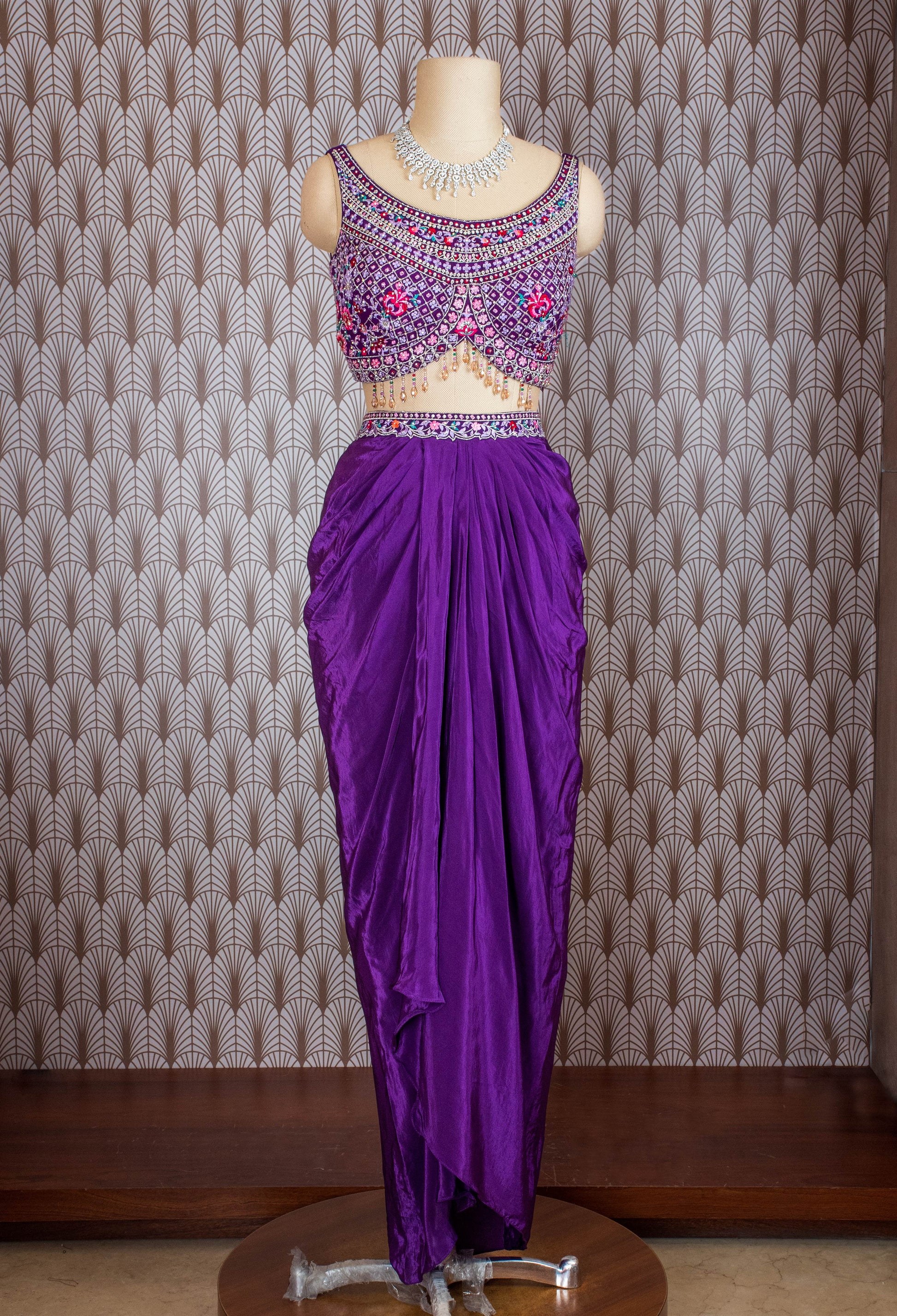 Turn heads at every celebration with this Purple Indo-Western Lehenga Set, a stunning fusion of traditional embroidery and contemporary silhouette. The outfit features a heavily embroidered sleeveless blouse with intricate mirror work, thread embroidery, and hanging bead embellishments, offering a festive sparkle with a modern edge.